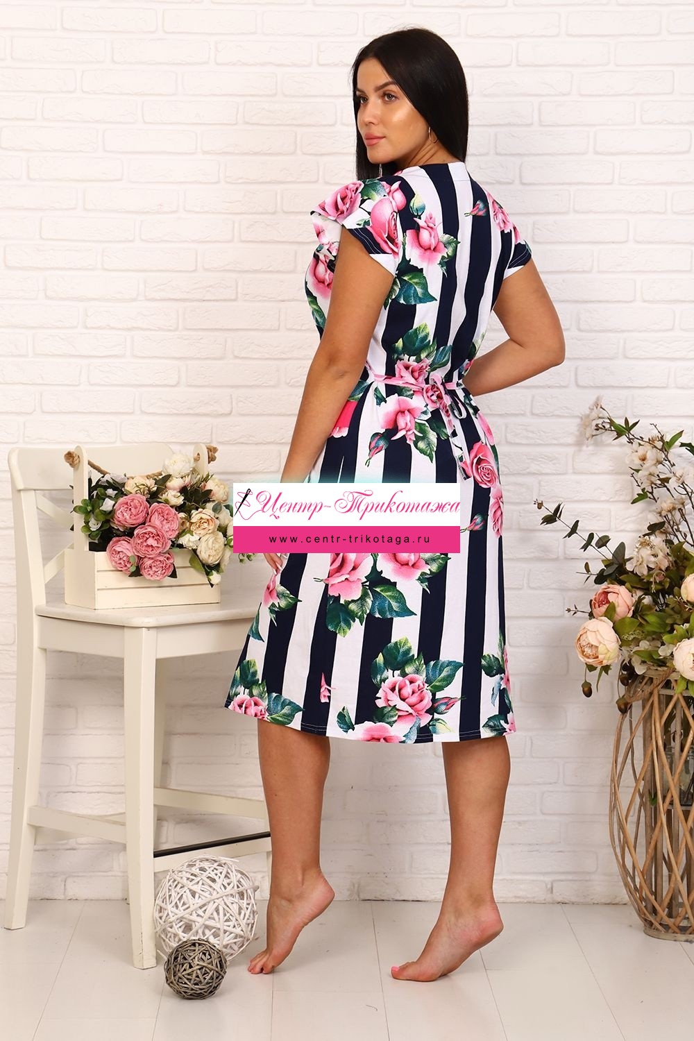 Оригинальный женский халат с красивым принтом на ткани в виде полос и роз. Рукав короткий в форме крылышка, отложной треугольный воротник. Застежка-молния, длина ниже колена.
