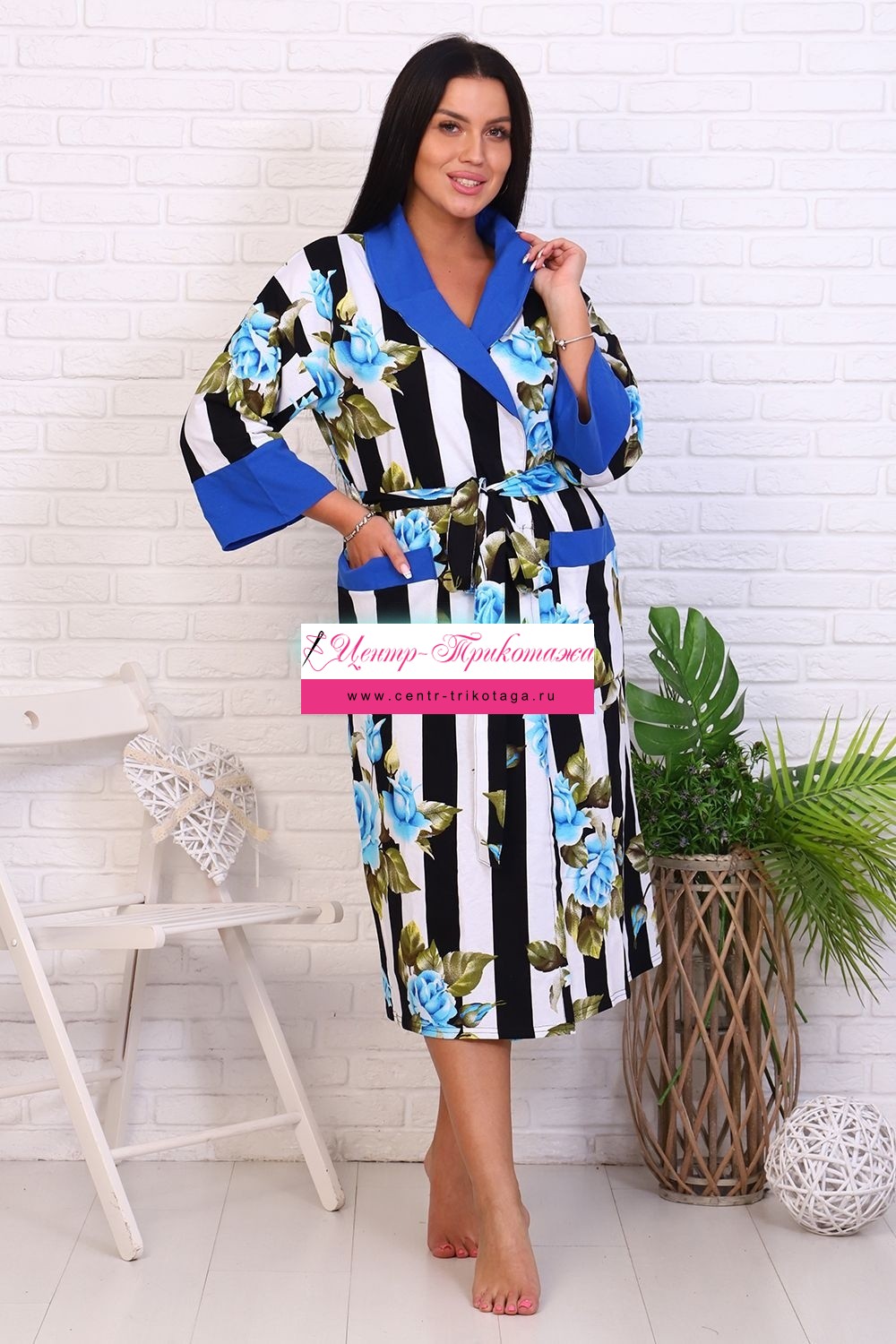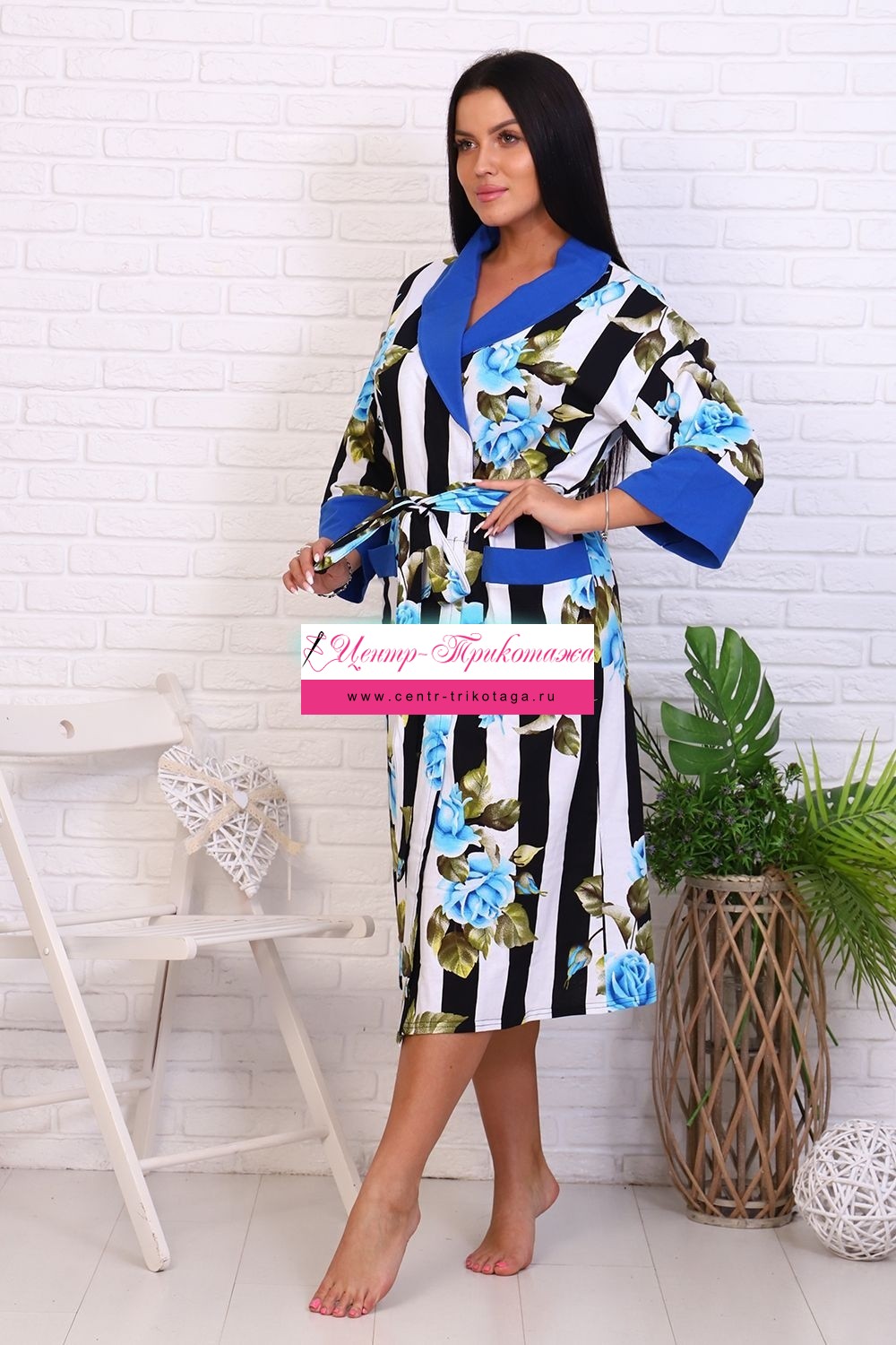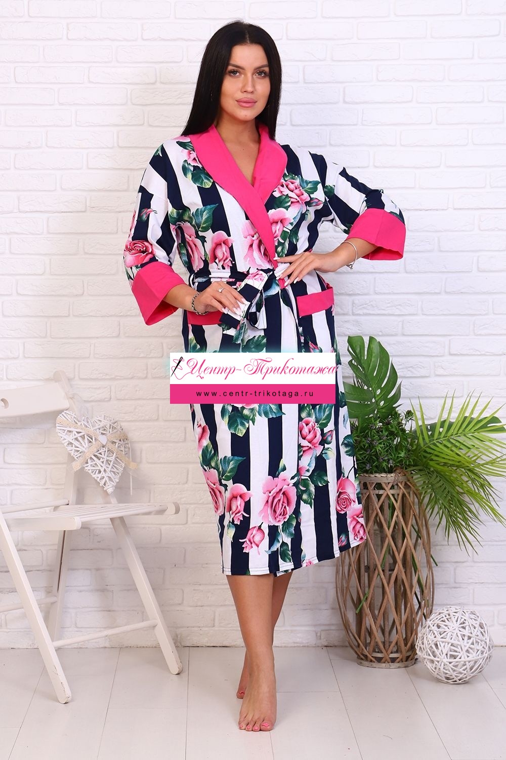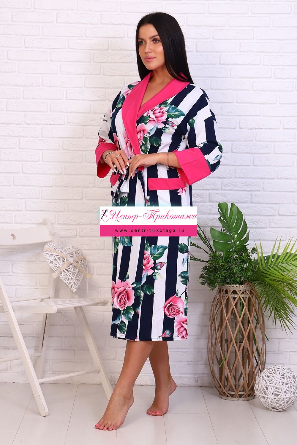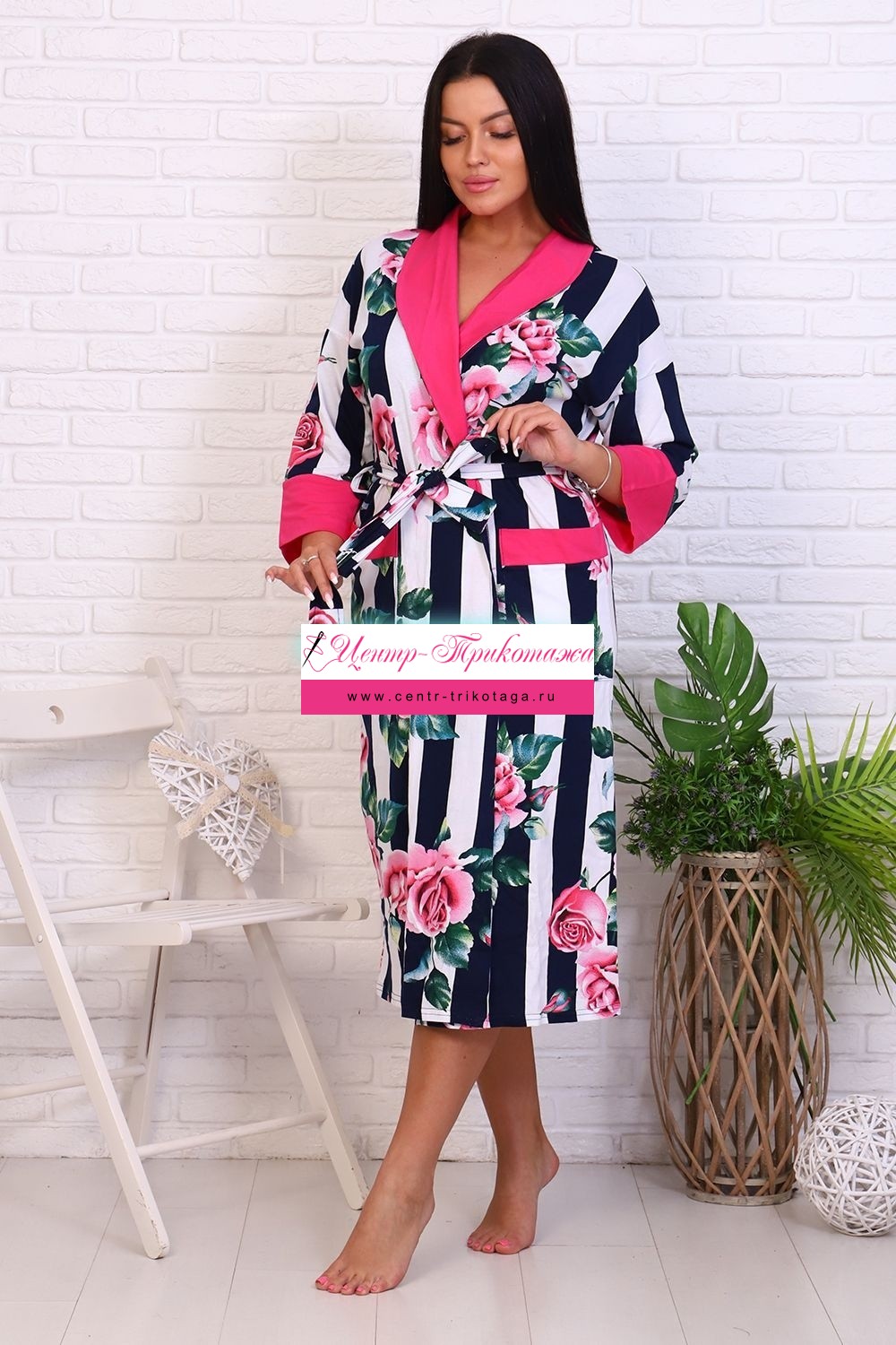Оригинальный женский халат с красивым принтом на ткани в виде полос и роз. Застегивается на запах с поясом, длина ниже колена