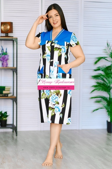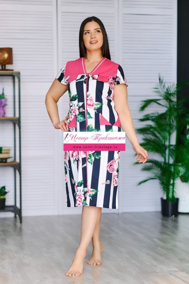 Оригинальный женский халат средней длины на молнии, с красивым принтом на ткани в виде полос и роз. Выполнен из кулирки, с двумя карманами, с поясом.