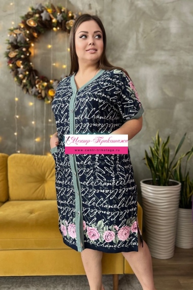 Женский халат на молнии выполнен из кулирки с коротким рукавом, длиной ниже колена, с накладными карманами, очень приятный к телу.