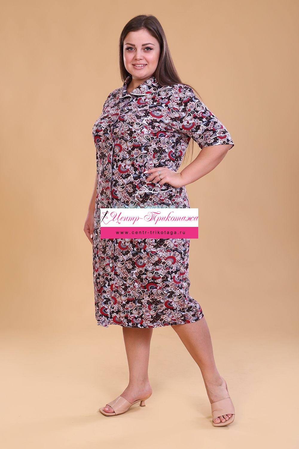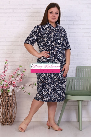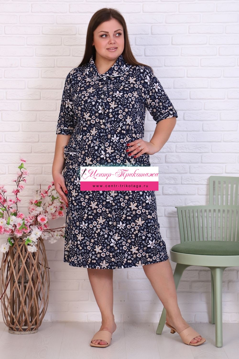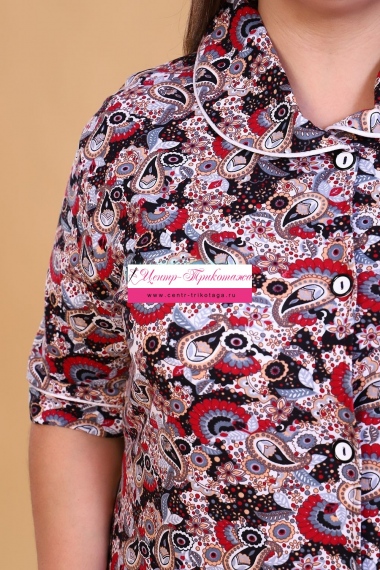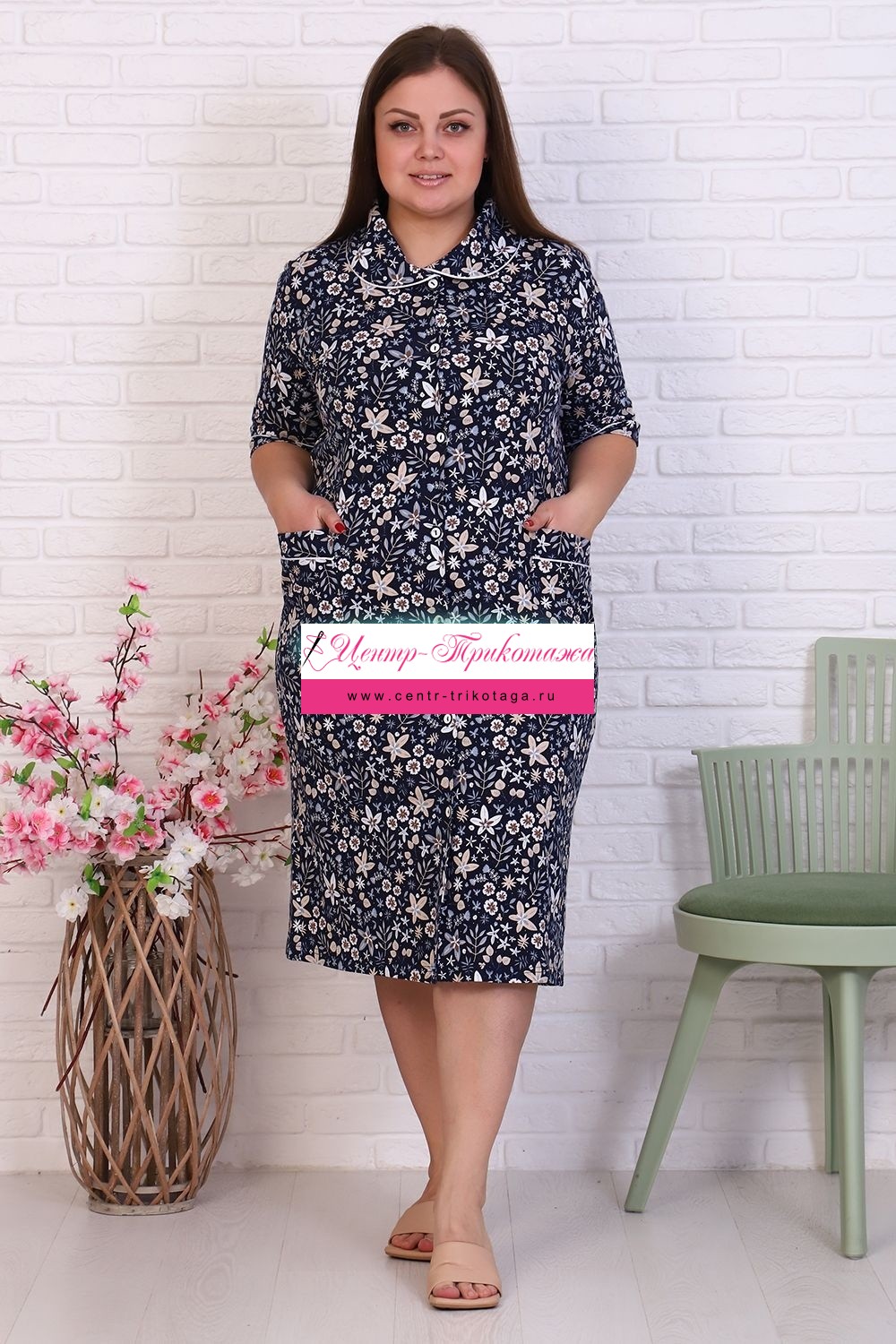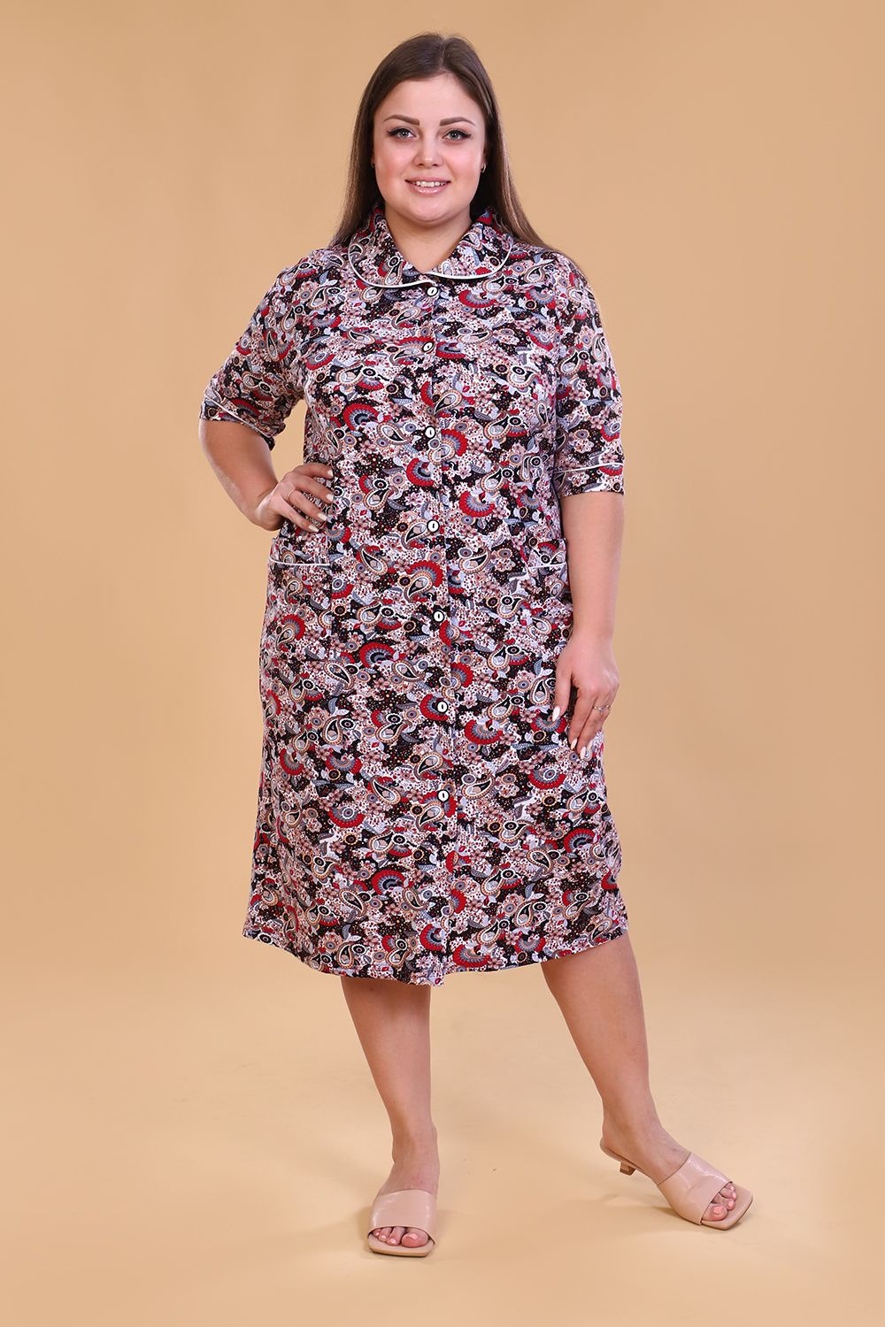 Халат женский на пуговицах, с отложным воротником, накладными карманами. Изготовлен из натурального хлопка. Длина изделия ниже колена, свободный покрой обеспечит вам удобство и не стеснит ваших движений. На спинке халата есть 2 полупояса, которые регулируют объем в талии. В такой модели будет удобно женщине любого возраста. На модели 52 размер