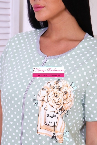 Халат в горошек на молнии, с боковыми карманами с принтом на левой полочке.