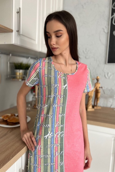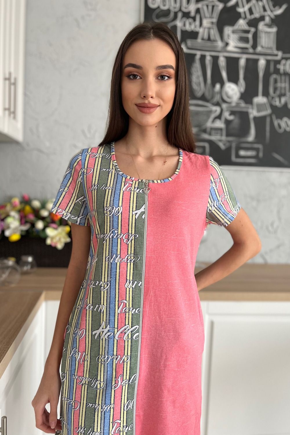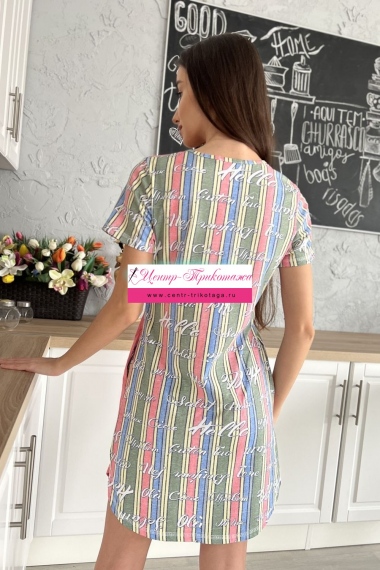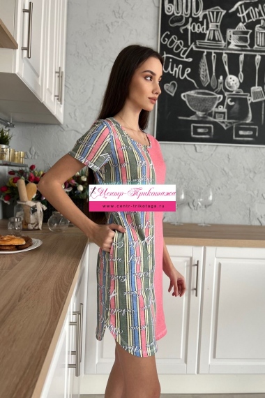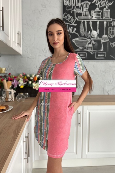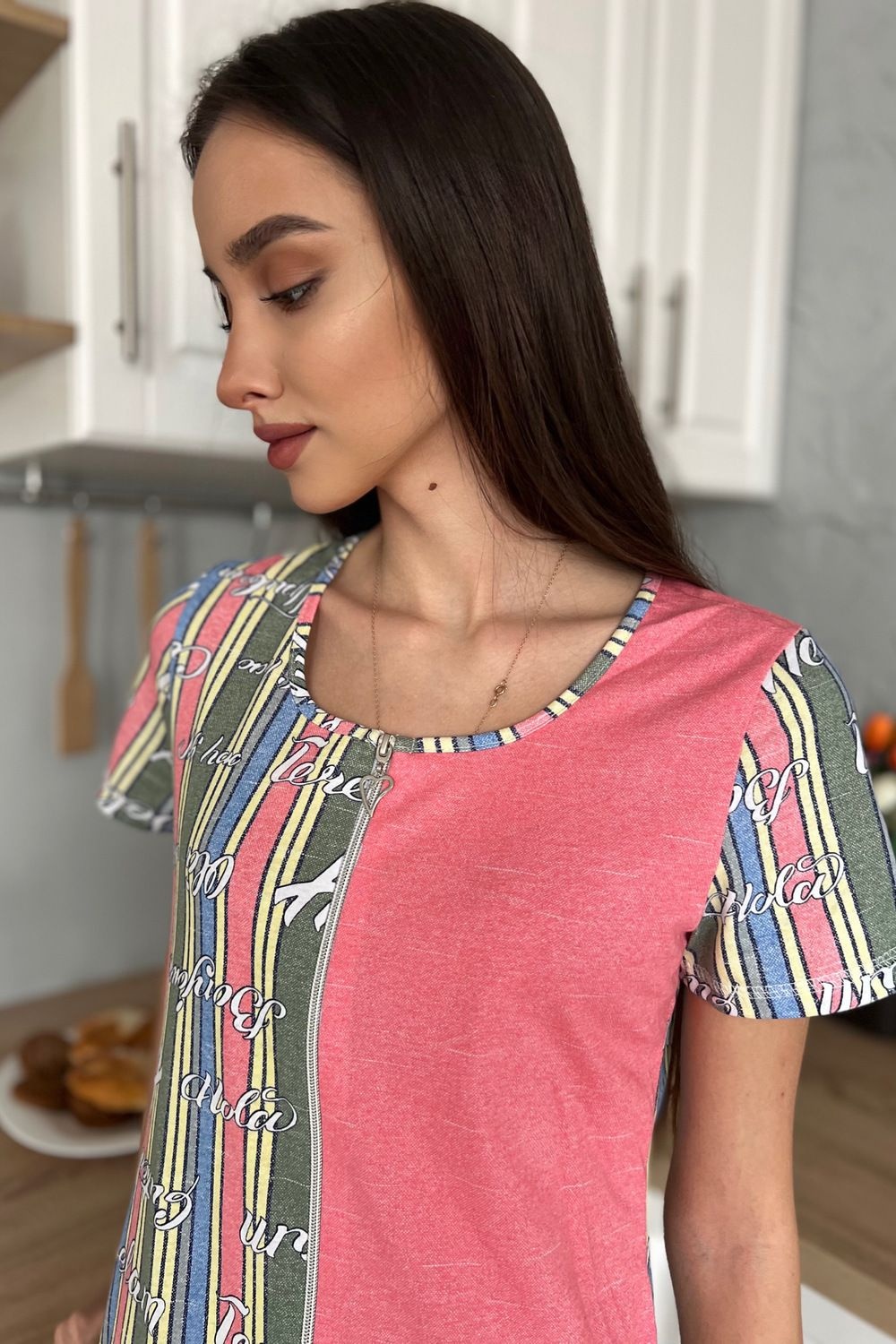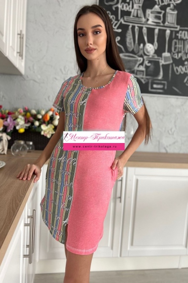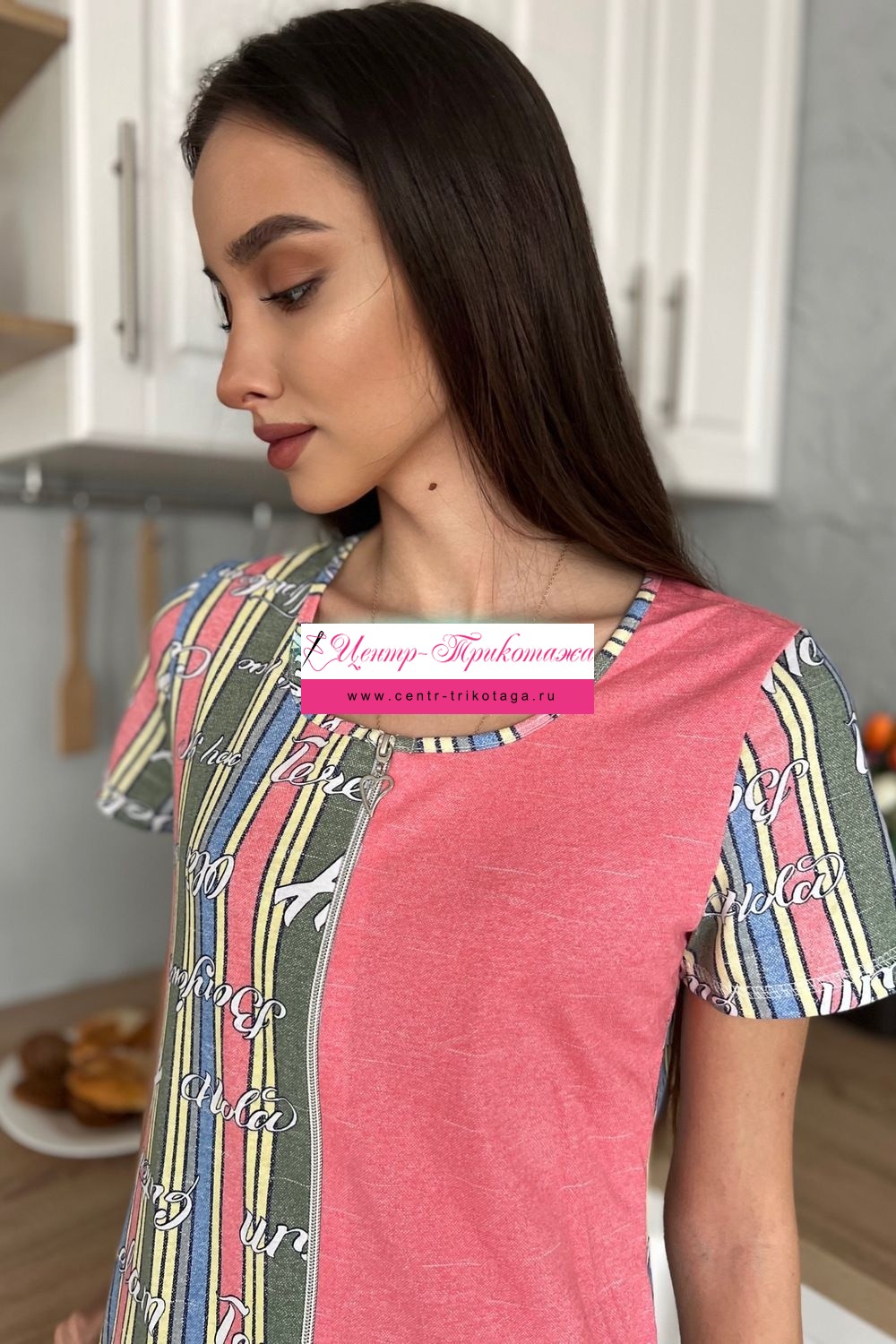 Халат на молнии, полуприлегающего силуэта, длиной выше колена, с округлой горловиной, с карманами в боковом шве, с фигурной линией низа. Рукав втачной, короткий. Горловина обработана бейкой из основного полотна.