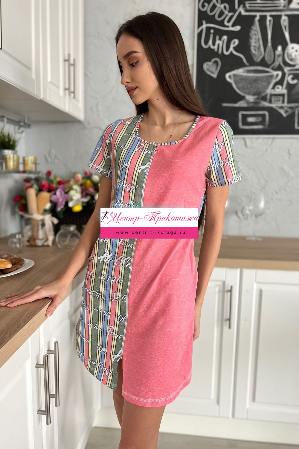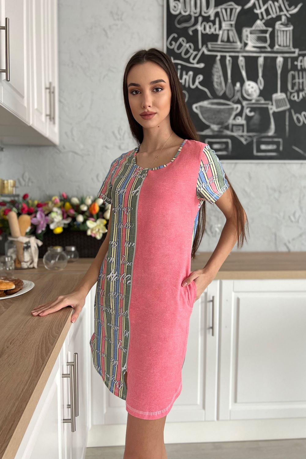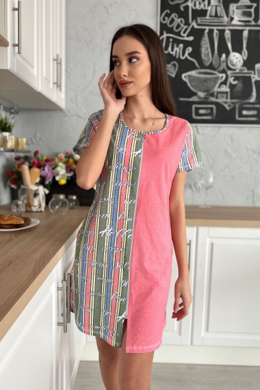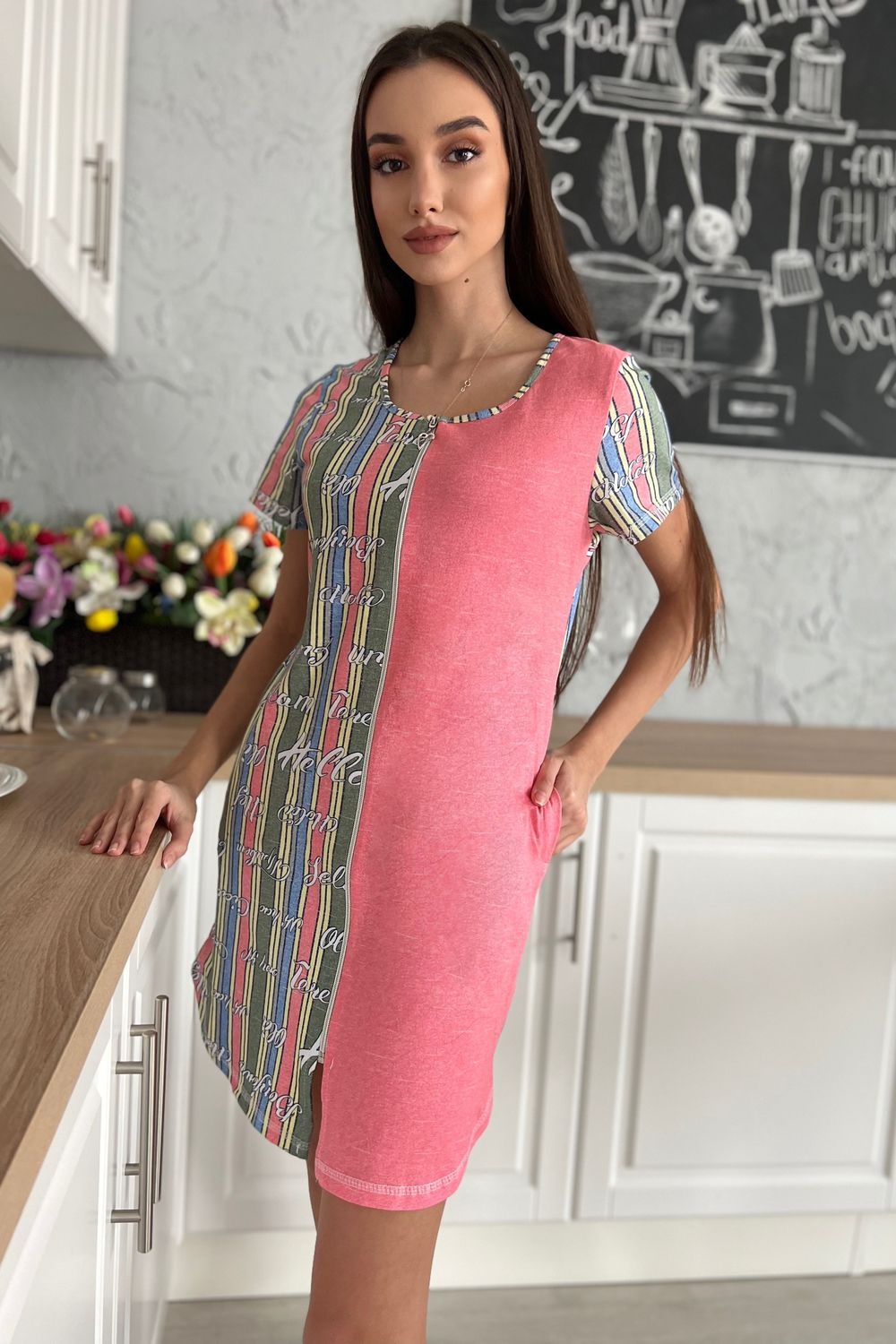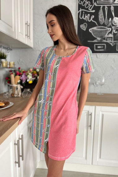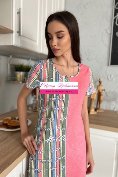 Халат на молнии, полуприлегающего силуэта, длиной выше колена, с округлой горловиной, с карманами в боковом шве, с фигурной линией низа. Рукав втачной, короткий. Горловина обработана бейкой из основного полотна.
