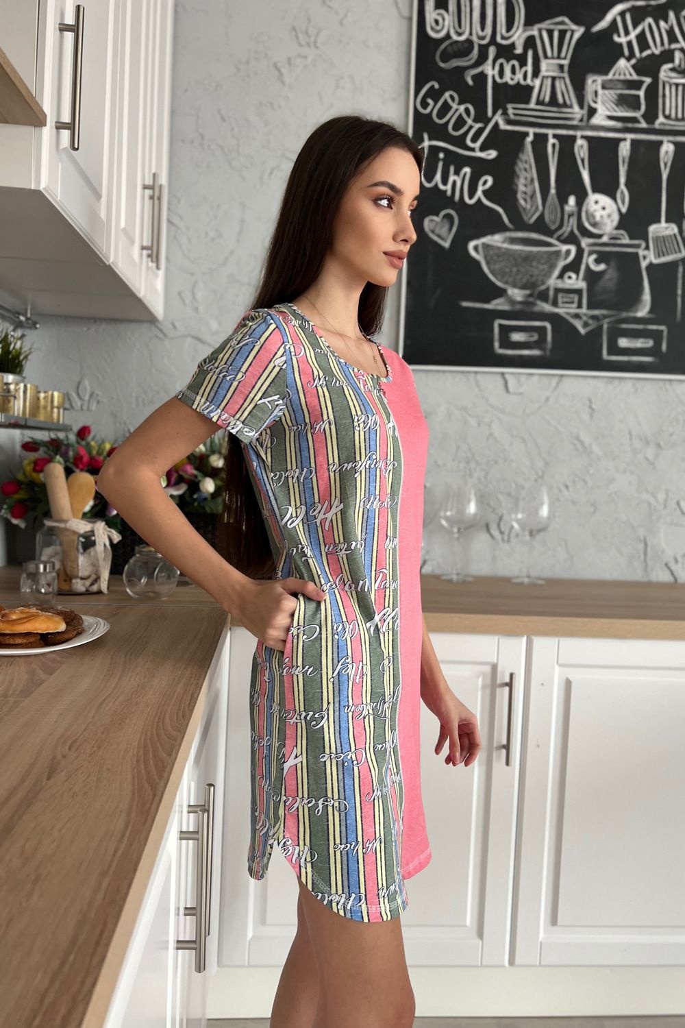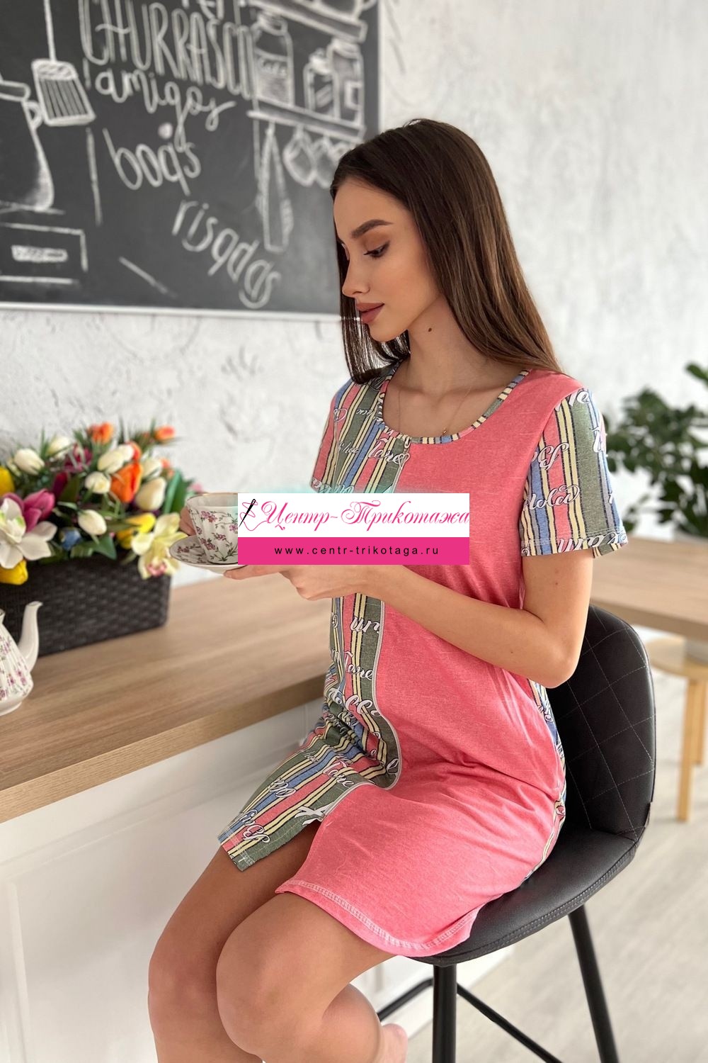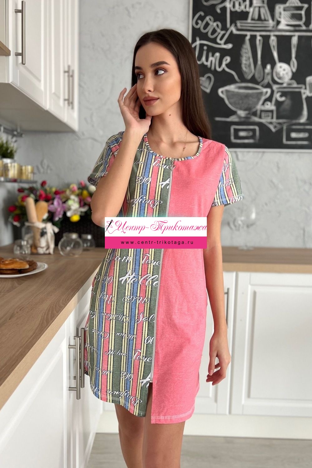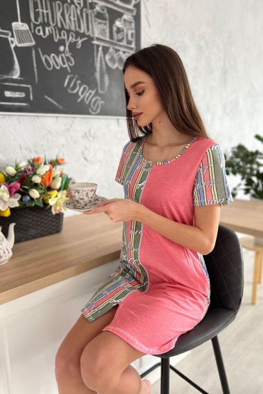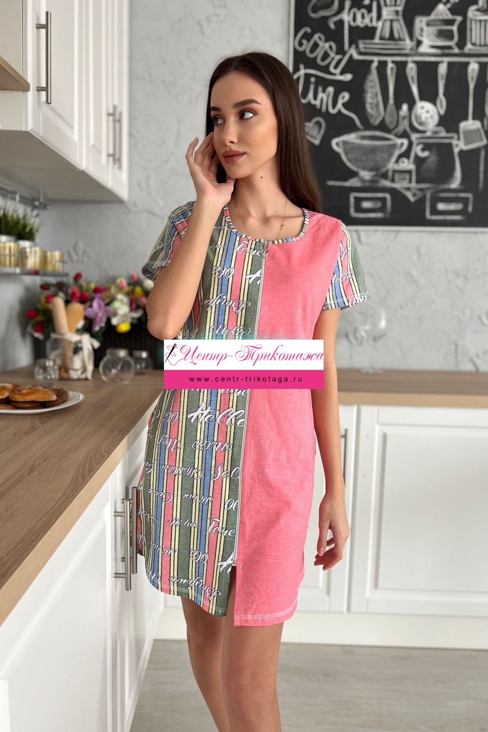 Халат на молнии, полуприлегающего силуэта, длиной выше колена, с округлой горловиной, с карманами в боковом шве, с фигурной линией низа. Рукав втачной, короткий. Горловина обработана бейкой из основного полотна.