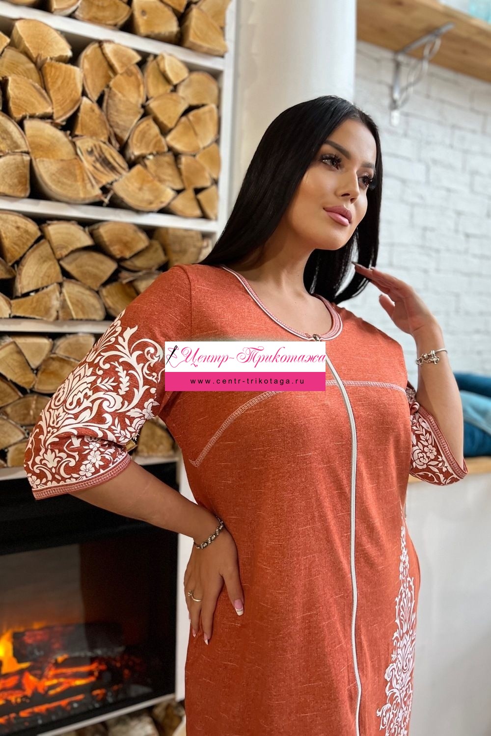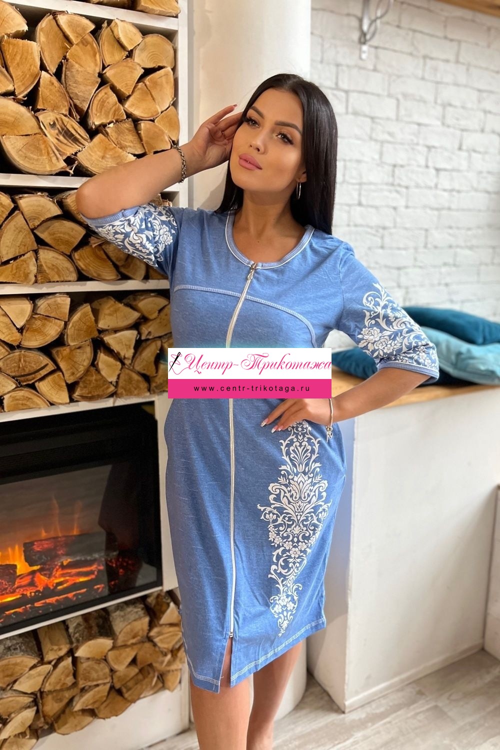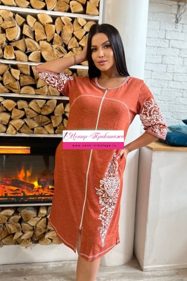 Халат на молнии, полуприлегающего силуэта, длиной ниже колена, с округлой горловиной, с карманами в боковом шве. Рукав втачной, длиной 3/4. В верхней части полочки и спинки расположены фигурные кокетки. Горловина и низ рукавов обработаны бейкой из основного полотна.