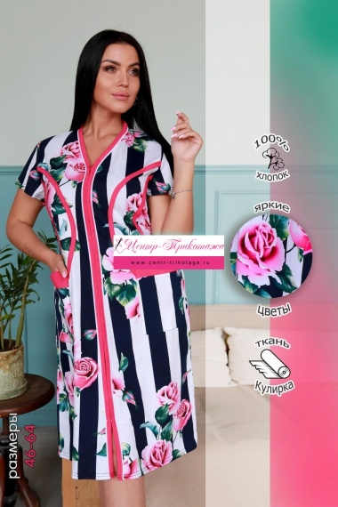 Халат женский махровый полуприлегающего силуэта, слегка расширенный к низу. Застежка на тесьму-молнию. Рукав втачной 3/4. Халат с асимметричными вставками на полочках. На полочке внутренний карман в горизонтальном шве притачивания средней и нижней части полочки.