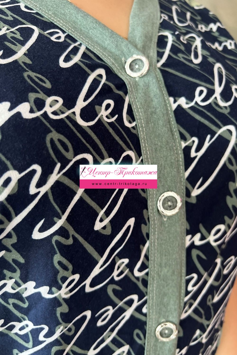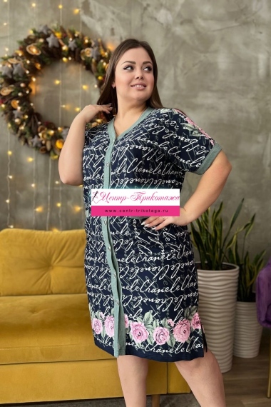 Халат женский прямого силуэта. Рукав цельнокроенный корокий. На полочке два накладных кармана. В боковых швах разрезы. Край борта, низ рукава, верх кармана обработаны широкой окантовкой. По низу халата купон розы, так же этот принт возможен на рукаве. На модели 52 размер