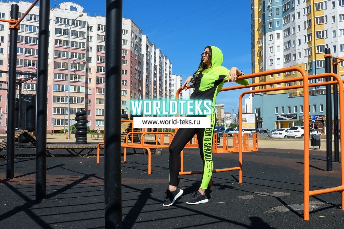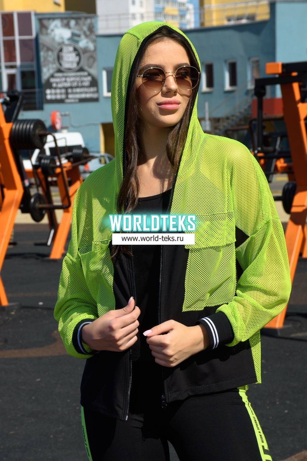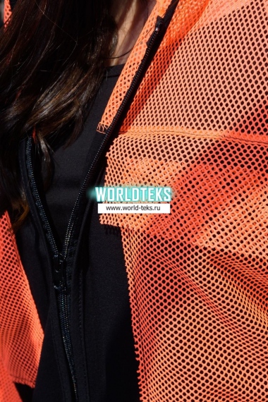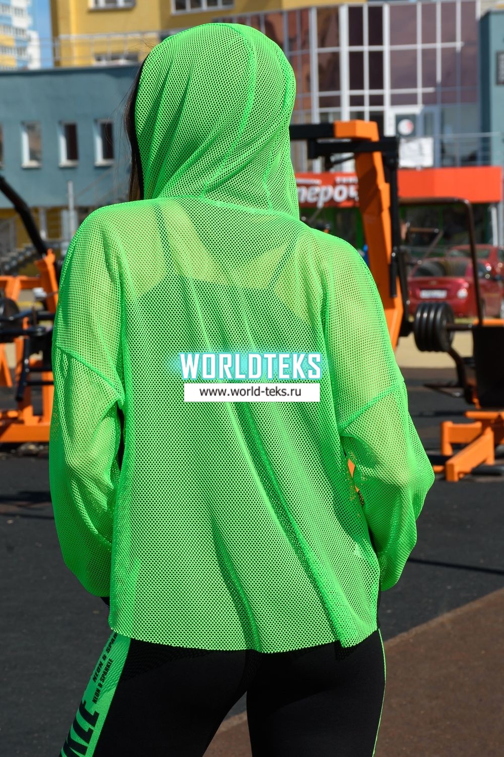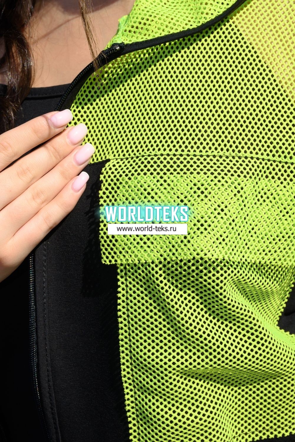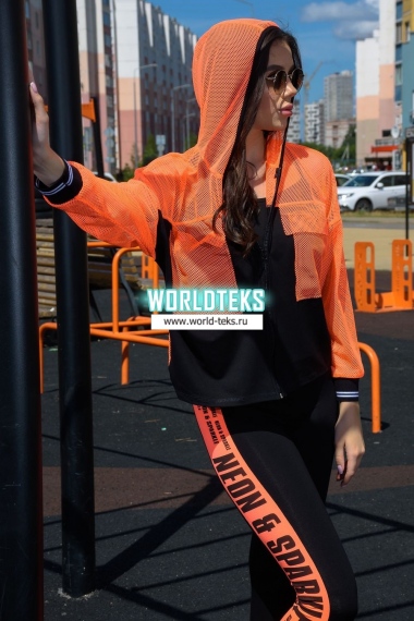 Комплект состоит из толстовки и майки. Толстовка прямая, свободная, с капюшоном из сетки, на молнии. Рукав длинный, из сетки, на эластичном манжете. Спинка удлиненная, из сетки. В верхней части полочки расположены кокетки из сетки. На полочку настрочены накладные карманы с клапанами из сетки. Майка на бретелях, полуприлегающая.
