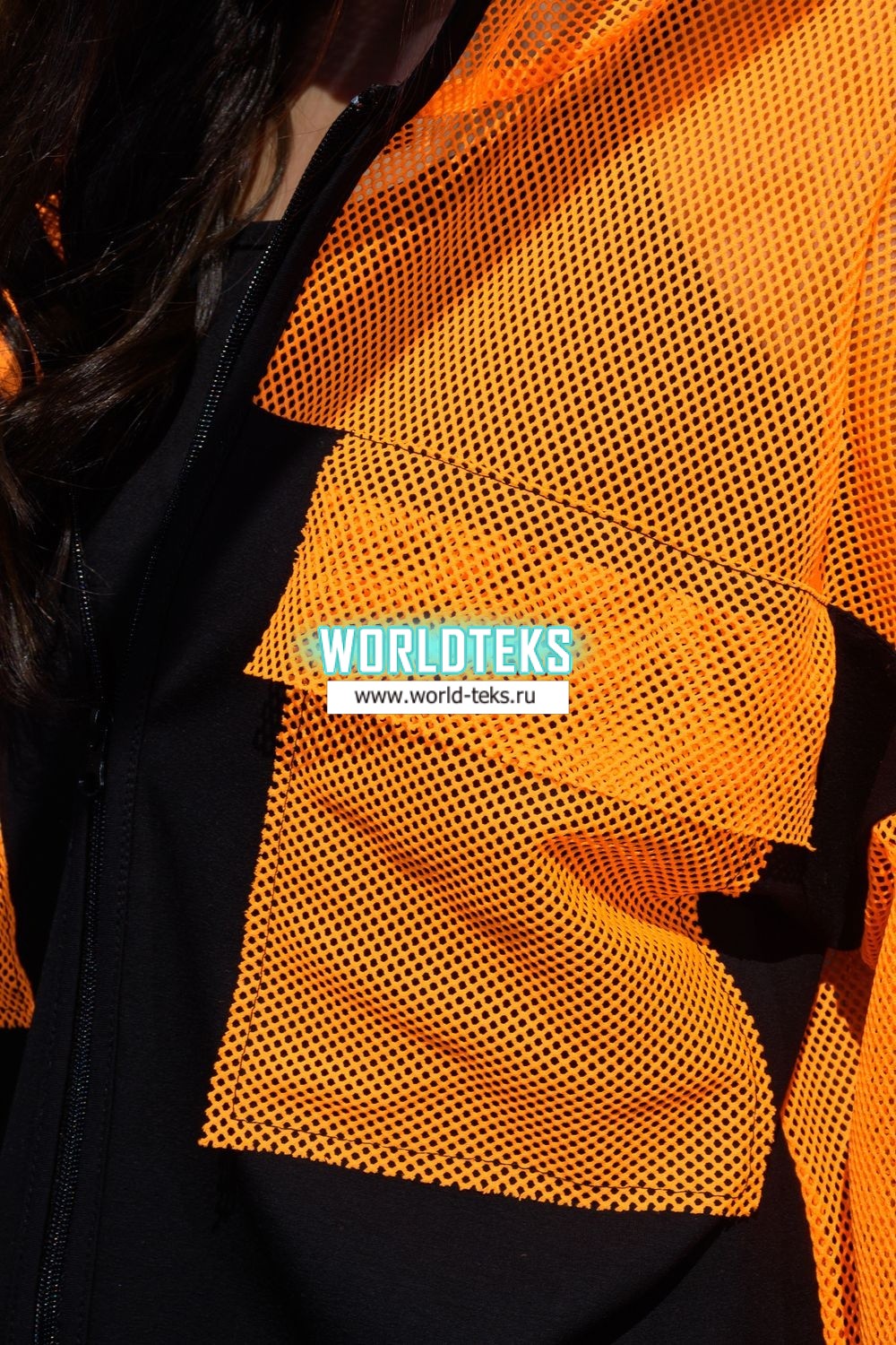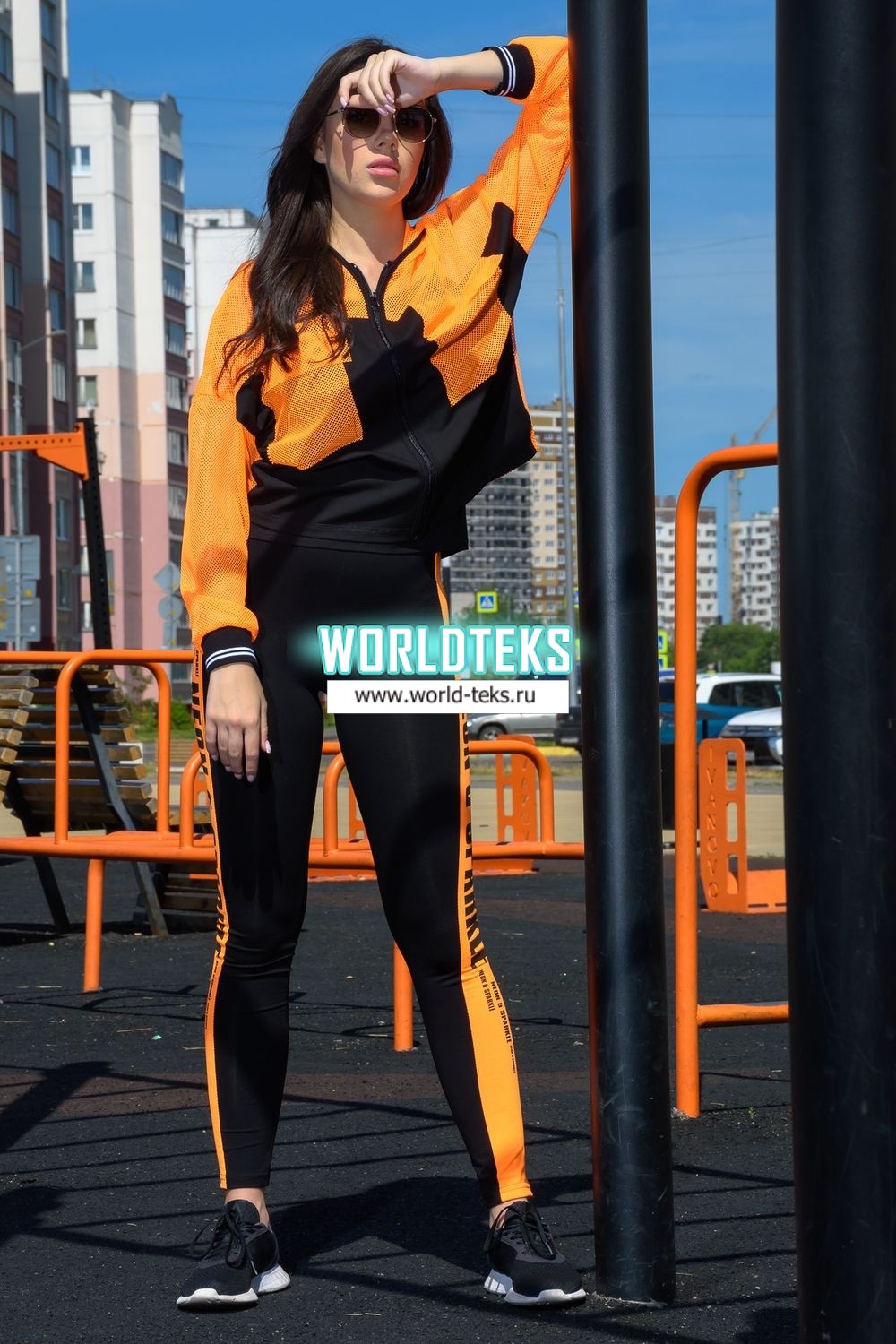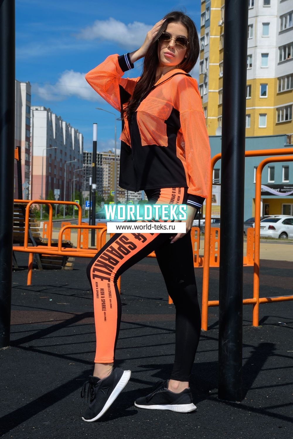Комплект состоит из толстовки и майки. Толстовка прямая, свободная, с капюшоном из сетки, на молнии. Рукав длинный, из сетки, на эластичном манжете. Спинка удлиненная, из сетки. В верхней части полочки расположены кокетки из сетки. На полочку настрочены накладные карманы с клапанами из сетки. Майка на бретелях, полуприлегающая.