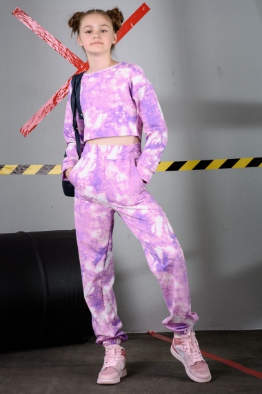 Комплект для девочки, состоящий из джемпера и брюк. Толстовка прямого силуэта со спущенным длинным рукавом. Горловина круглая с капюшоном. Капюшон состоит из 2 половин, в цвет изделия. Горловина спинки внутри обработана бейкой из кулирки. Рукав заканчивается цельнокроенным манжетом с резинкой внутри. На полочке принт шелкография. Надпись переводится как Привет; Давай веселиться; Мои друзья . Брюки прямого силуэта. Пояс отрезной, выполнен из основного полотна, в цвет изделия, с эластичной тесьмой внутри. На изделии выполнены карманы с отрезным бочком и отлетной мешковиной. По низу изделия цельнокроенные манжеты с эластичной тесьмой внутри.