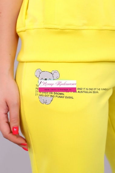 Костюм женский - брюки и жилет с цельным двойным капюшоном. Данная модель выполнена из трикотажного полотна футер 2-х нитка. Жилет свободного покроя, с отрезным бочком. Отделка на жилете из эластичного трикотажного полотна кашкорсе. Пояс брюк обработан трикотажными строчками. На полочке, спинке, на правой ноге спереди и на левой ноге сзади присутствуют принты. В качестве осеннего варианта костюм можно сочетать с водолазками и лонгсливами. Модный стильный костюм порадует вас в любую погоду.