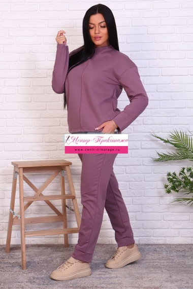 Стильный базовый костюм из хлопкового трикотажа отличного качества. Брюки прямого кроя, зауженные к низу, высокая посадка с простроченными стрелками, низ без резинки(не режет ногу), карманы в швах. Трикотажный джемпер длиной до середины бедра. По центру переда декоративный вертикальный защип вытягивает и стройнит. Горловина джемпера с цельнокроеной стойкой, обработана притачной обтачкой. Рукава джемпера длинный двухшовный, рубашечного кроя, линия плеча спущена. Полные размеры