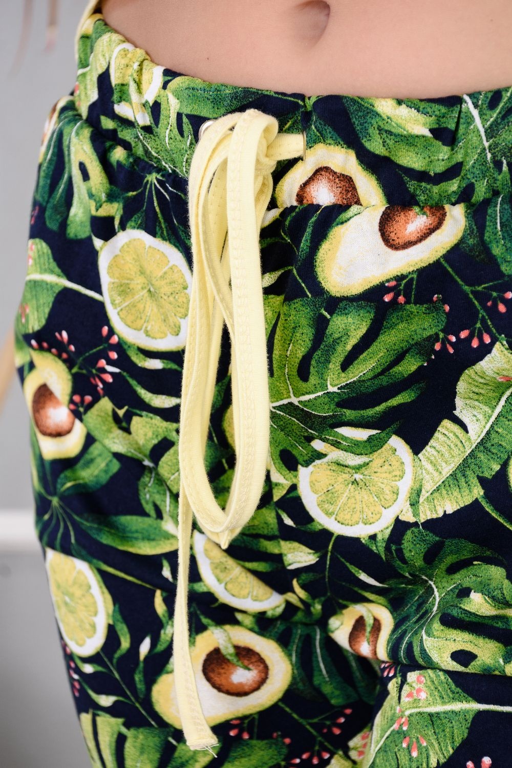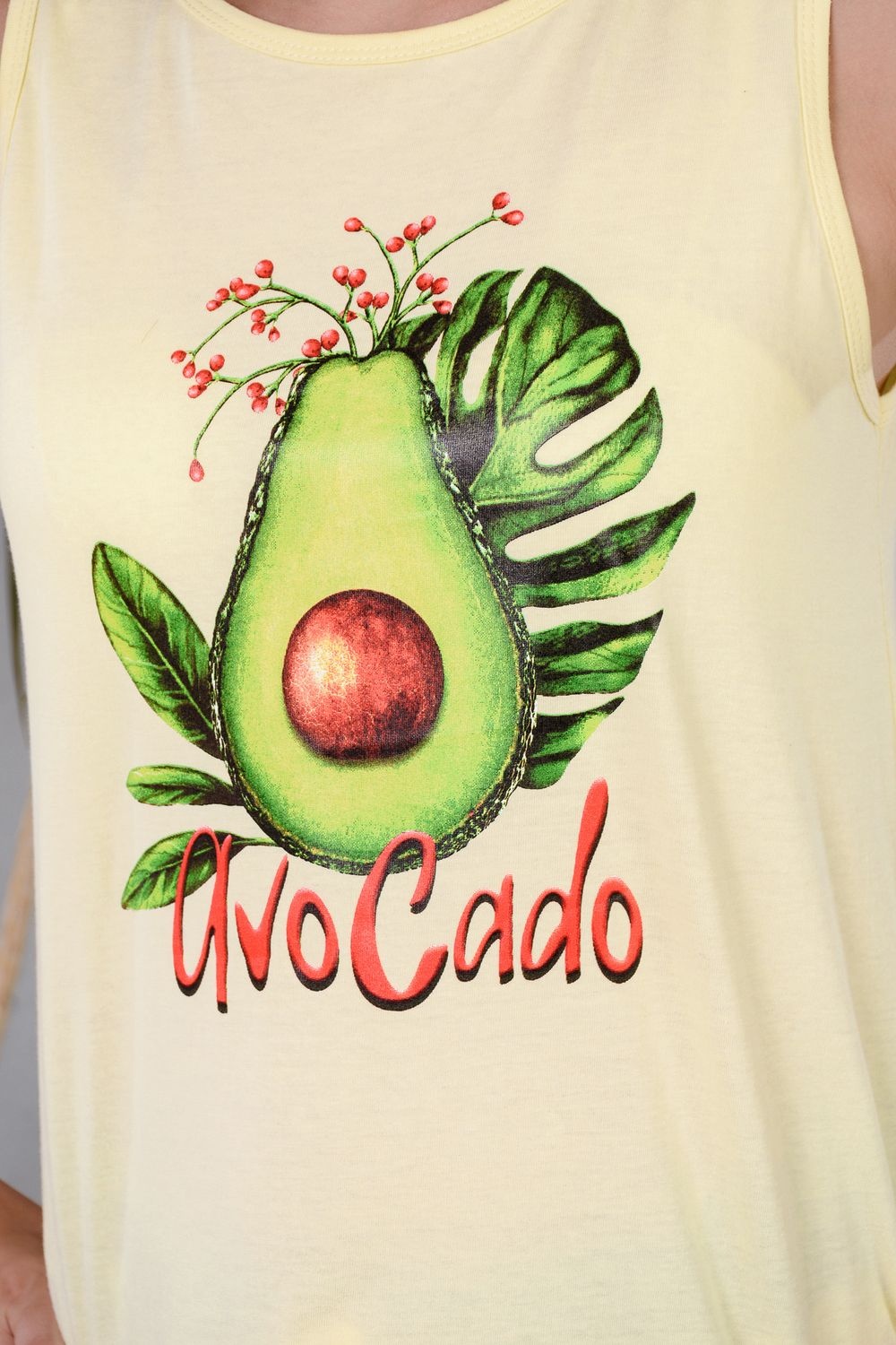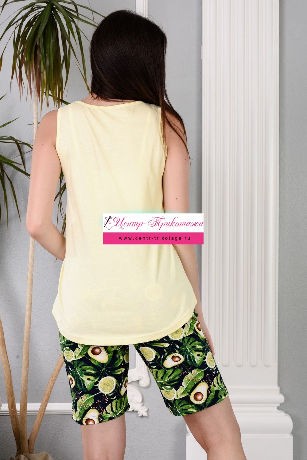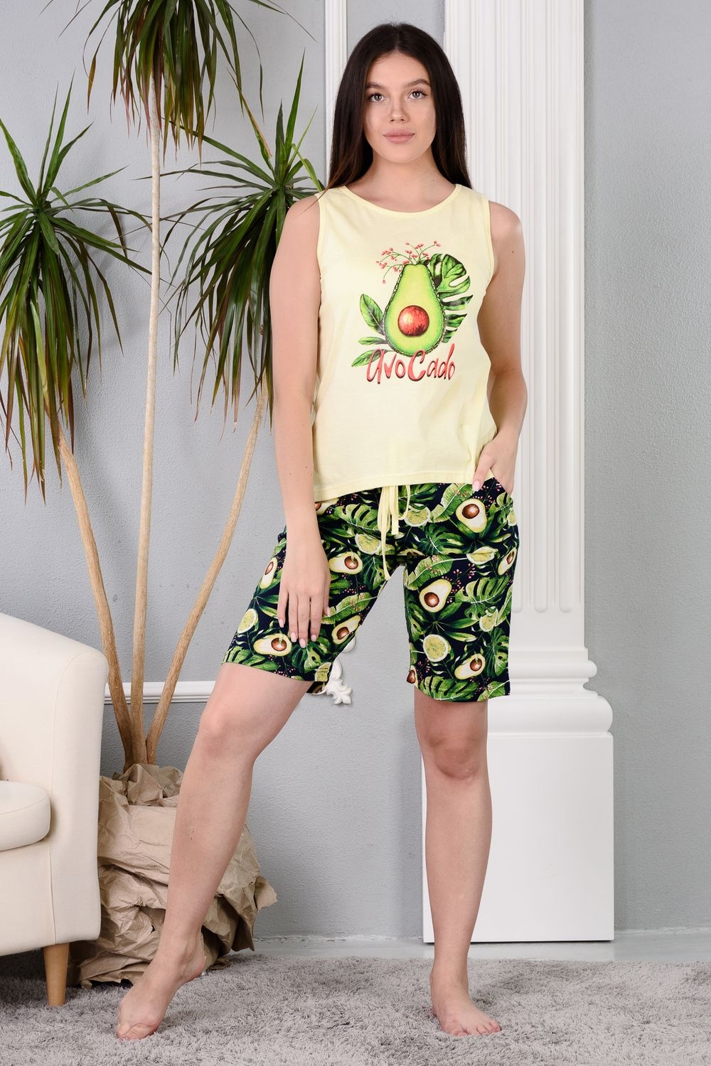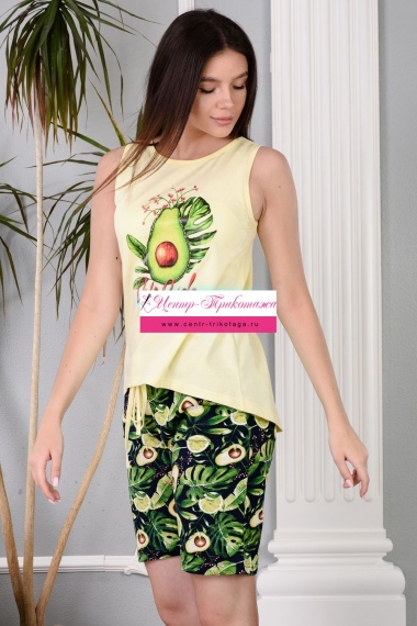 Нежный женский костюм из 100% хлопка - комплект из удлиненных шортиков и майки. Скругленная линия подола спереди и сзади. Разница в длине спинки и полочки в 19 см. На шортах глубокие удобные карманы. Принт - авокадо.