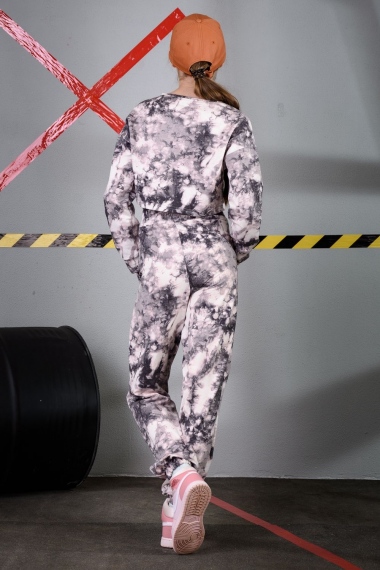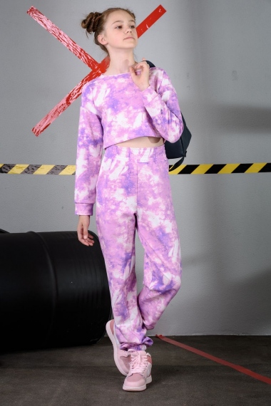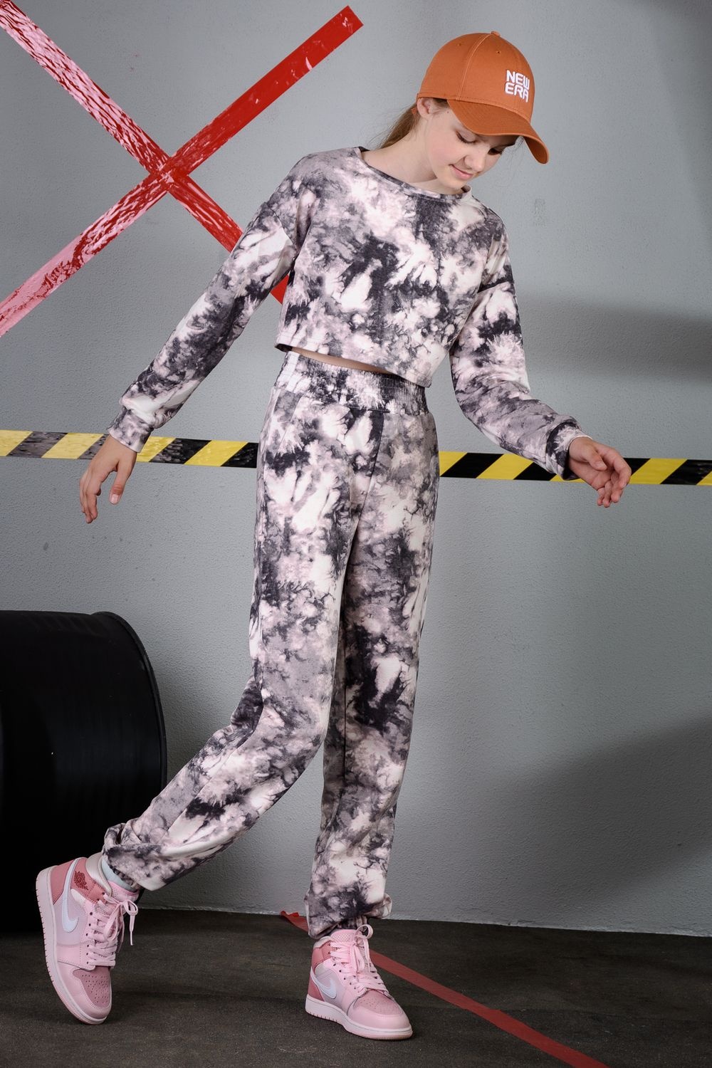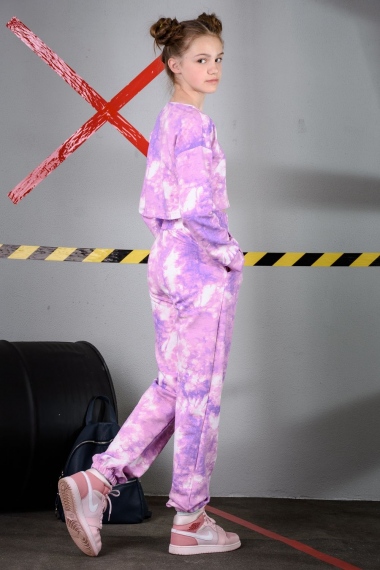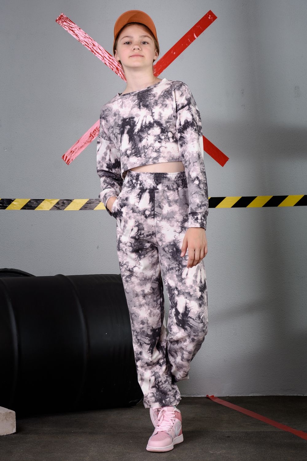 Стильный детский костюм из футера тай-дай, состоящий из кроп-топа с длинным рукавом и джоггерами с завышенной талией. Толстовка со спущенным плечиком, рукава на манжетах. Брюки с широкой резинкой, которая комфортно прилегает к вашему телу. Так же есть взрослый вариант модели 4437.