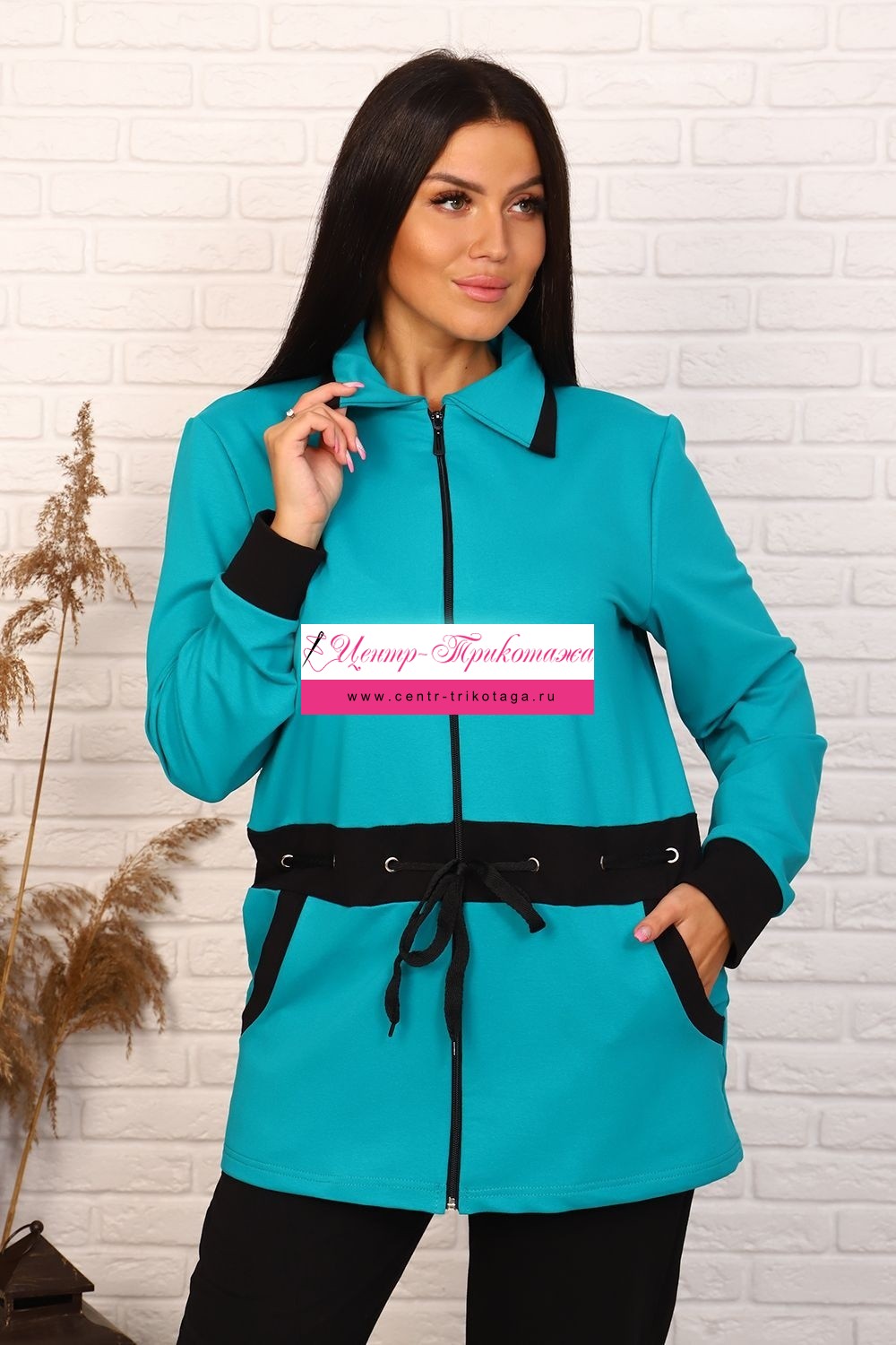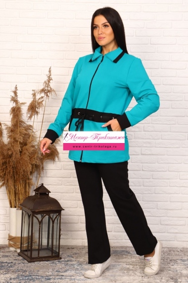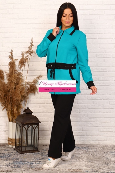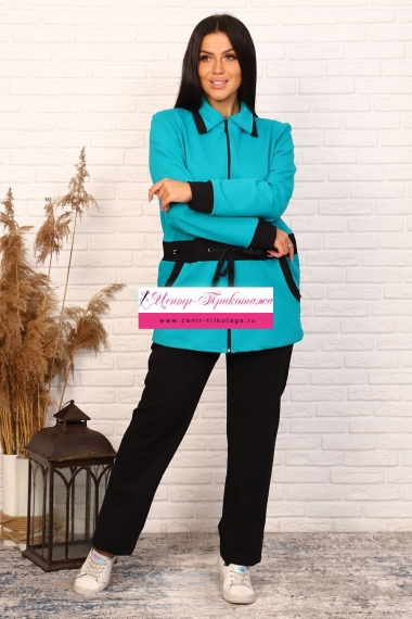 Спортивный женский костюм, состоит из кофты и брюк. Брюки прямого силуэта на резинке. Кофта удлиненная на молнии, на кулиске со шнурком. Два боковых кармана. Рукав длинный на манжете.