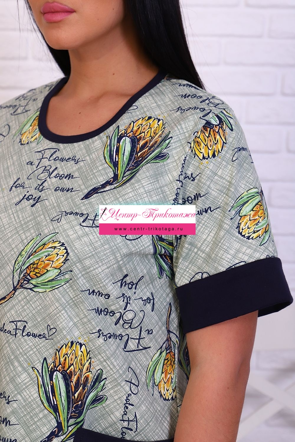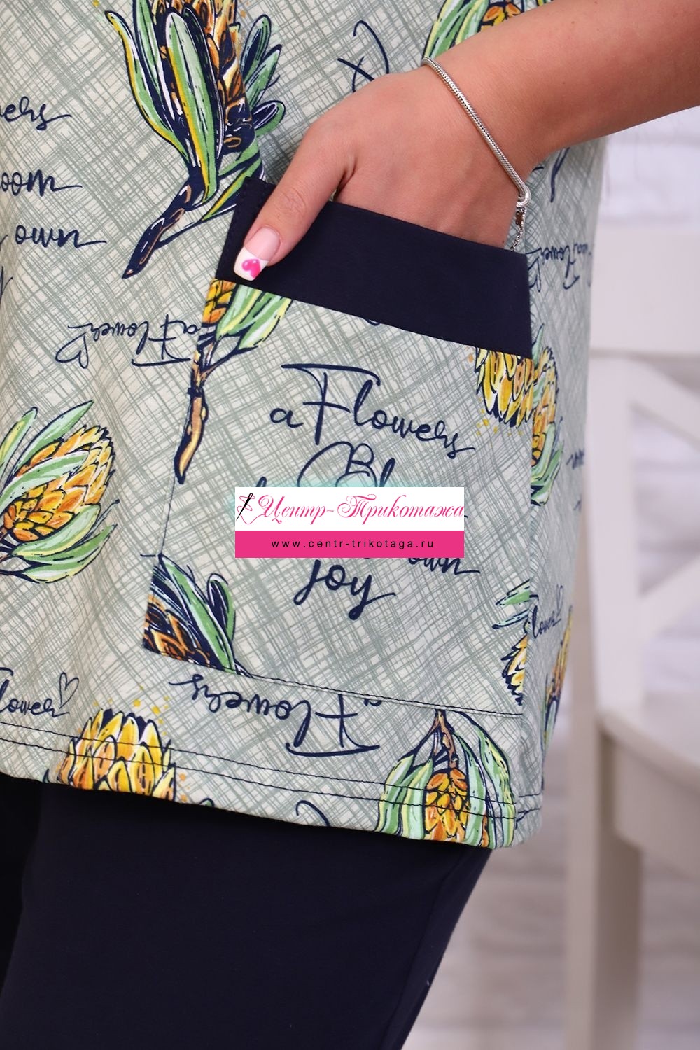 Женский костюм из кулирки футболка + бриджи. Футболка из набивной ткани с короткими рукавами на манжетах, сбоку два накладных кармана, бриджи из однотонной ткани