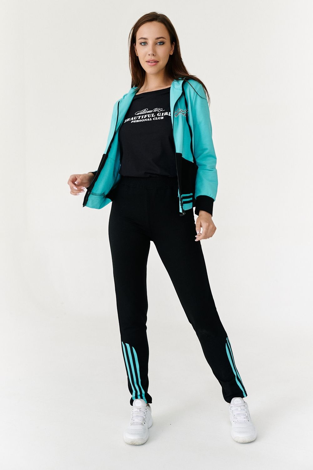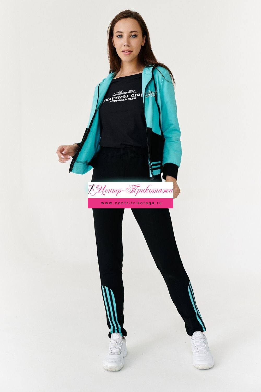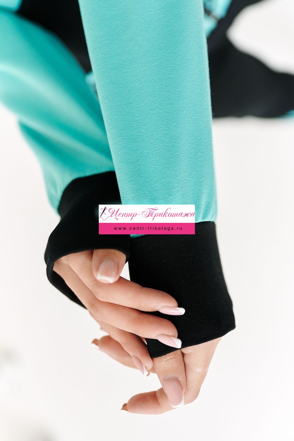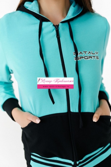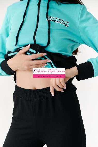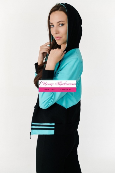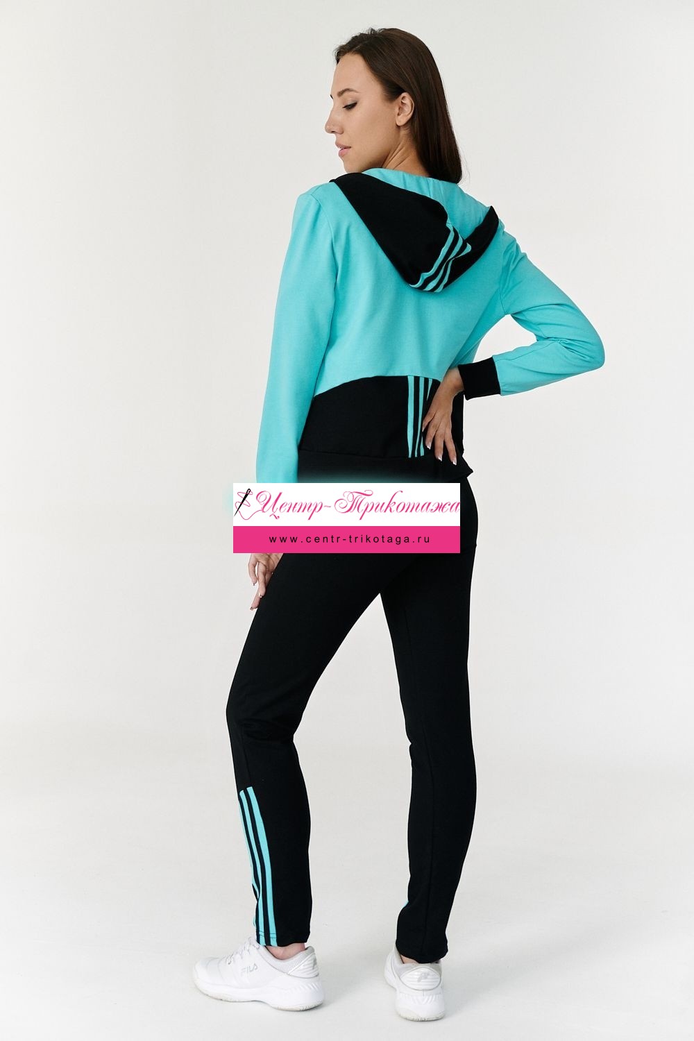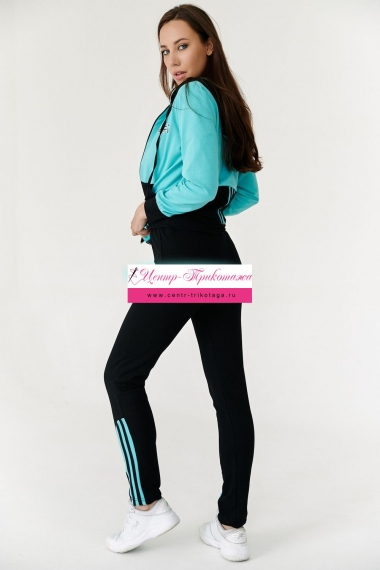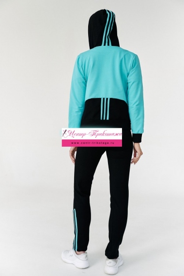 Костюм из футера с лайкрой толстовка + брюки. Толстовка с капюшоном на шнурке, накладные карманы спереди, молния, декоративные полоски. Дизайн брюк в виде цветных вставок и полосок