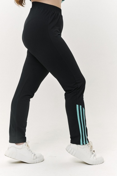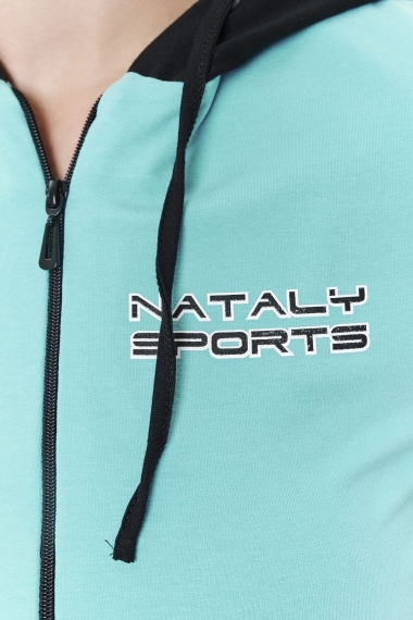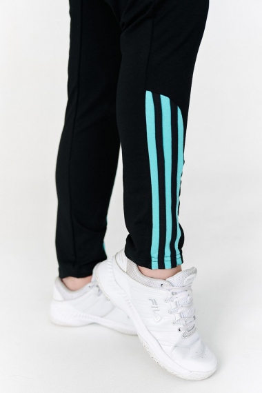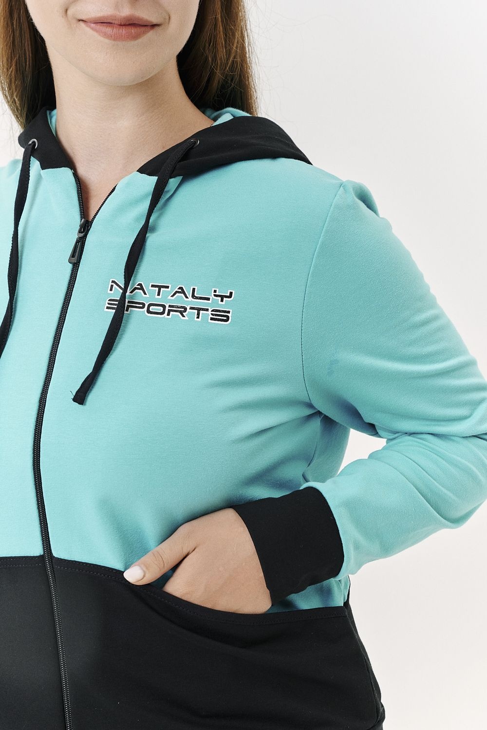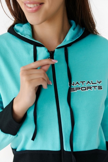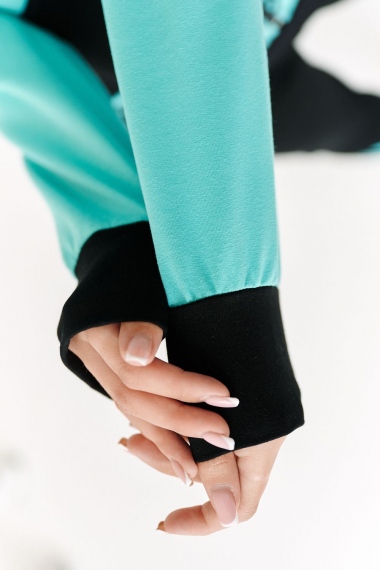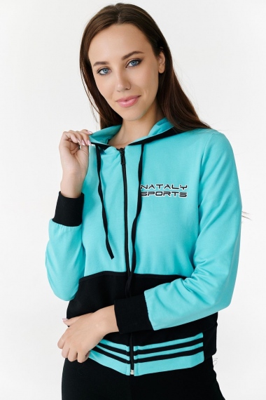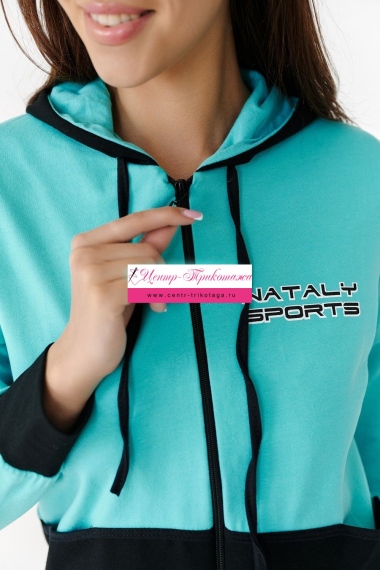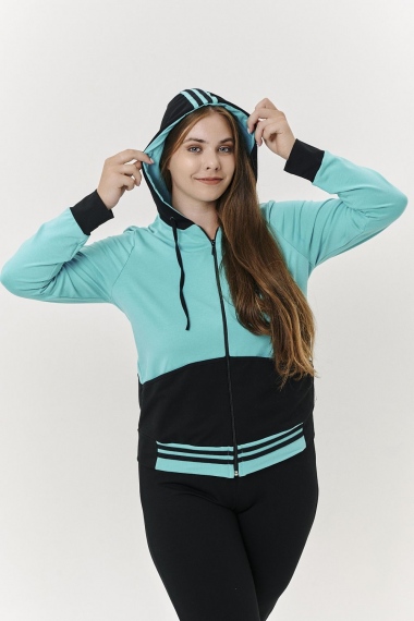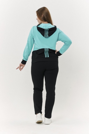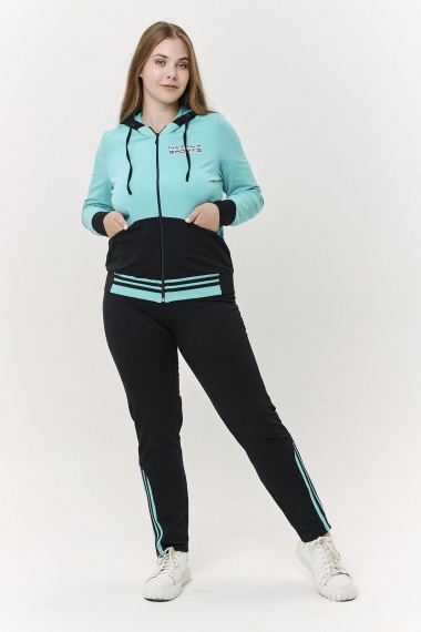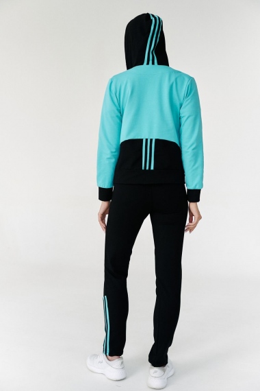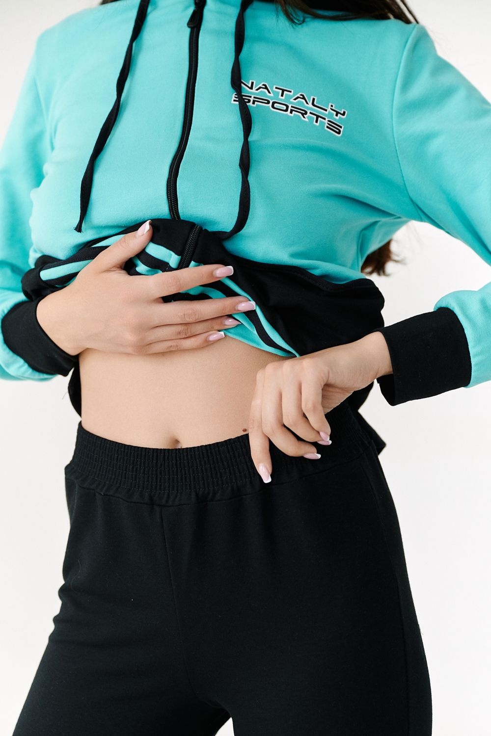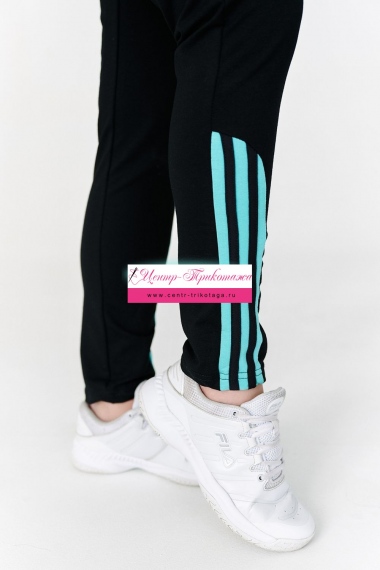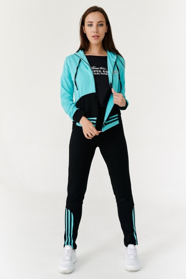 Костюм из футера с лайкрой толстовка + брюки. Толстовка с капюшоном на шнурке, накладные карманы спереди, молния, декоративные полоски. Дизайн брюк в виде цветных вставок и полосок