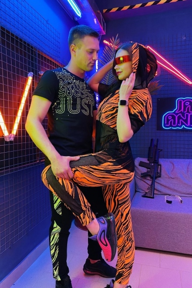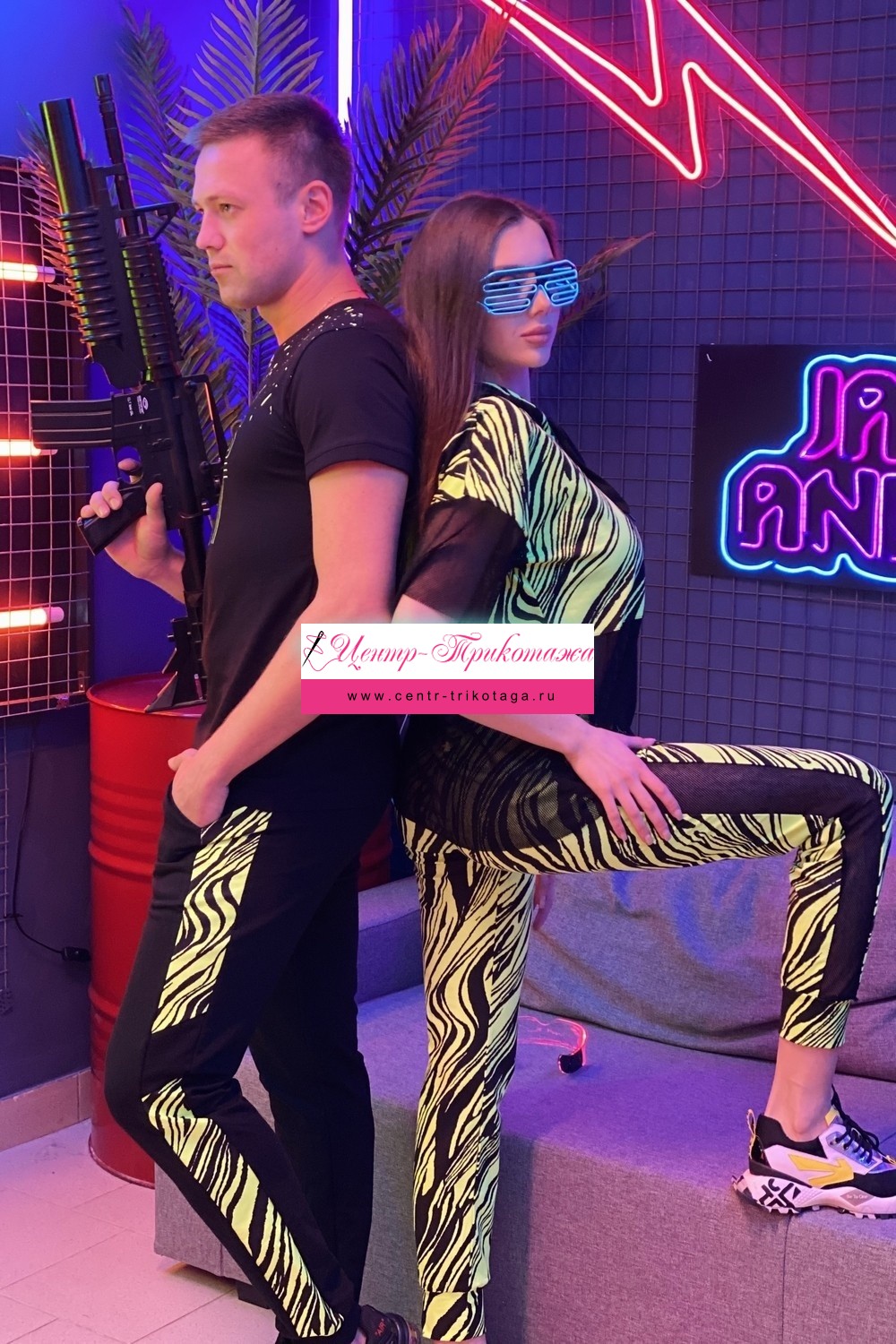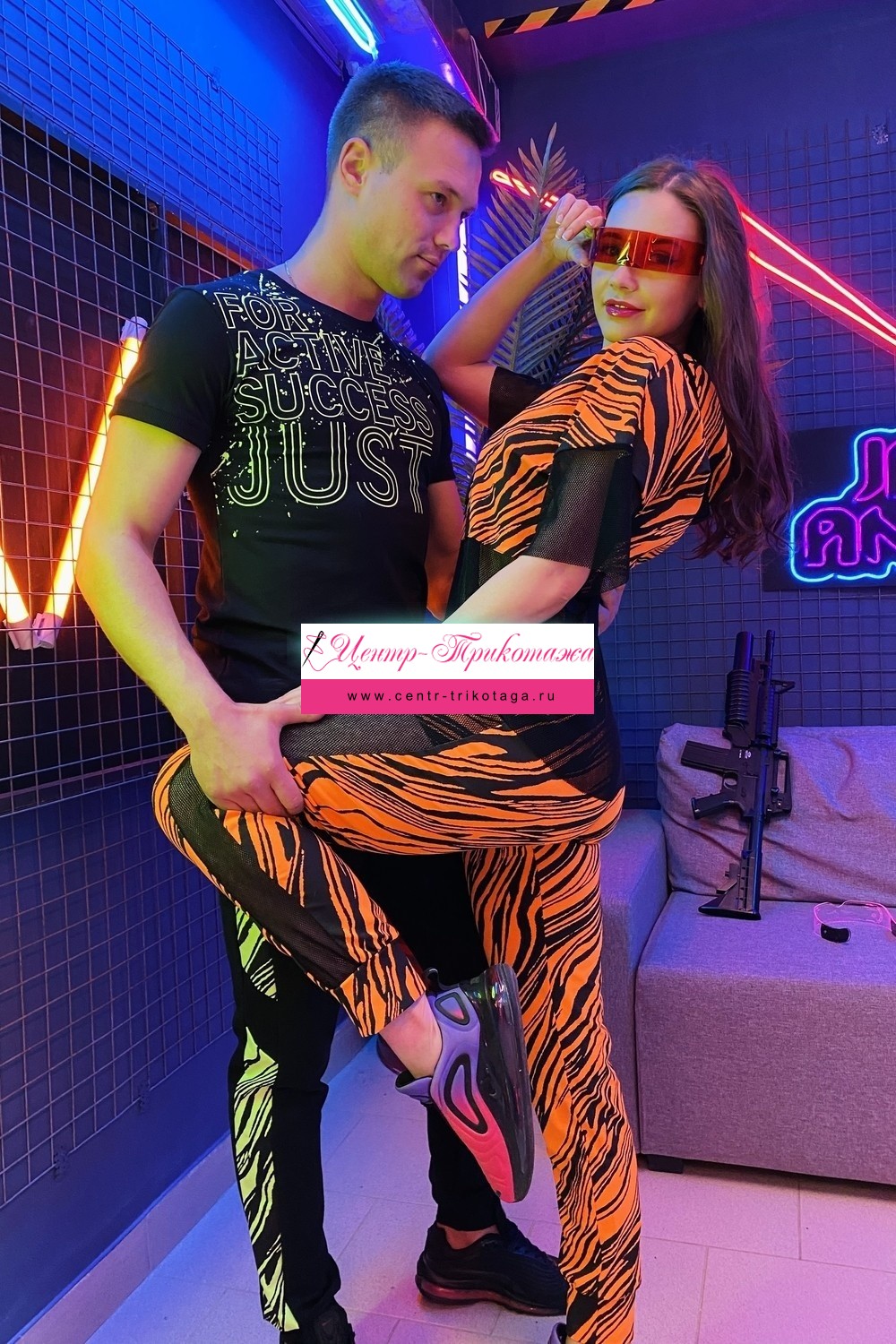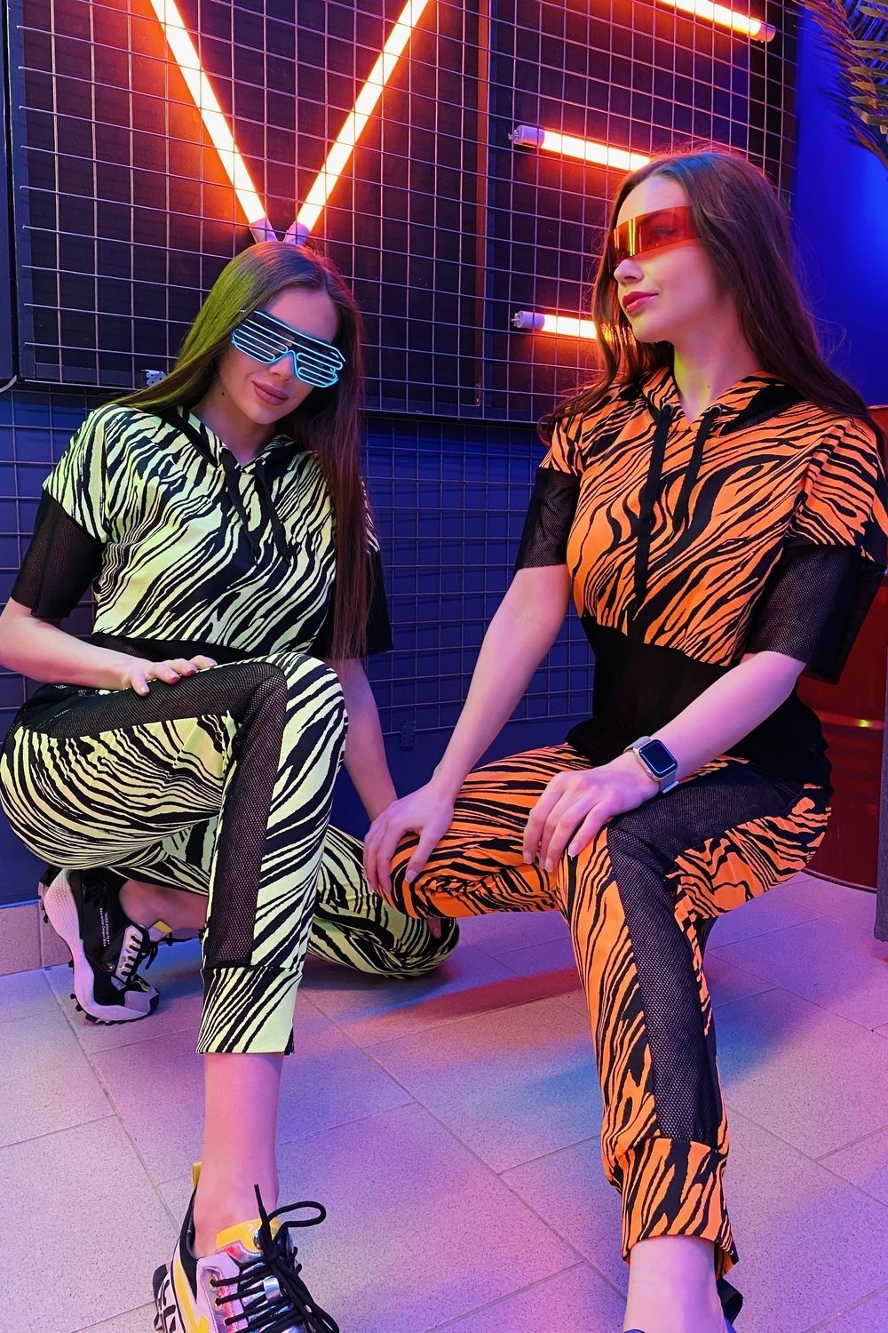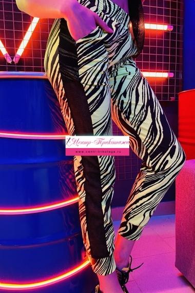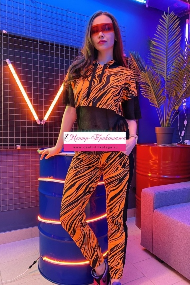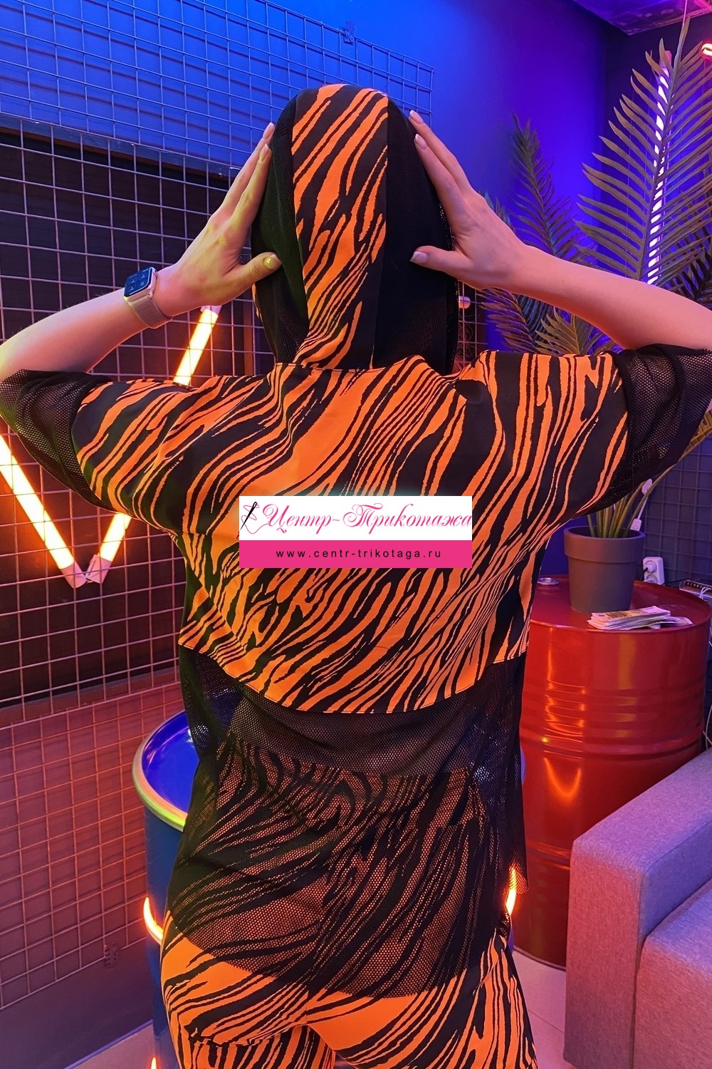 Комплект состоит из туники и брюк. Брюки на поясе, с карманами, с лампасами из сетки вдоль боковых швов, на манжете по низу. Туника свободная, с капюшоном из сетки, с удлиненной спинкой, длиной до середины бедра. Рукав короткий, из сетки. Нижняя часть полочки и спинки выполнены из сетки.