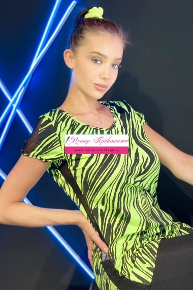 Комплект состоит из футболки и леггинсов. Леггинсы облегающие, на резинке. Футболка полуприлегающего силуэта, с V-образной горловиной, с удлиненной спинкой, с лампасами из сетки по боковым швам. В нижней части боковых швов обработаны разрезы. Рукав втачной, короткий, со вставкой из сетки. Горловина и низ рукавов обработана бейкой из основного полотна.