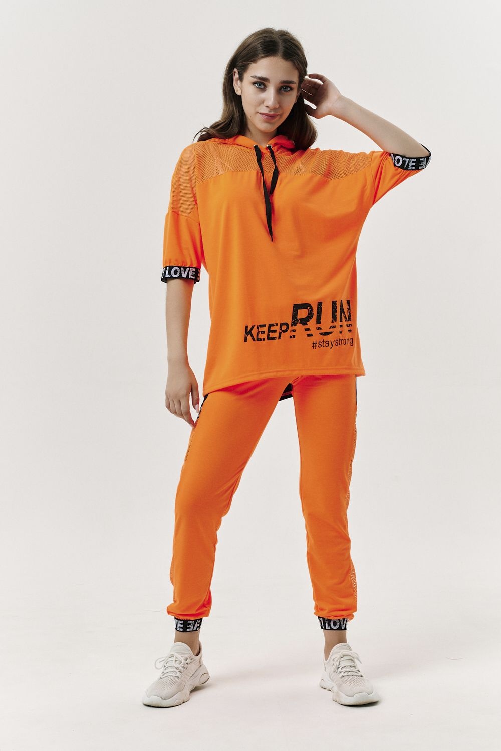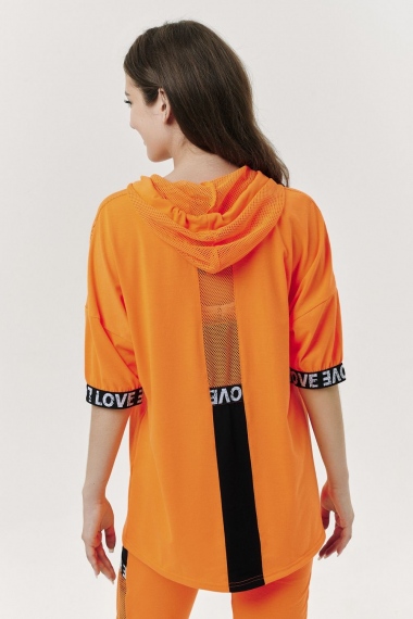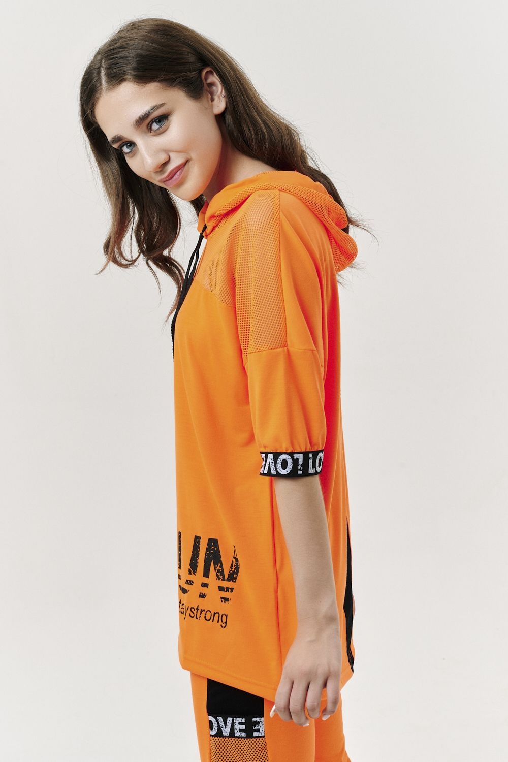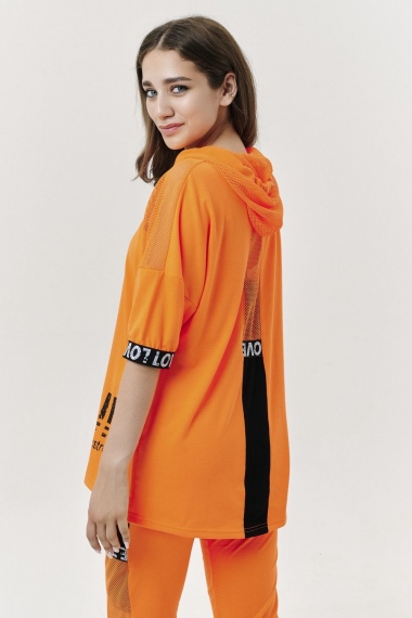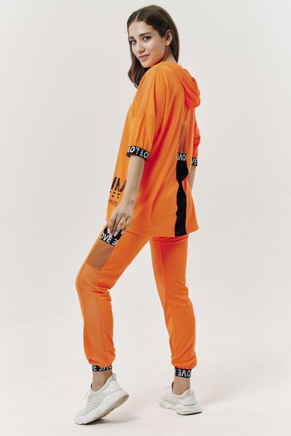 Костюм состоит из туники и брюк. Туника прямая, свободная, с капюшоном из сетки, с удлиненной спинкой. Рукав короткий, обработанный декоративной резинкой. Кокетка полочки выполнена из сетки. Вдоль центра спинки расположена декоративная вставка из отделочного полотна и сетки. Брюки свободные, длинные, с карманами, на эластичном поясе. Низ брюк обработан декоративной резинкой. Вдоль боковых швов расположен лампас из отделочного полотна и сетки. В средней части лампаса расположен карман.