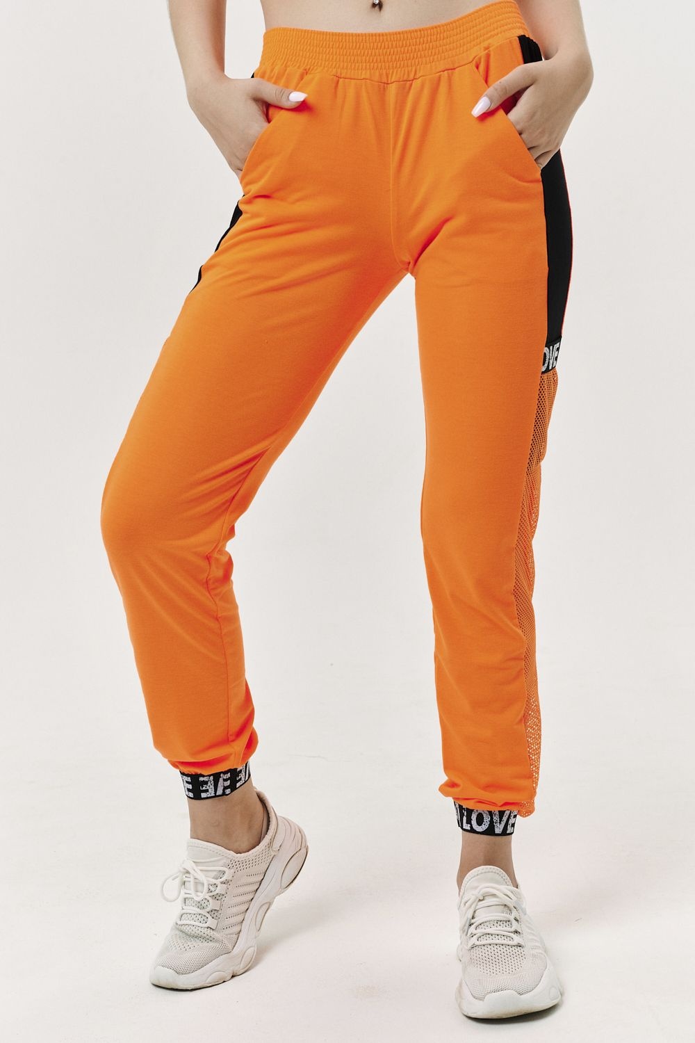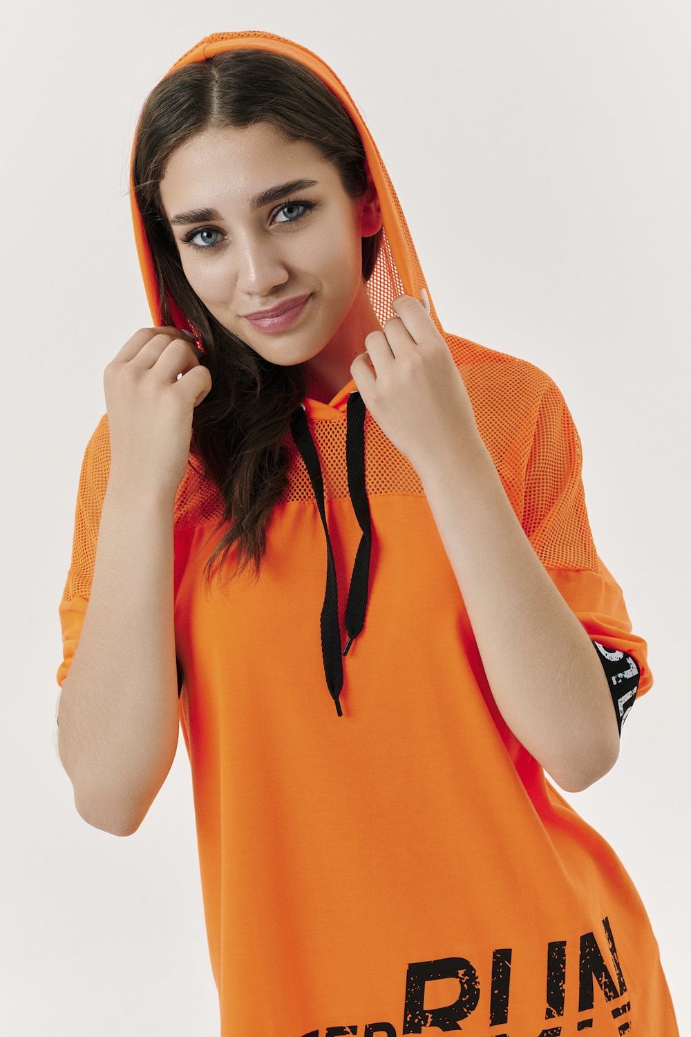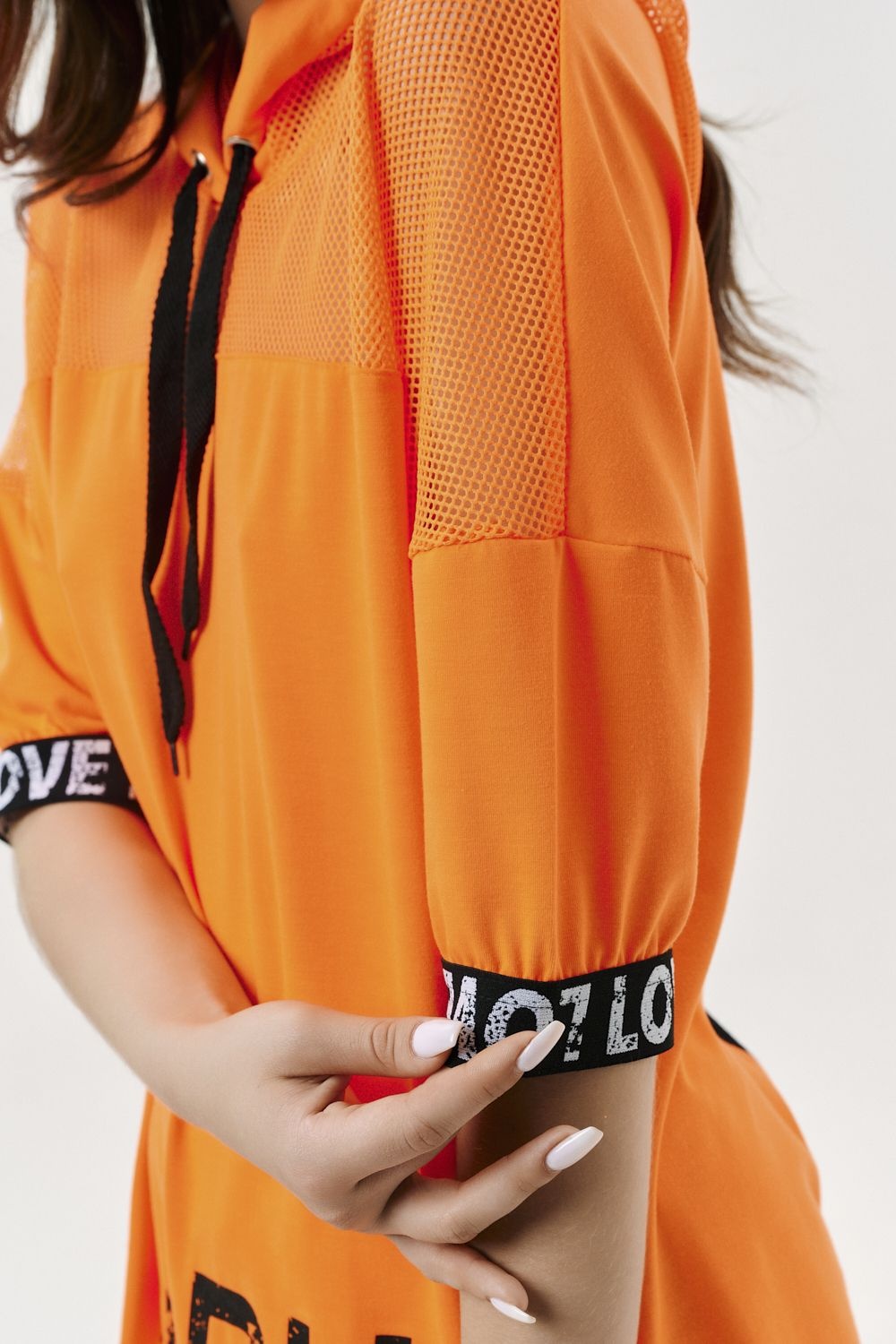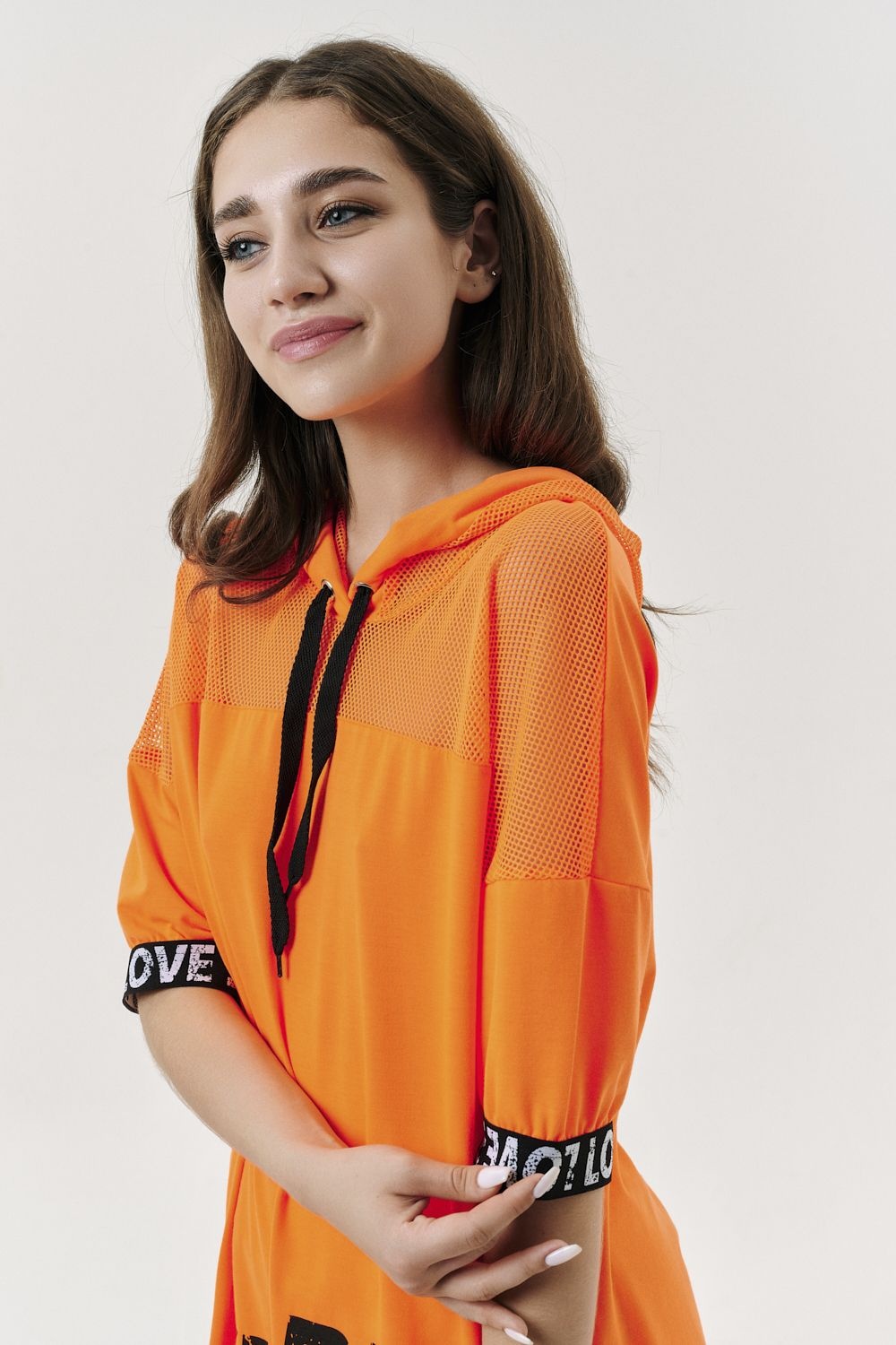 Костюм состоит из туники и брюк. Туника прямая, свободная, с капюшоном из сетки, с удлиненной спинкой. Рукав короткий, обработанный декоративной резинкой. Кокетка полочки выполнена из сетки. Вдоль центра спинки расположена декоративная вставка из отделочного полотна и сетки. Брюки свободные, длинные, с карманами, на эластичном поясе. Низ брюк обработан декоративной резинкой. Вдоль боковых швов расположен лампас из отделочного полотна и сетки. В средней части лампаса расположен карман.