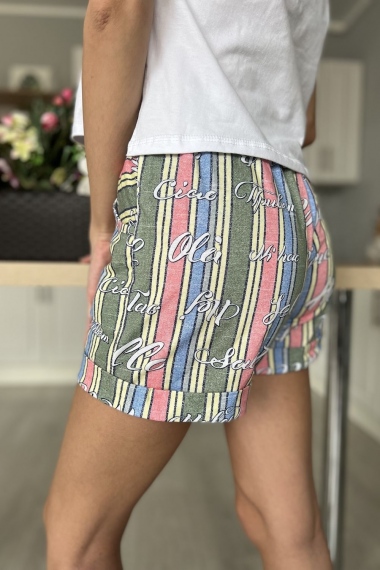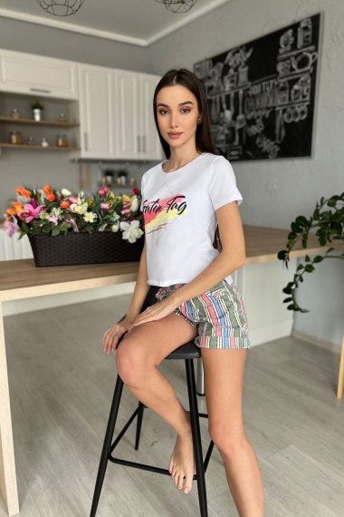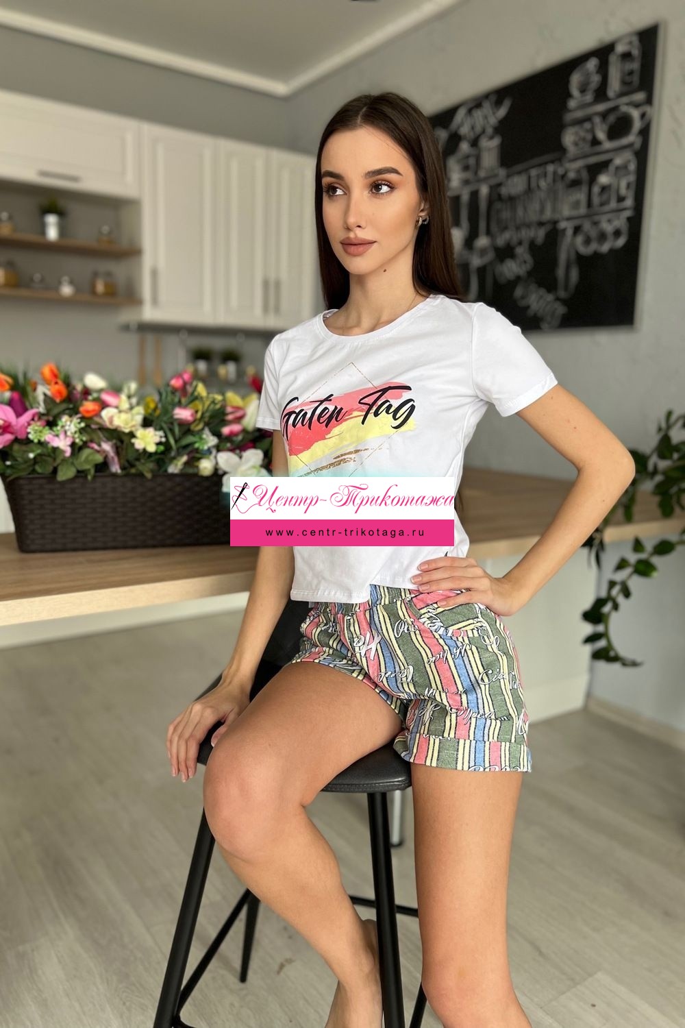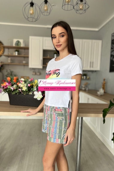 Костюм состоит из футболки и шорт. Футболка прямого силуэта, с удлиненной спинкой, с округлой горловиной. Рукав втачной, короткий. В нижней части боковых швов обработаны разрезы. Горловина обработана обтачкой из основного полотна. Шорты прямые, на поясе, с карманами, с манжетом по низу.