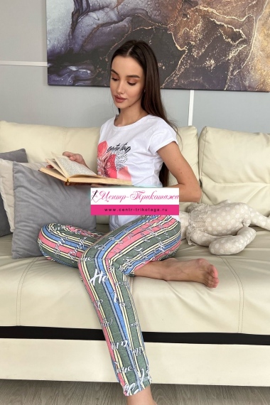 Комплект состоит из футболки и брюк. Брюки свободные, длинные, с карманами, на эластичном поясе, с резинкой по низу. Футболка полуприлегающего силуэта, с округлой горловиной, длиной до середины бедра. Рукав втачной короткий. В верхней части спинки обработан декоративный вырез. Горловина, низ рукавов и вырез на спинке обработаны бейкой из основного полотна с отделочным кантом.