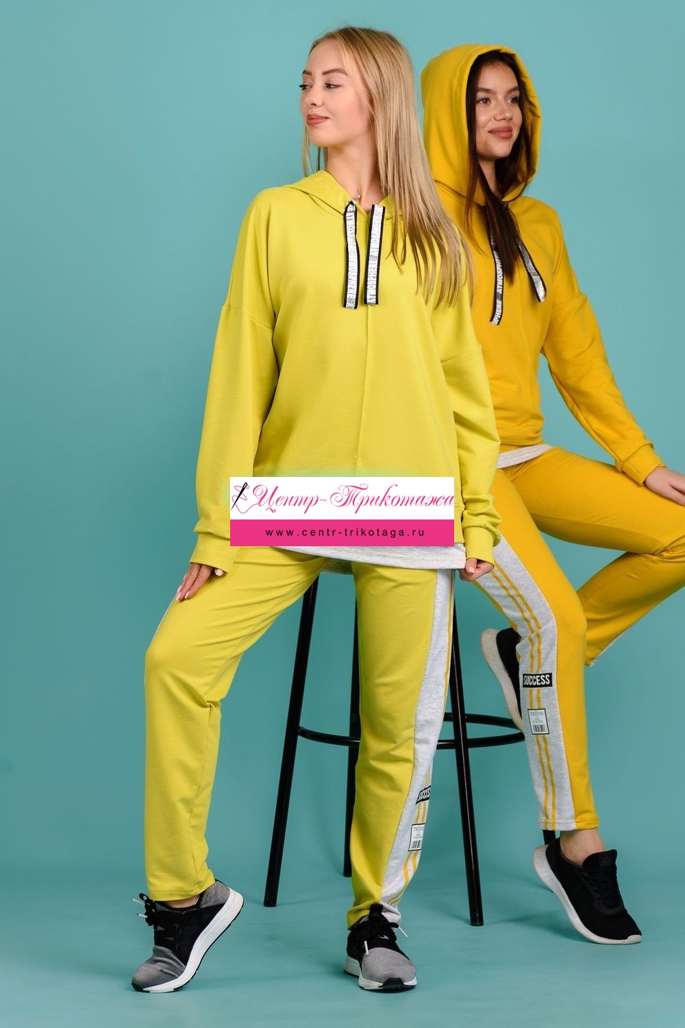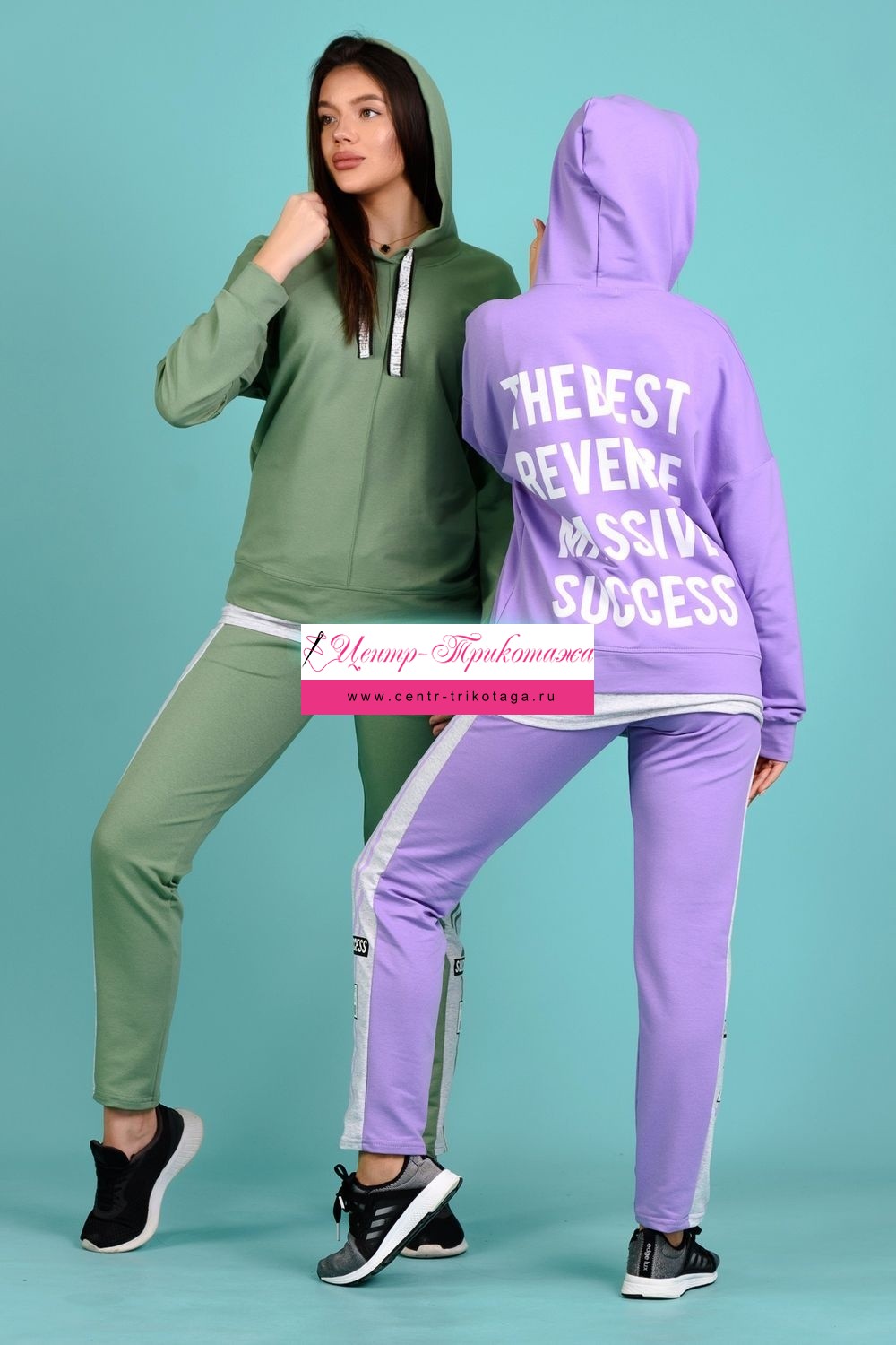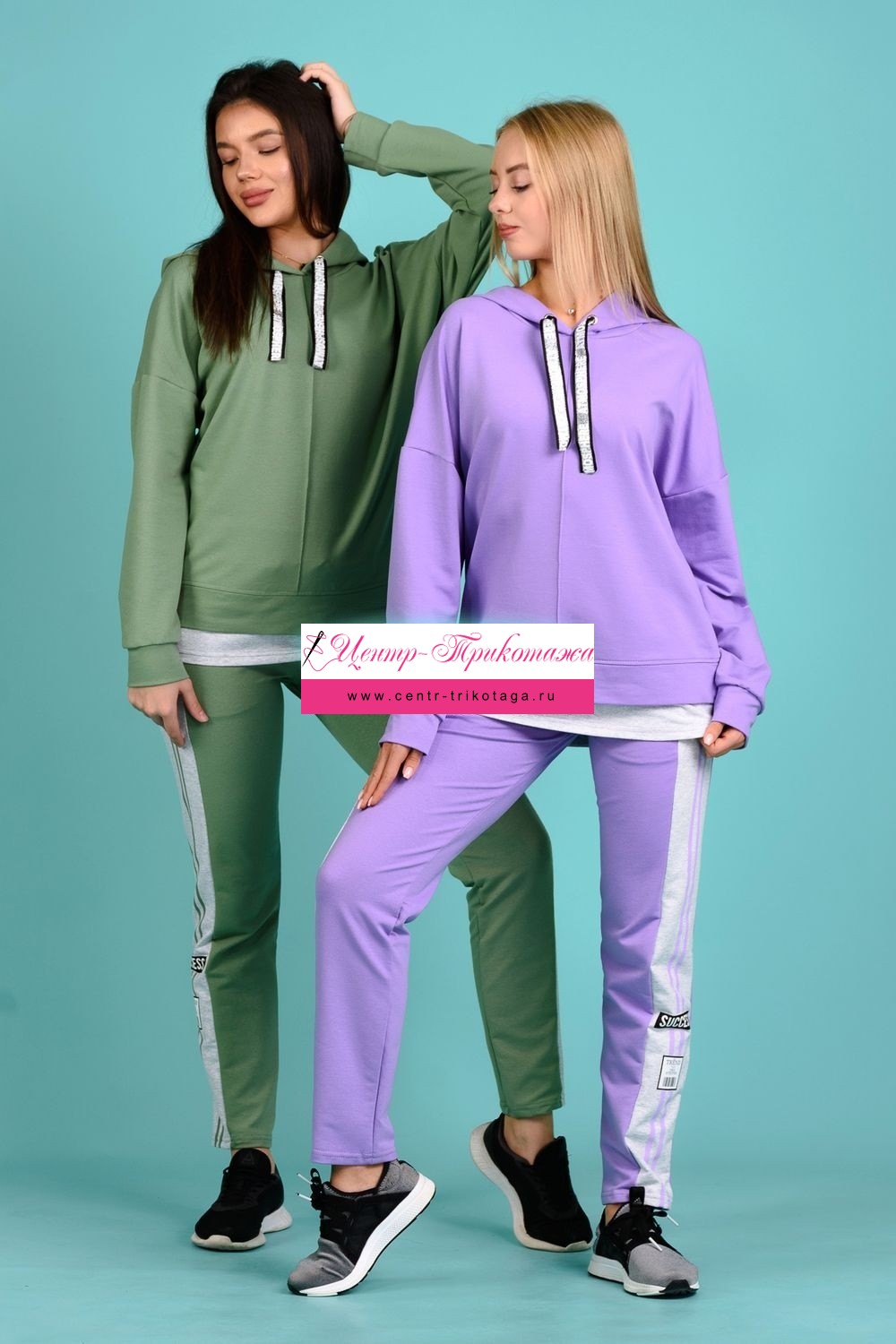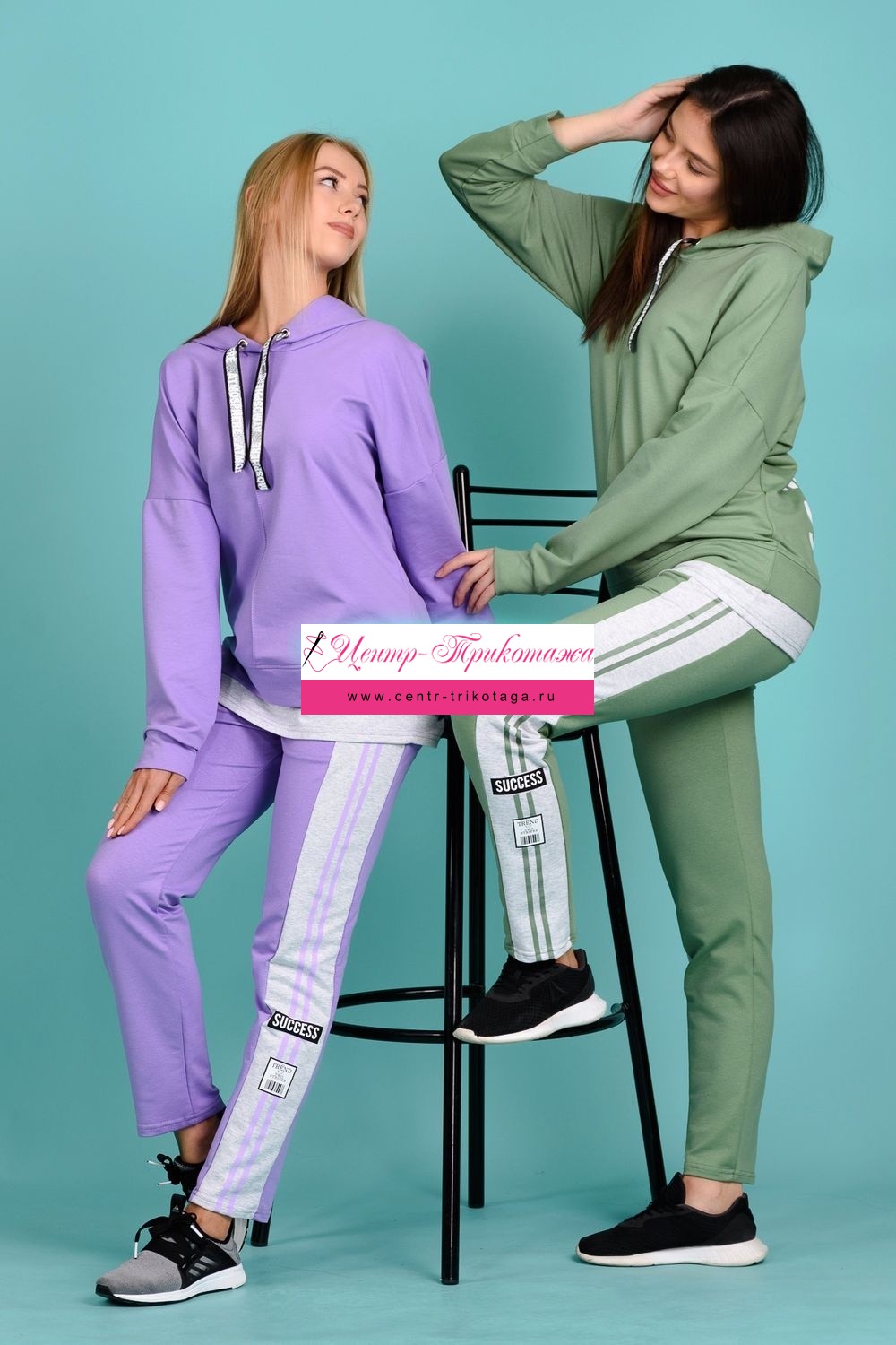 Костюм состоит из толстовки и брюк. Толстовка прямая, свободная, с капюшоном, с длинным рукавом на манжете. Низ полочки и спинки завершен поясом. Брюки с карманами, на поясе. Вдоль боковых швов расположены лампасы из отделочного полотна.