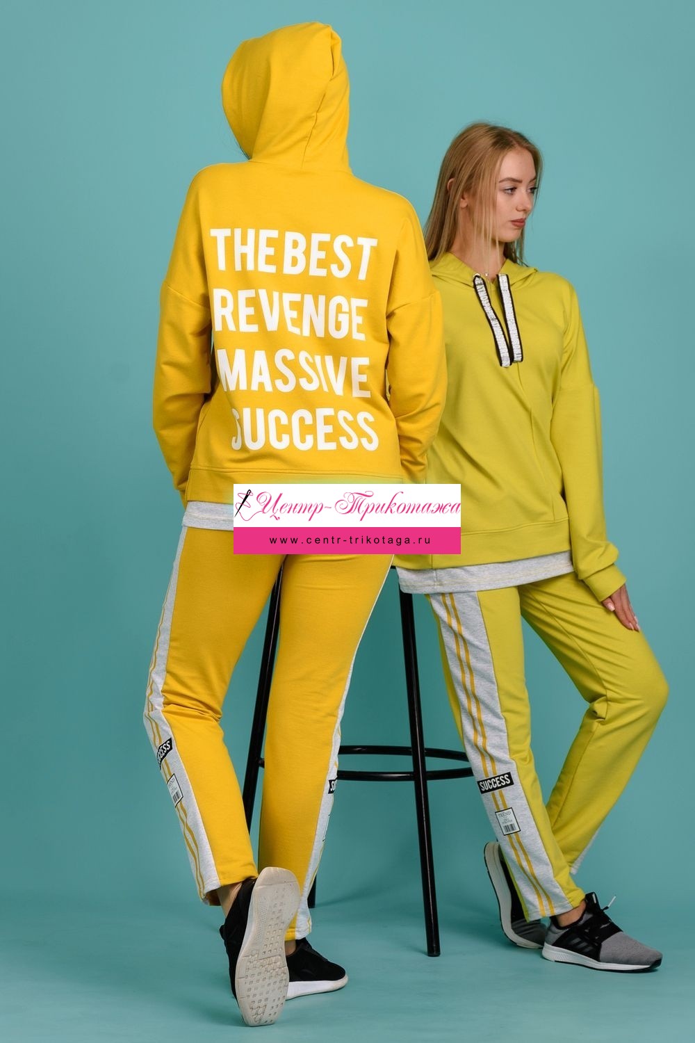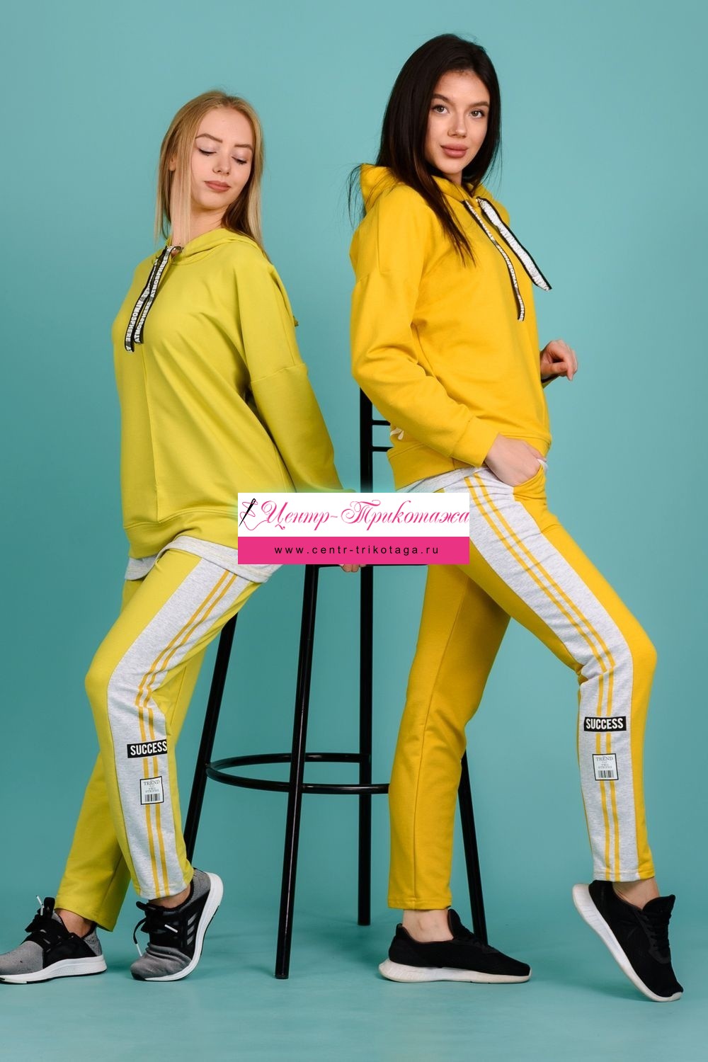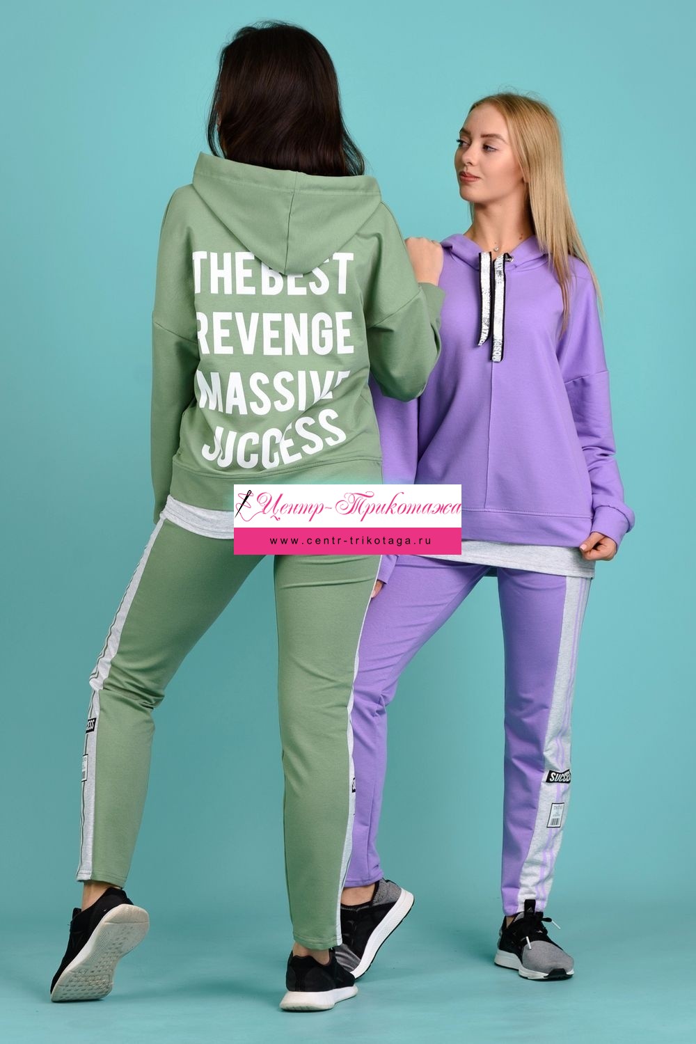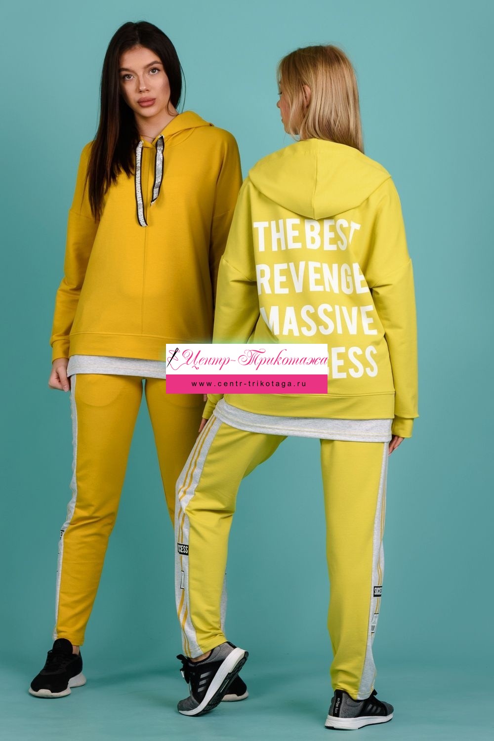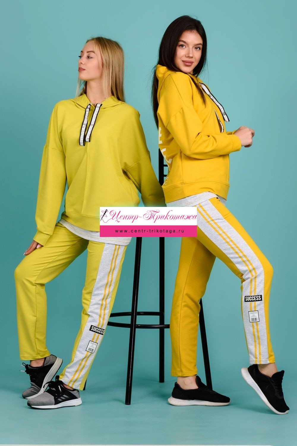 Костюм состоит из толстовки и брюк. Толстовка прямая, свободная, с капюшоном, с длинным рукавом на манжете. Низ полочки и спинки завершен поясом. Брюки с карманами, на поясе. Вдоль боковых швов расположены лампасы из отделочного полотна.
