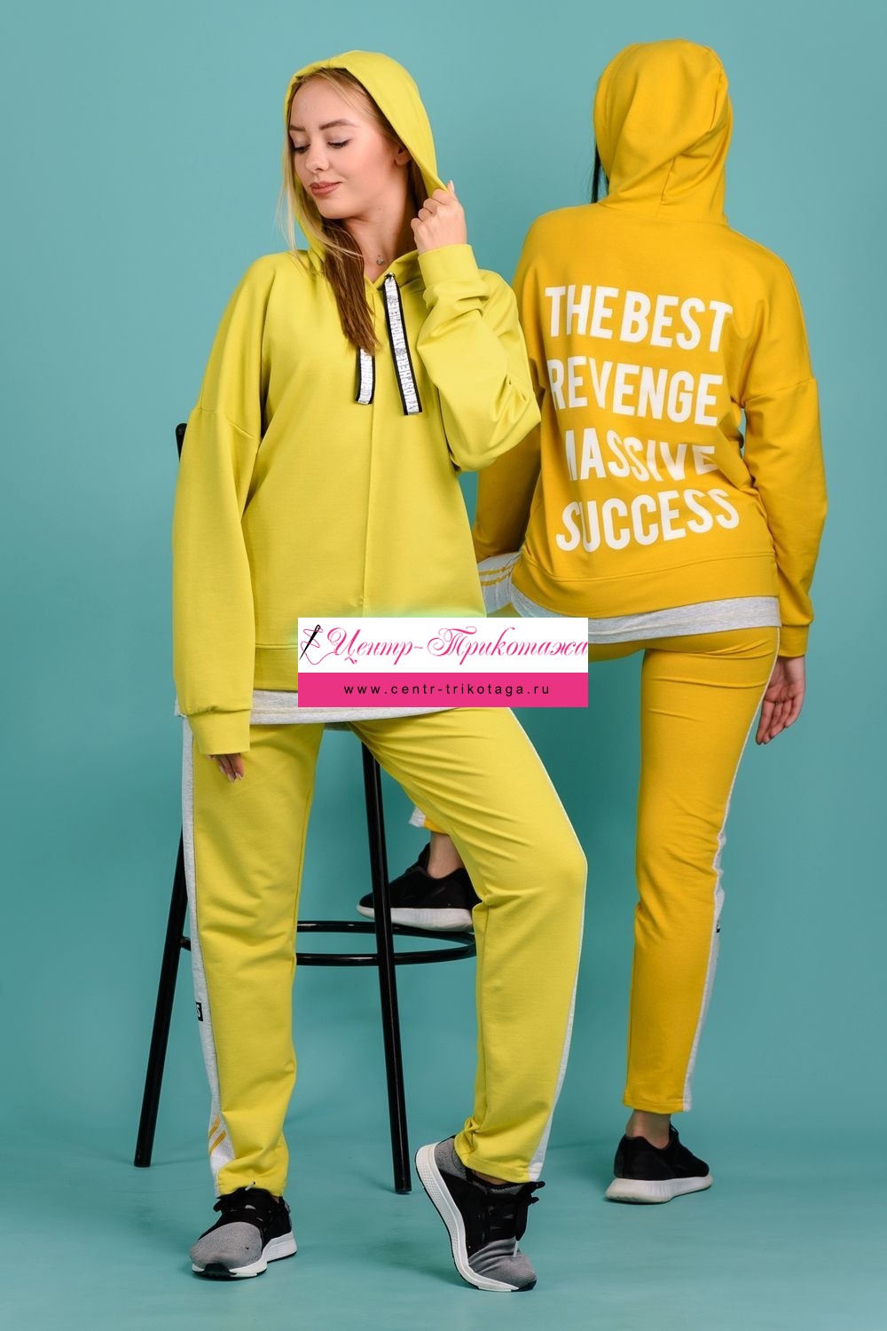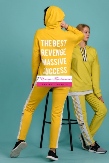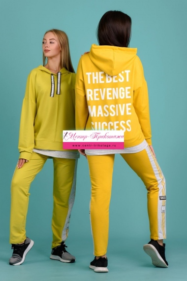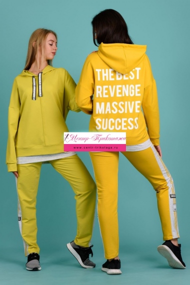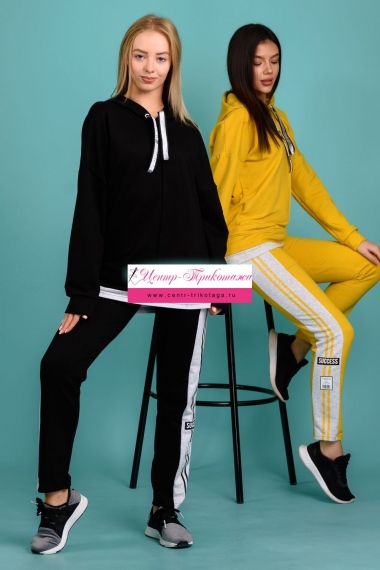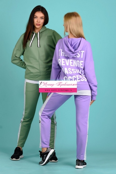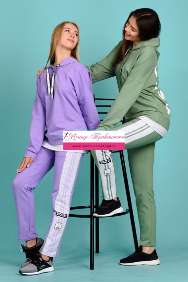 Костюм состоит из толстовки и брюк. Толстовка прямая, свободная, с капюшоном, с длинным рукавом на манжете. Низ полочки и спинки завершен поясом. Брюки с карманами, на поясе. Вдоль боковых швов расположены лампасы из отделочного полотна.