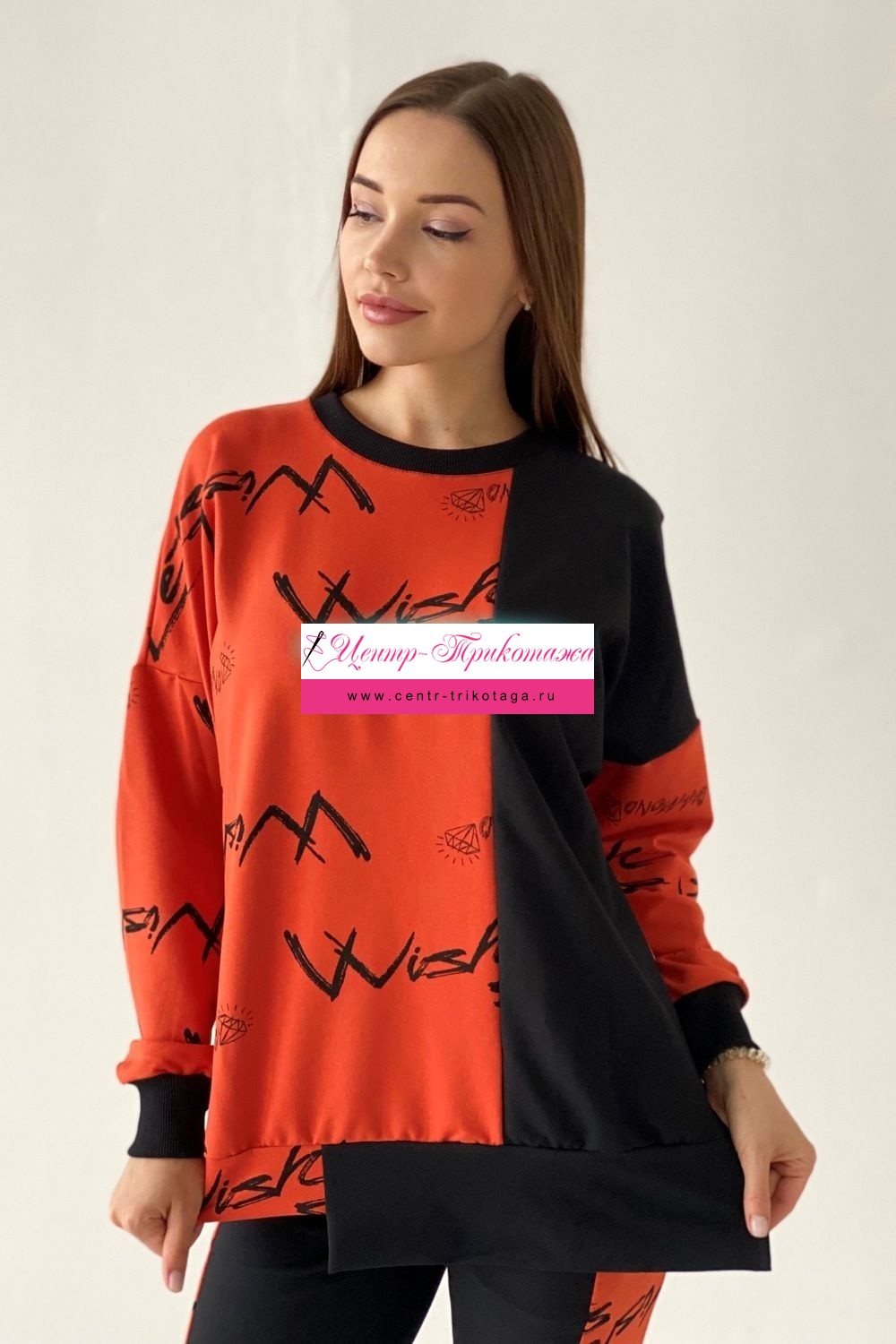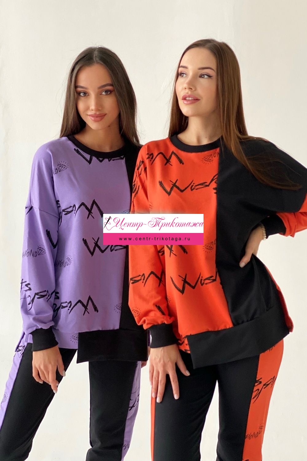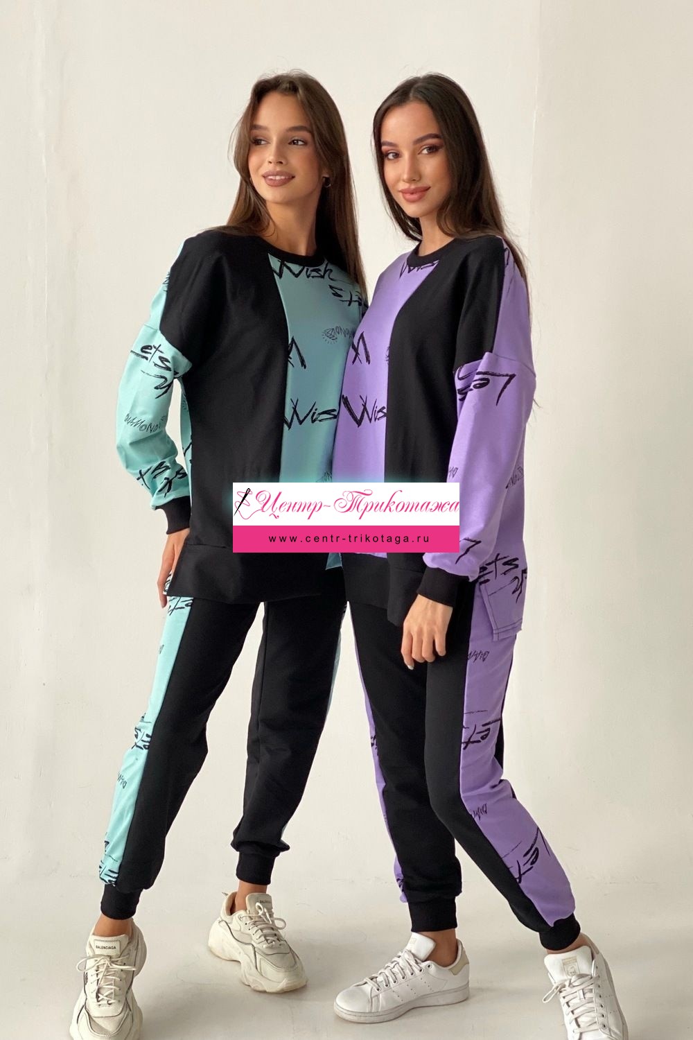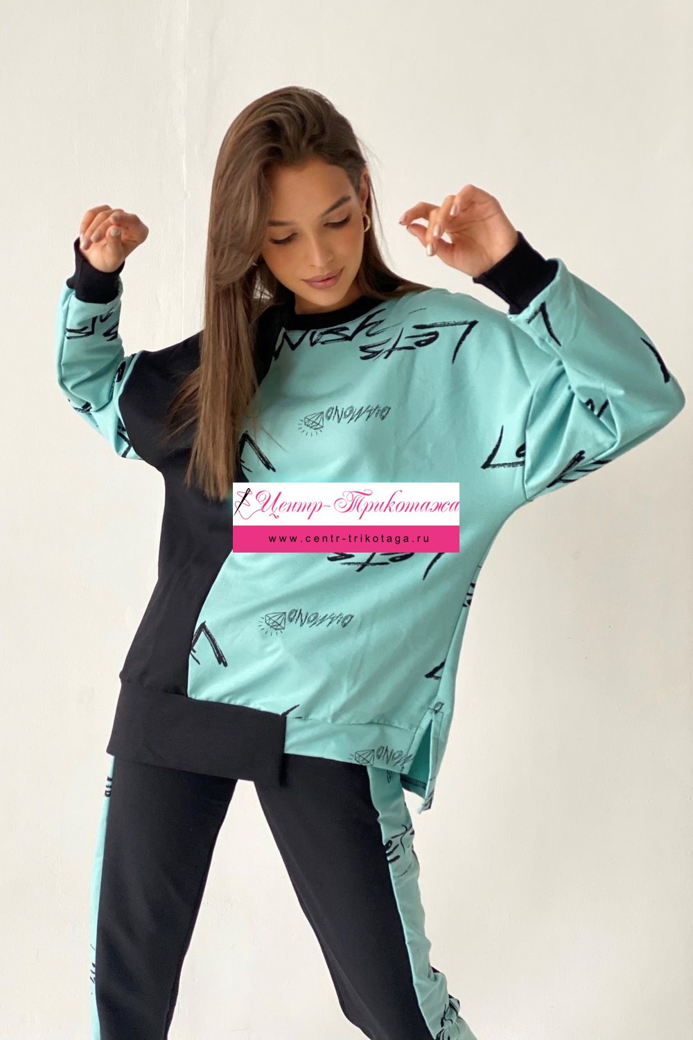 Комплект состоит из свитшота и брюк. Брюки полуприлегающие, на эластичном поясе, с карманами, на эластичном манжете по низу. Вдоль боковых швов расположен лампас из отделочного полотна. Свитшот свободный, с фигурным низом спереди. В нижней части боковых швов обработаны разрезы. Рукав длинный, на эластичном манжете. Горловина округлая, обработана эластичной обтачкой.