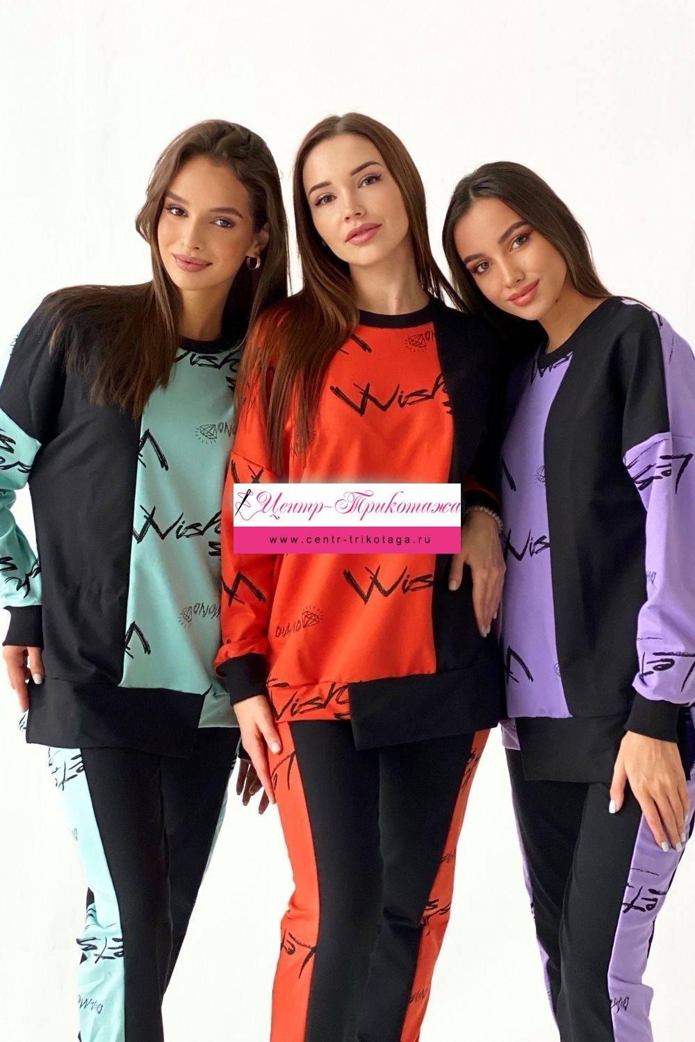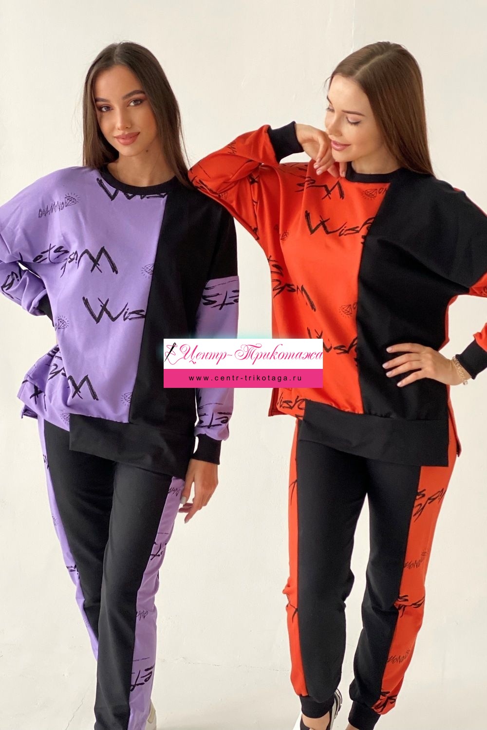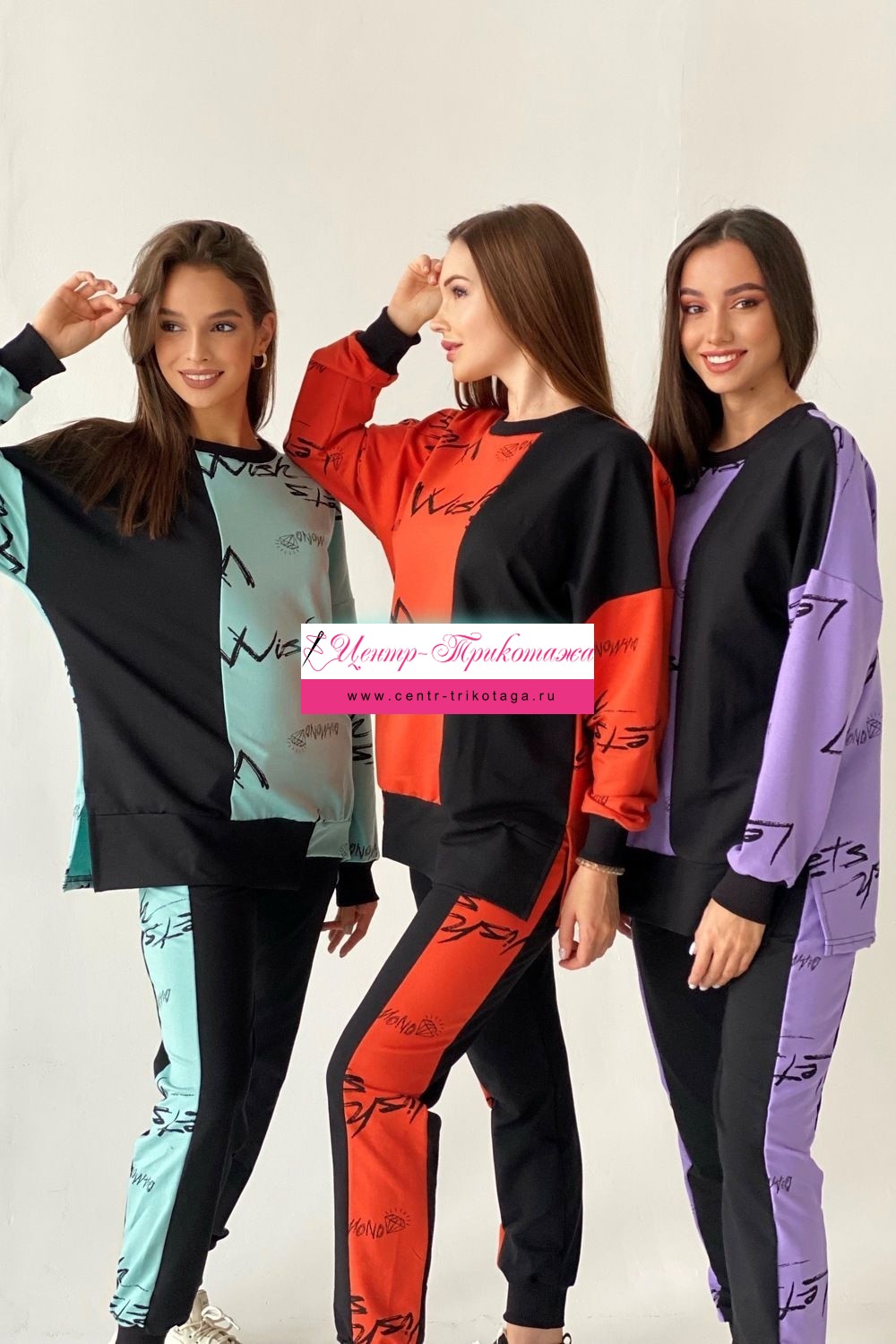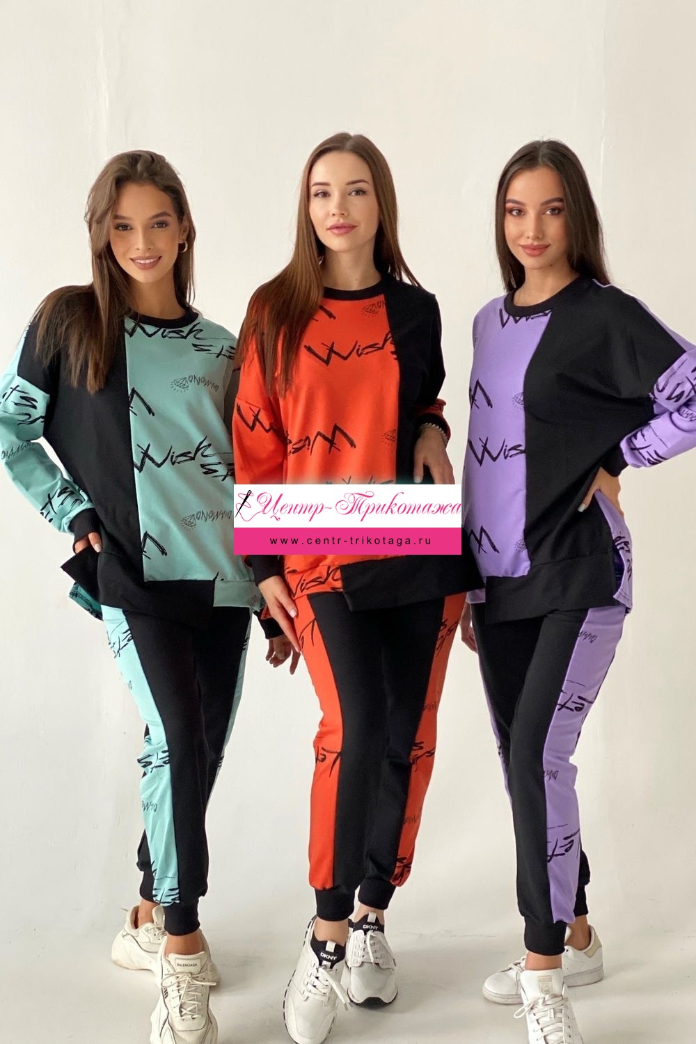 Комплект состоит из свитшота и брюк. Брюки полуприлегающие, на эластичном поясе, с карманами, на эластичном манжете по низу. Вдоль боковых швов расположен лампас из отделочного полотна. Свитшот свободный, с фигурным низом спереди. В нижней части боковых швов обработаны разрезы. Рукав длинный, на эластичном манжете. Горловина округлая, обработана эластичной обтачкой.