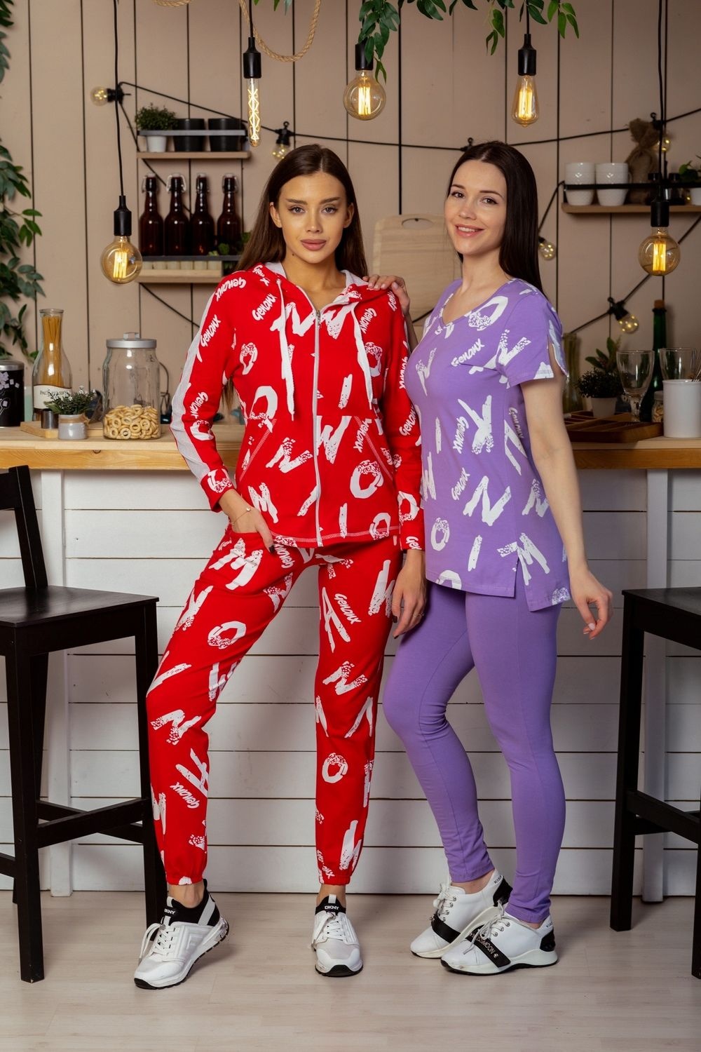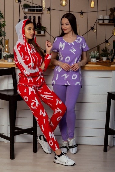Костюм состоит из толстовки и брюк. Брюки на поясе, с боковыми карманами, на резинке по низу. Толстовка прямая, на молнии, с капюшоном из сетки, с карманами кенгуру , длиной до середины бедра. Рукав реглан, длинный, с лампасами из сетки вдоль рукава, на манжете.