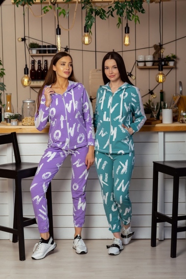 Костюм состоит из толстовки и брюк. Брюки на поясе, с боковыми карманами, на резинке по низу. Толстовка прямая, на молнии, с капюшоном из сетки, с карманами кенгуру , длиной до середины бедра. Рукав реглан, длинный, с лампасами из сетки вдоль рукава, на манжете.