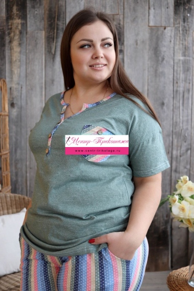 Костюм женский: туника и бриджи. Туника полуприлегающего силуэта с фигурным Y-образным вырезом. Рукав короткий цельнокроенный со швом. На полочке нагрудный карман с пуговицей, из отделочной ткани в полоску. В боковых швах туники и бриджей небольшие разрезы. Бриджи из ткани в полоску, длина ниже колена, на передних частях внутренние карманы, пояс обработан на многоигольной машине. На модели 52 размер