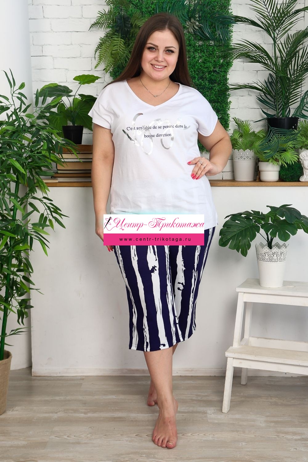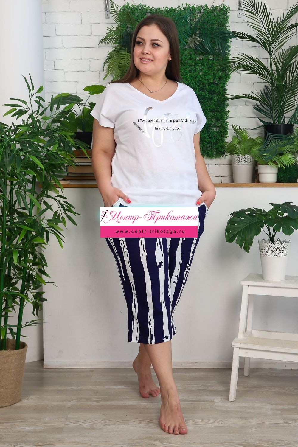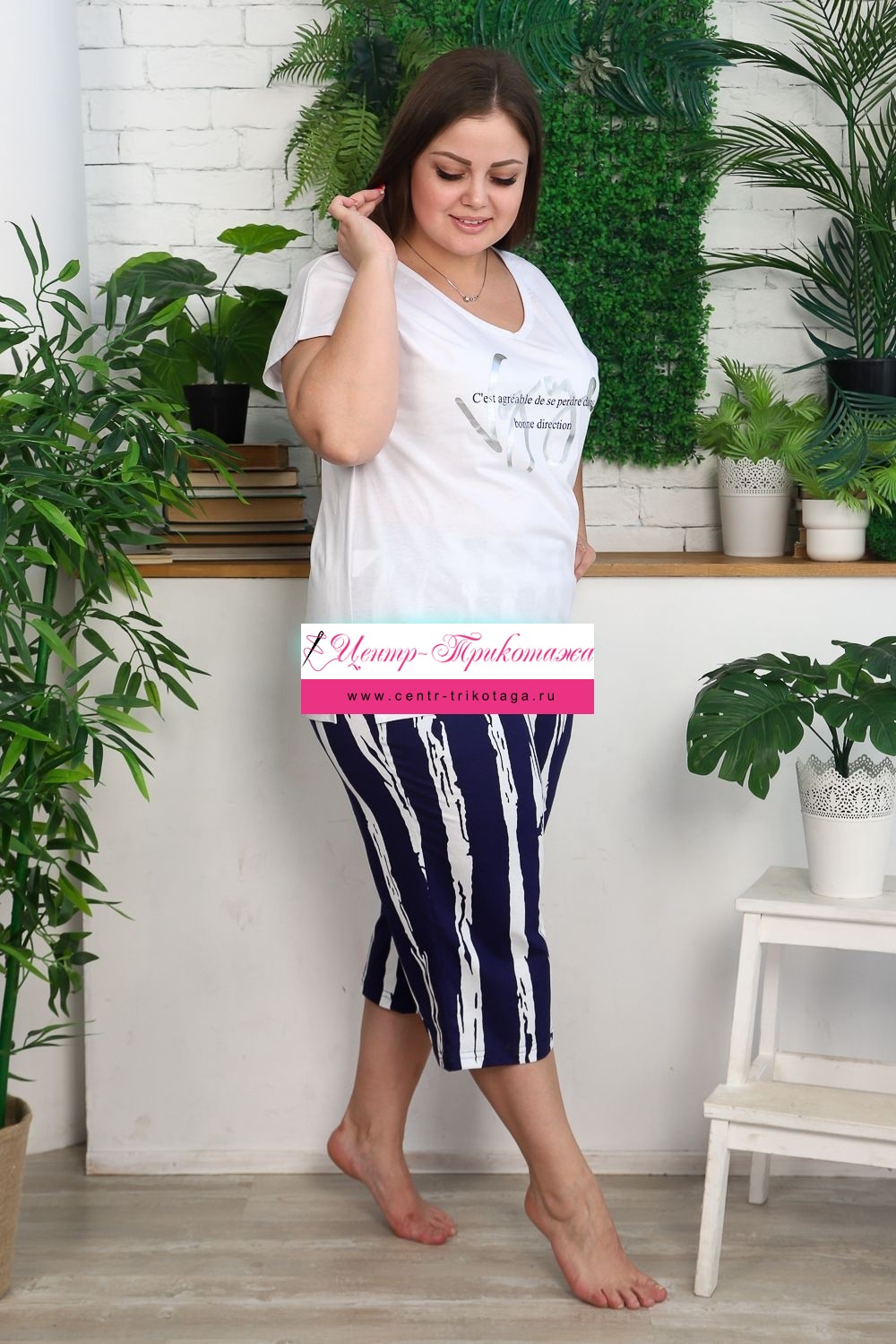 Костюм женский: футболка и бриджи. Футболка прямого силуэта, рукав цельнокроенный короткий, вырез V-образный, в боковом шве разрезы. На полочке модный принт. Бриджи полуприлегающие, длина ниже колена, с хорошей прибавкой на свободу движений. На передней части брюк внутренние карманы. На модели 52 размер. На фото майка из той же коллекции 9126