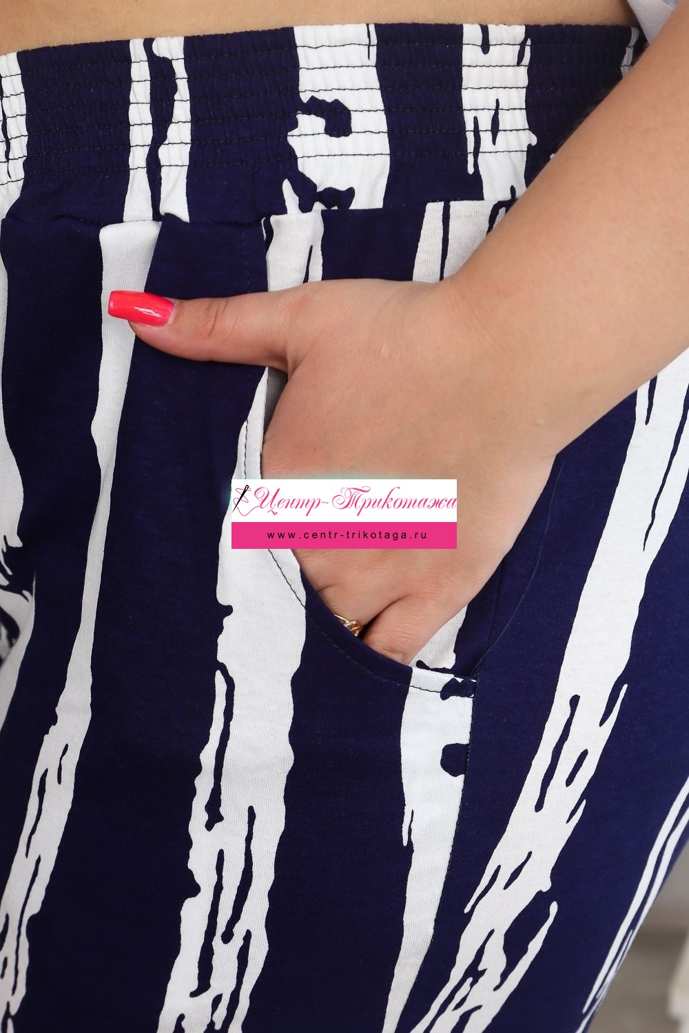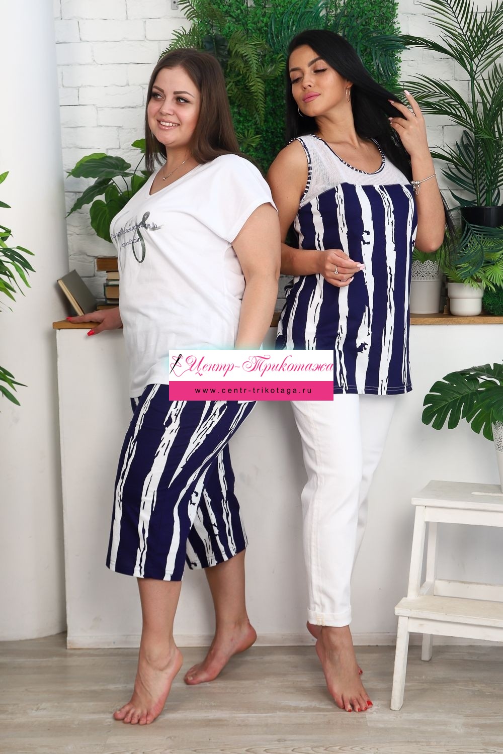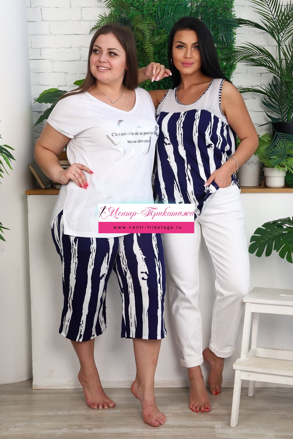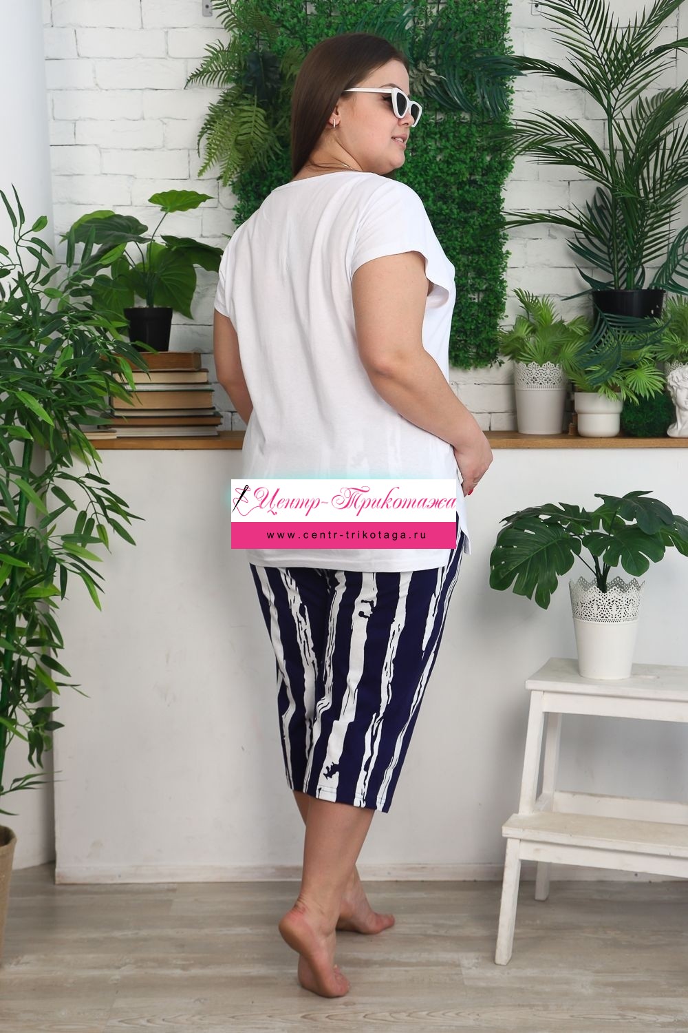 Костюм женский: футболка и бриджи. Футболка прямого силуэта, рукав цельнокроенный короткий, вырез V-образный, в боковом шве разрезы. На полочке модный принт. Бриджи полуприлегающие, длина ниже колена, с хорошей прибавкой на свободу движений. На передней части брюк внутренние карманы. На модели 52 размер. На фото майка из той же коллекции 9126