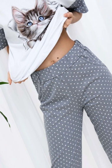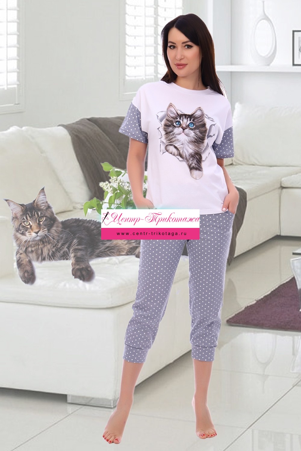 Домашний костюм с оригинальной печатью Мэйкун. Рукава и спинка футболки из ткани-компаньона. Бриджи на широком поясе с внутренними боковыми карманами. Футболка свободного кроя. Горловина обработана рибаной с лайкрой.