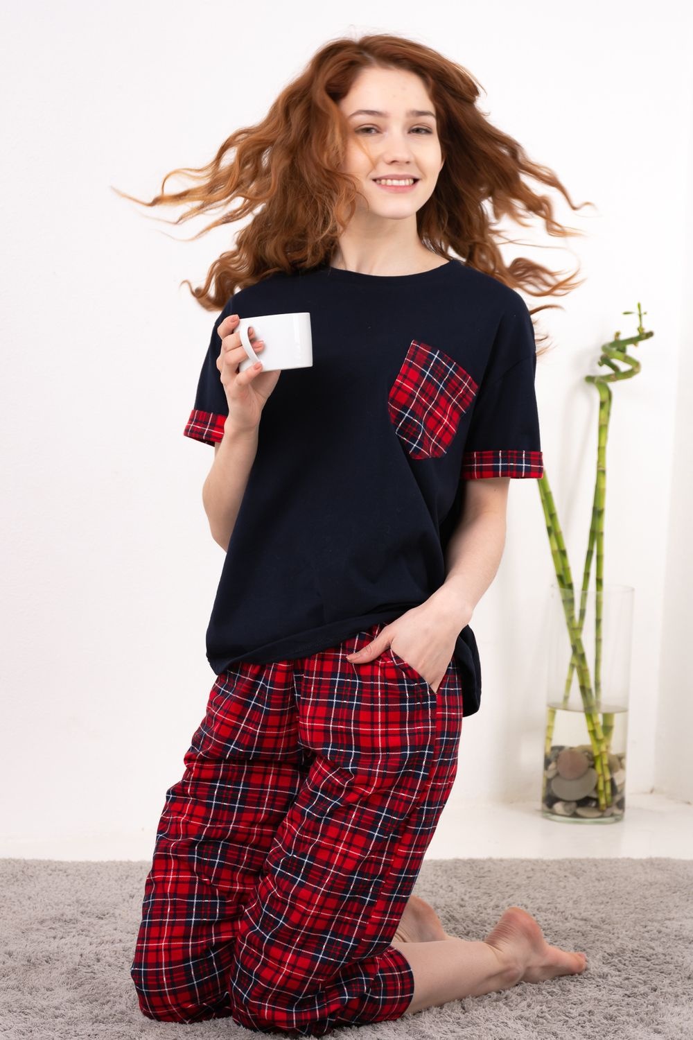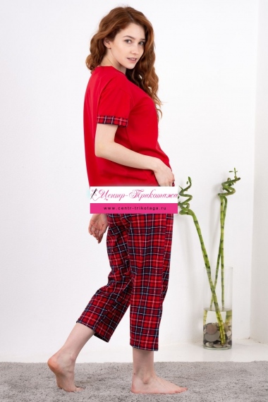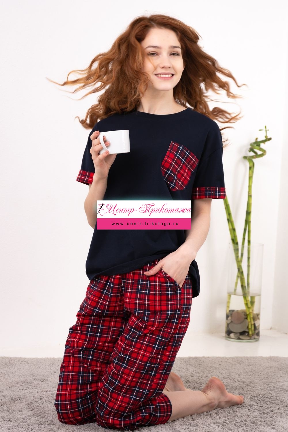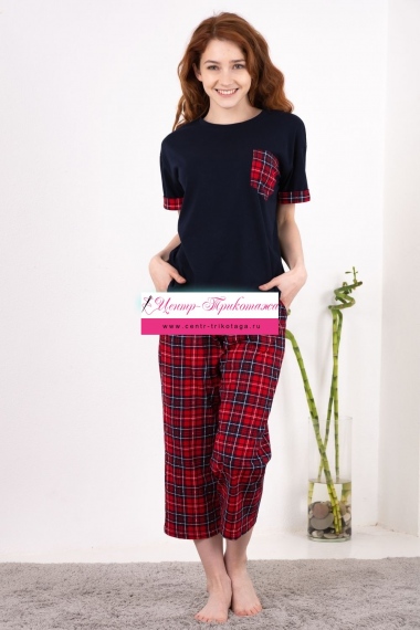 Отличный вариант для дачи, дома и летнего отдыха. Очень свободный крой. Футболка со спущенной линией плеча. На груди накладной карман, по низу рукавов манжеты. Свободные удлиненные бриджи, в боковых швах карманы.