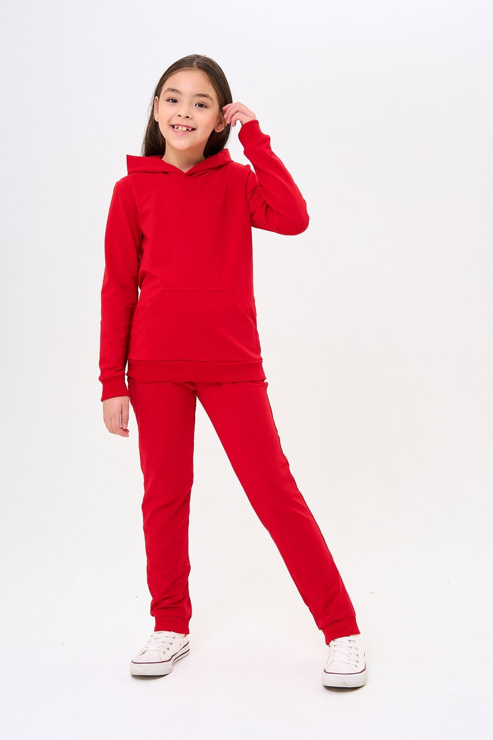 Костюм для девочек дошкольного и младшего школьного возраста. Костюм состоит из толстовки и штанов. Костюм из трикотажного эластичного хлопкового однотонного полотна футер. Толстовка с капюшоном, с длинным рукавом на манжете и поясе из основного полотна. На переде толстовки расположен карман-кенгуру. Штаны с боковыми карманами, на манжетах и поясе из основного полотна.