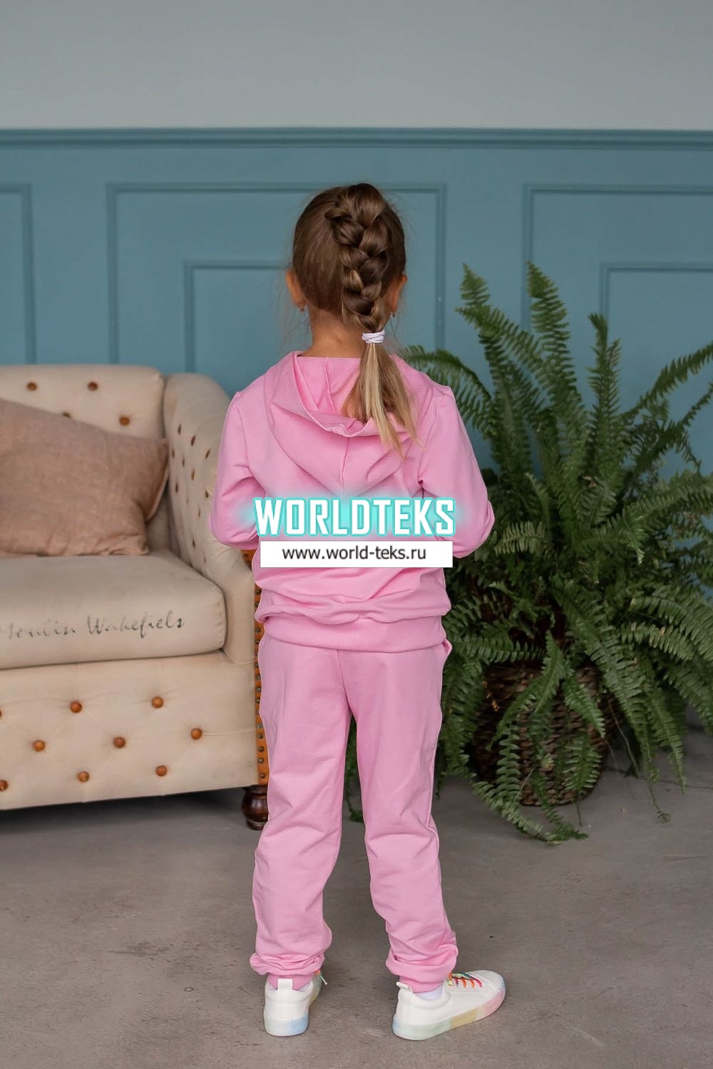 Костюм для девочек дошкольного и младшего школьного возраста. Костюм состоит из толстовки и штанов. Костюм из трикотажного эластичного хлопкового однотонного полотна футер. Толстовка с капюшоном, с длинным рукавом на манжете и поясе из основного полотна. На переде толстовки расположен карман-кенгуру. Штаны с боковыми карманами, на манжетах и поясе из основного полотна.