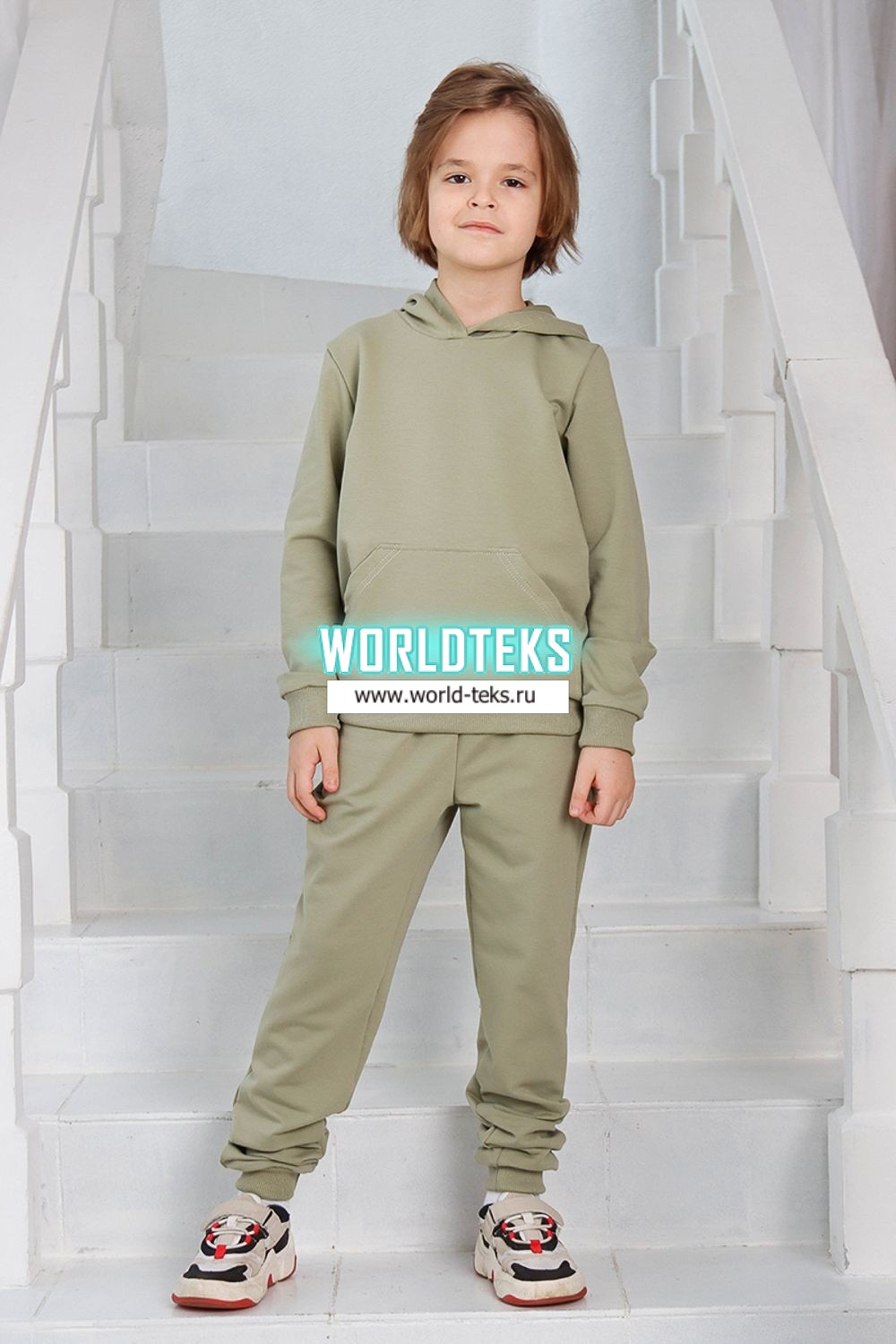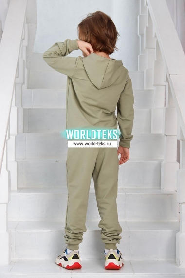 Костюм для девочек дошкольного и младшего школьного возраста. Костюм состоит из толстовки и штанов. Костюм из трикотажного эластичного хлопкового однотонного полотна футер . Толстовка с капюшоном, с длинным рукавом на манжете и поясе из основного полотна. На переде толстовки расположен карман-кенгуру. Штаны с боковыми карманами, на манжетах и поясе из основного полотна.