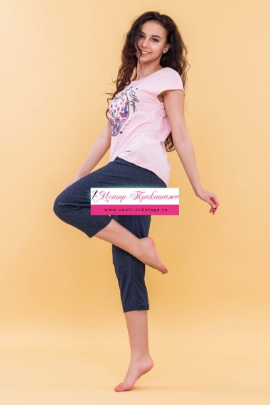 Костюм универсален: его можно носить дома, на любимой даче и как на дневной променад. Бриджи-капри заужены к низу, на поясе с широкой простроченной резинкой 3см. Свободный крой на уровне бёдер и живота, благодаря кокетке на поясе и складкам. Длина до середины икры. Благодаря хорошему составу 50% хб и 50% пэ бриджи не растянутся на коленях. Футболка оформлена полноцветной печатью, поэтому ягоды кажутся натуральными. Горловина-лодочка. Очень удобный крой. Оттенок ткани бриджей может отличаться от представленного на фото