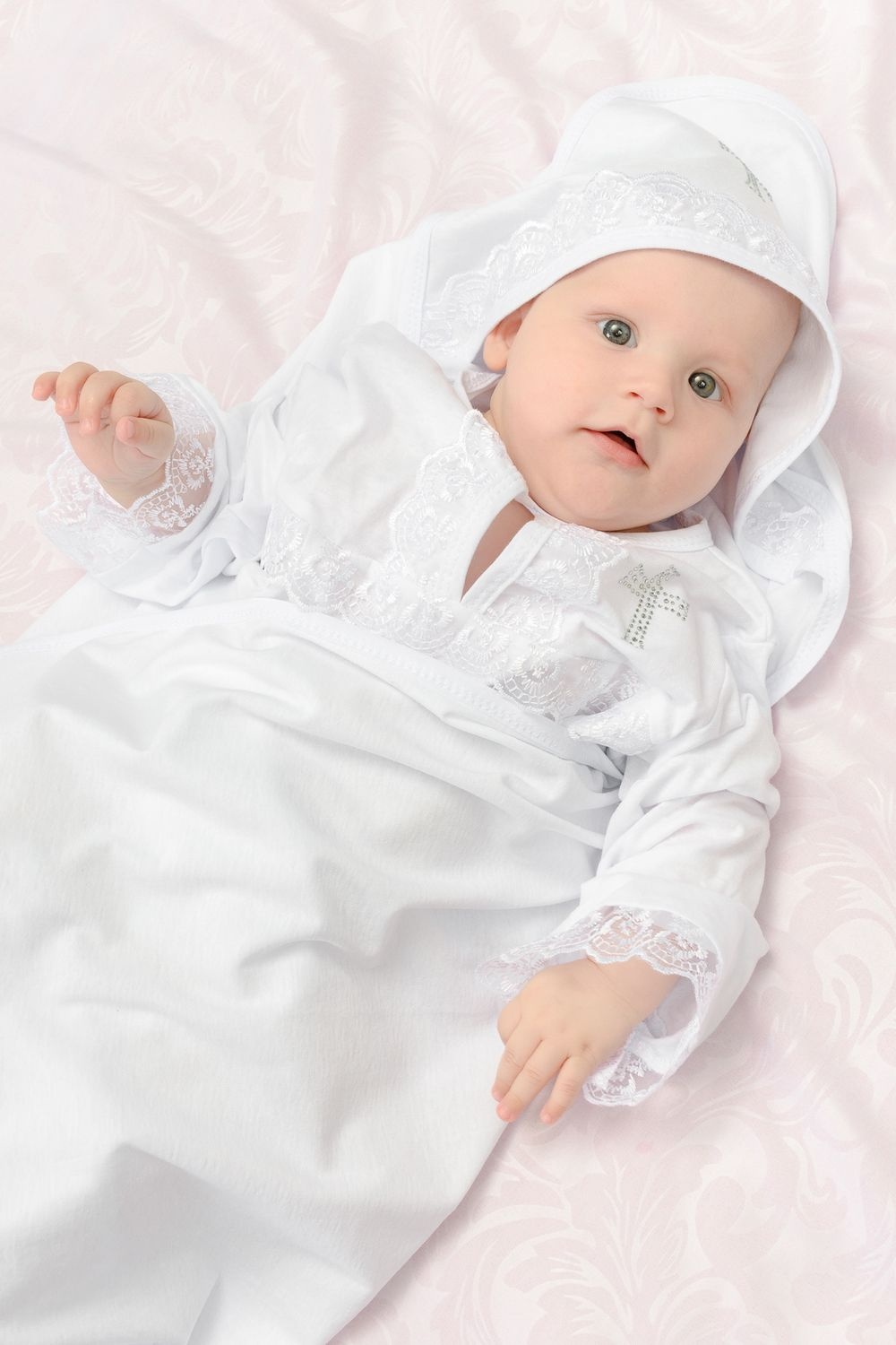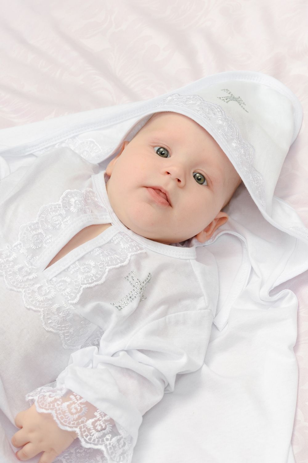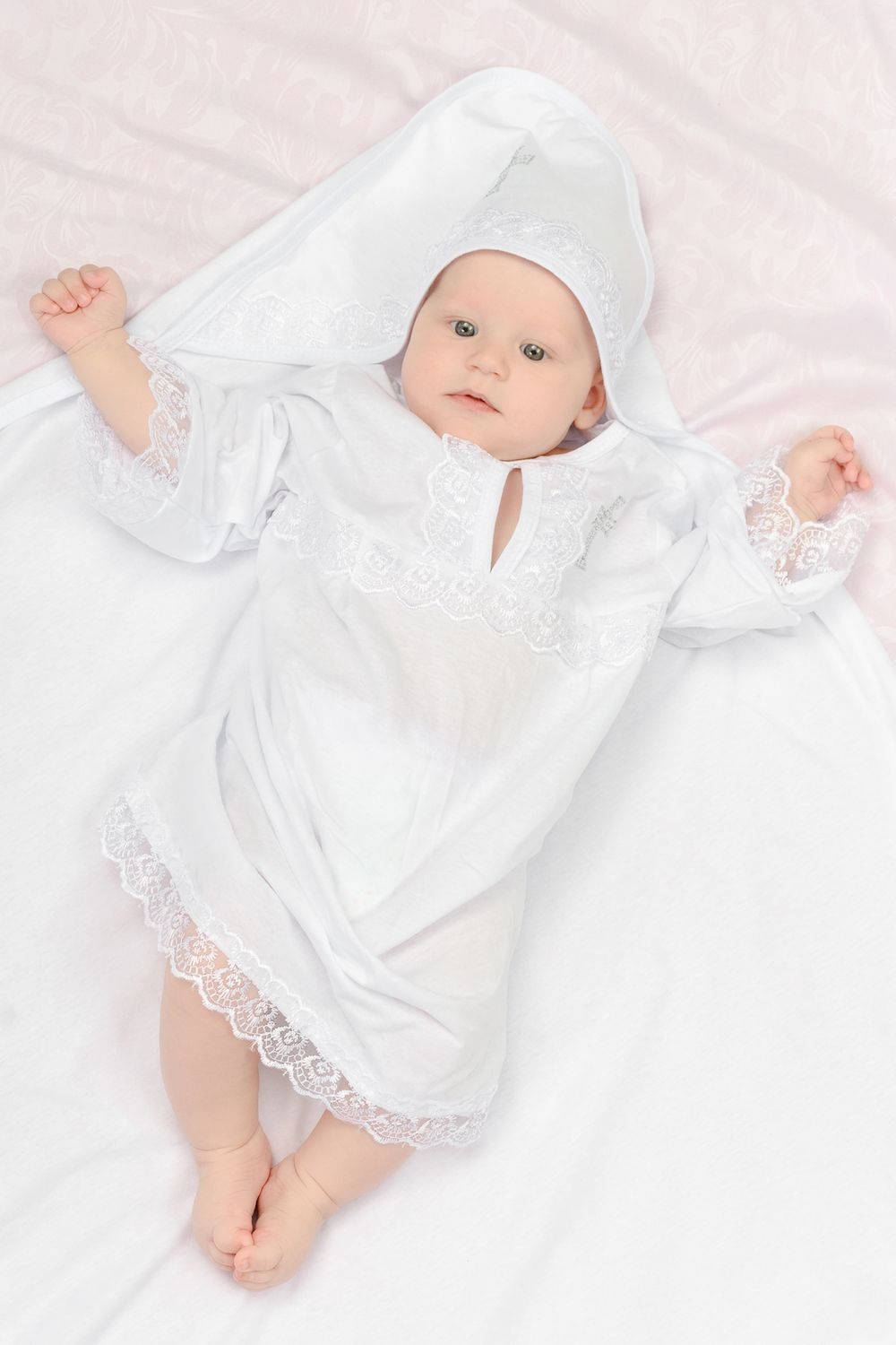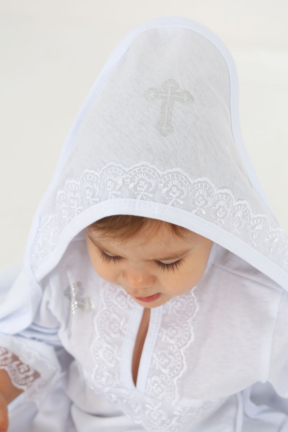 Набор предназначен для важного в жизни события - Крещение малыша. Крестильная рубашка это первое, во что одевают младенца после проведения обряда. Конструкция платья не стесняет движений, является просторной и лёгкой. Комплект для крещения выполнен в светлой цветовой гамме, имеет соответствующий тематический декор (православный крест). Необычайно красивый, мягкий комплект, с богатым кружевом! Воздушное крестильное платьице выглядит особенно торжественно, благодаря интересному крою. В набор входит два предмета: пеленка с капюшоном и платье из приятного, к коже, трикотажа. Пеленка подарит максимальный комфорт и обеспечит надежную защиту от сквозняка и прохлады. Размер пеленки 90Х90.