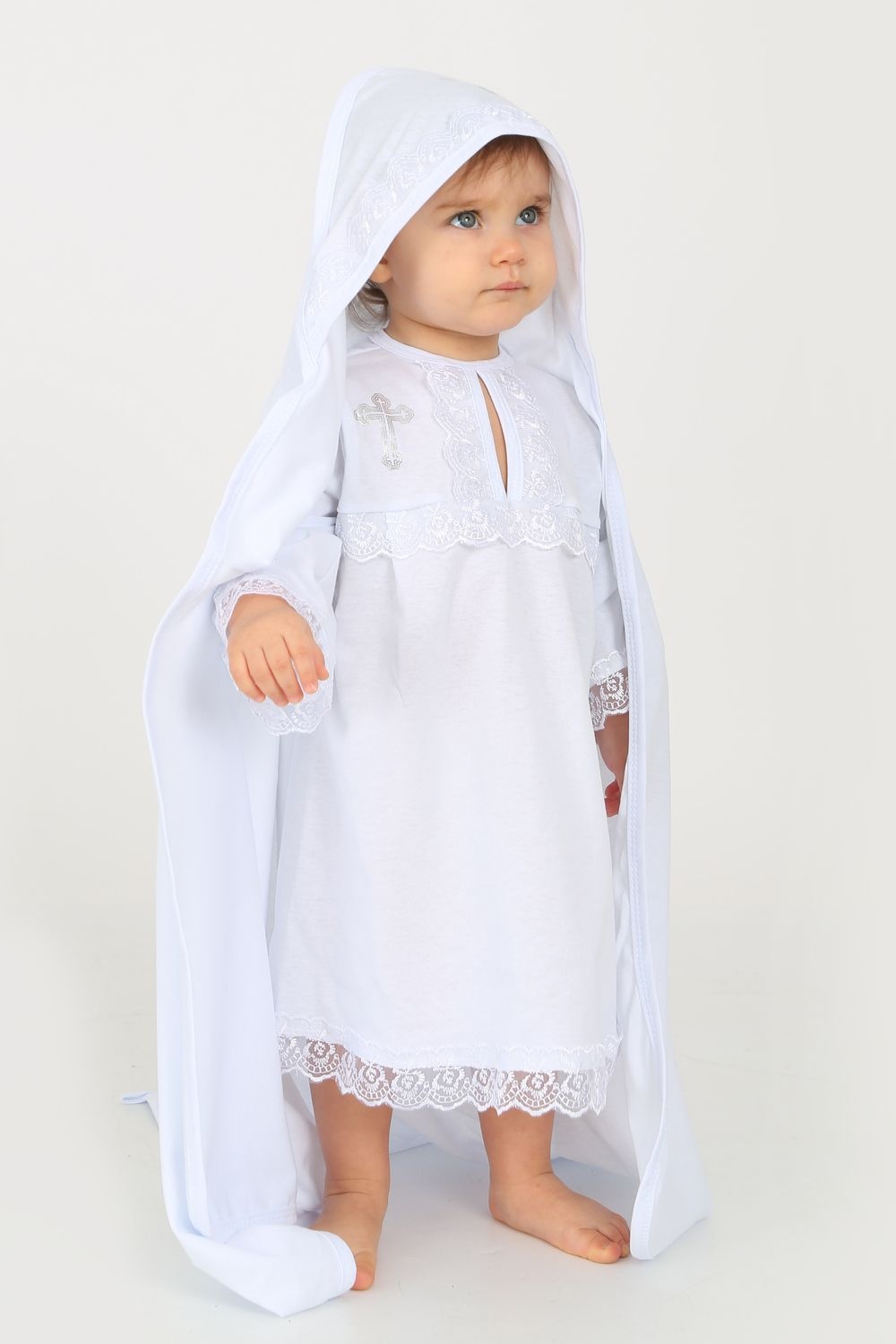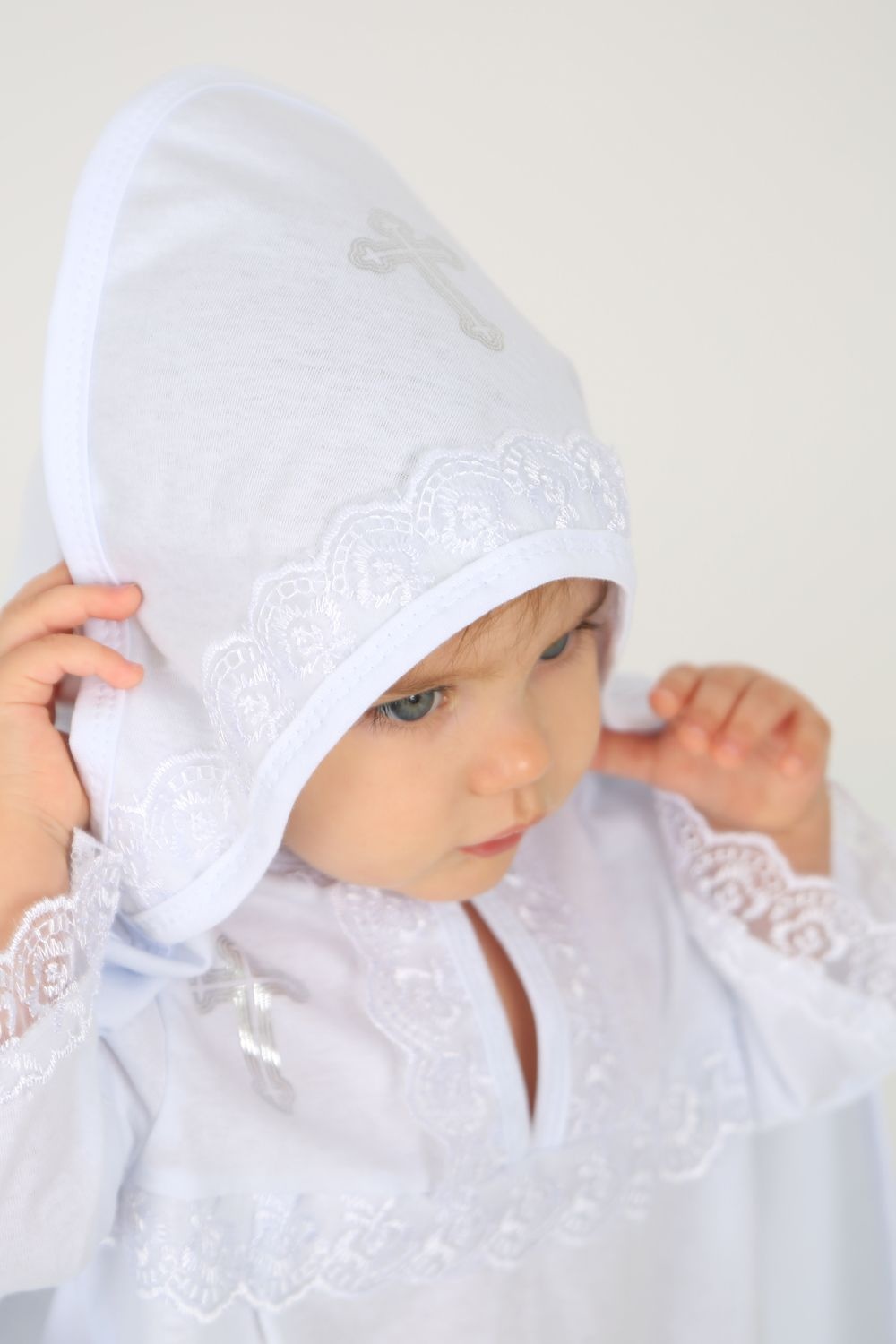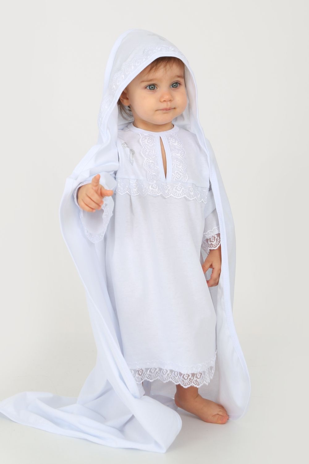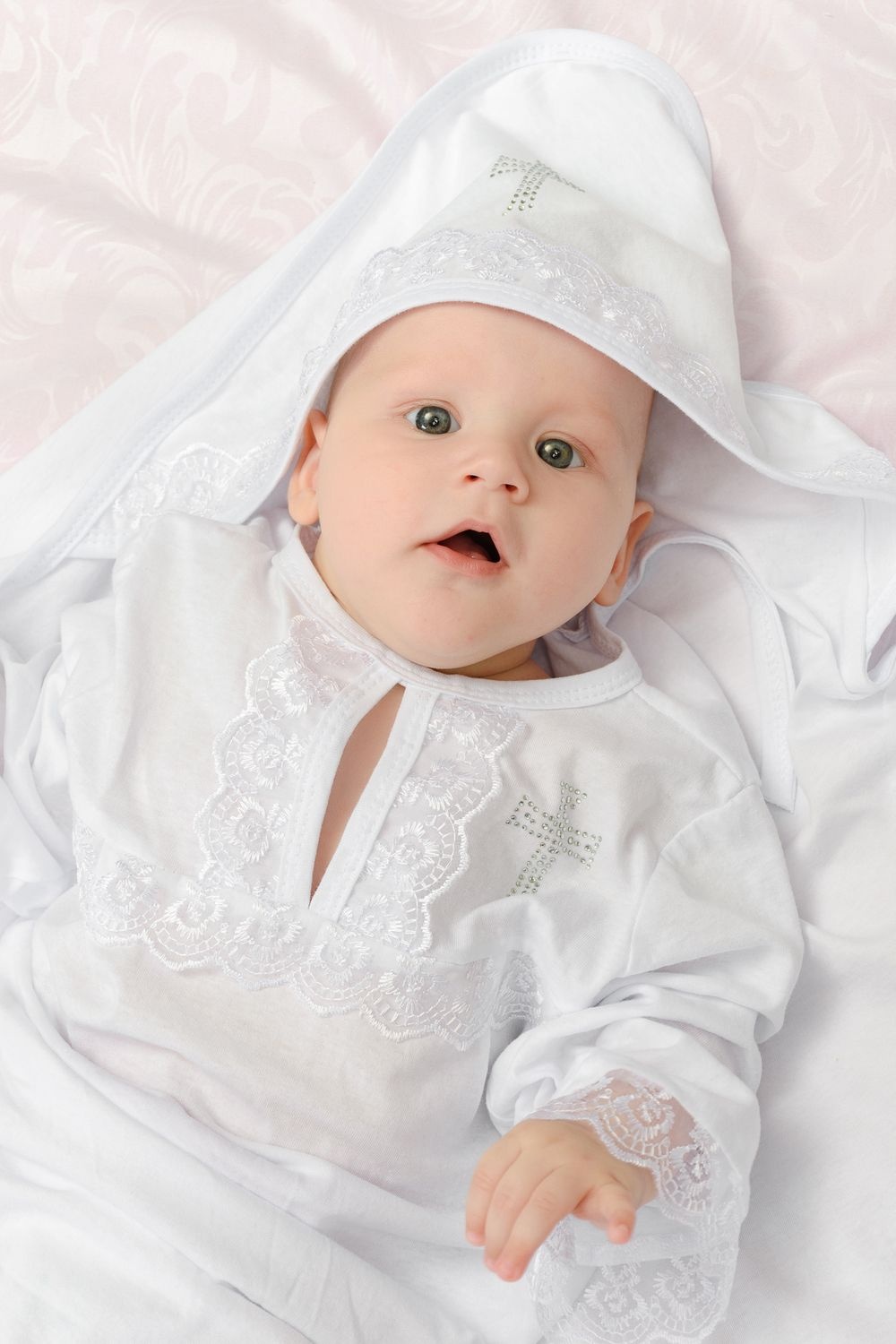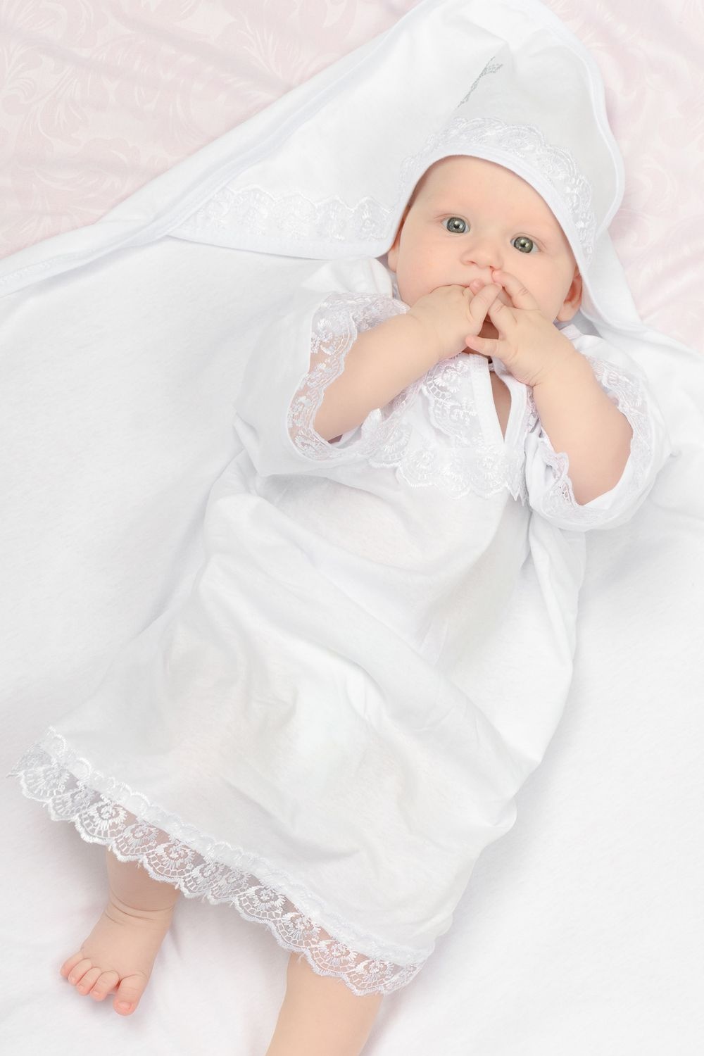 Набор предназначен для важного в жизни события - Крещение малыша. Крестильная рубашка это первое, во что одевают младенца после проведения обряда. Конструкция платья не стесняет движений, является просторной и лёгкой. Комплект для крещения выполнен в светлой цветовой гамме, имеет соответствующий тематический декор (православный крест). Необычайно красивый, мягкий комплект, с богатым кружевом! Воздушное крестильное платьице выглядит особенно торжественно, благодаря интересному крою. В набор входит два предмета: пеленка с капюшоном и платье из приятного, к коже, трикотажа. Пеленка подарит максимальный комфорт и обеспечит надежную защиту от сквозняка и прохлады. Размер пеленки 90Х90.