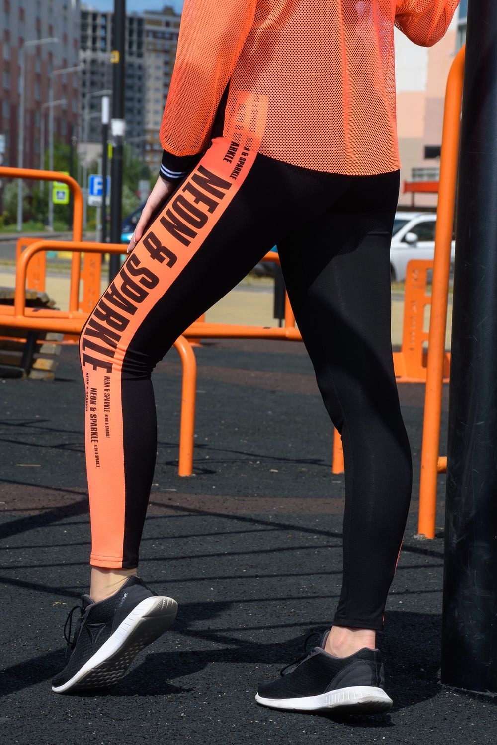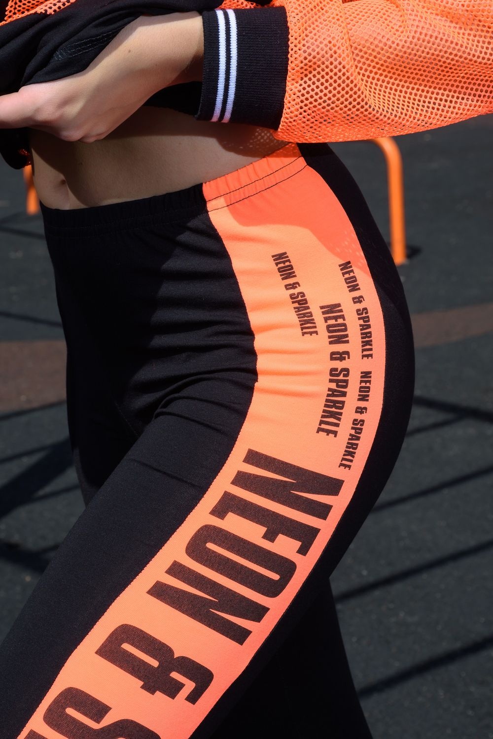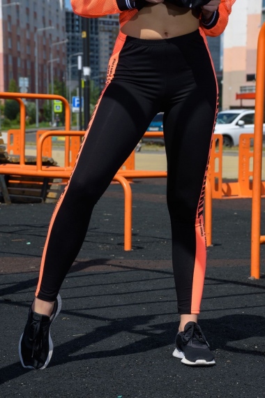 Лосины облегающие, длинные, сверху на резинке. Вдоль боковых швов расположен лампас из отделочного полотна.