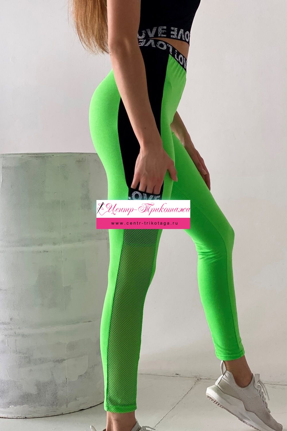 Лосины облегающие, длинные, сверху на декоративной резинке. Вдоль боковых швов расположен лампас из отделочного полотна и сетки. В средней части лампаса обработан карман.