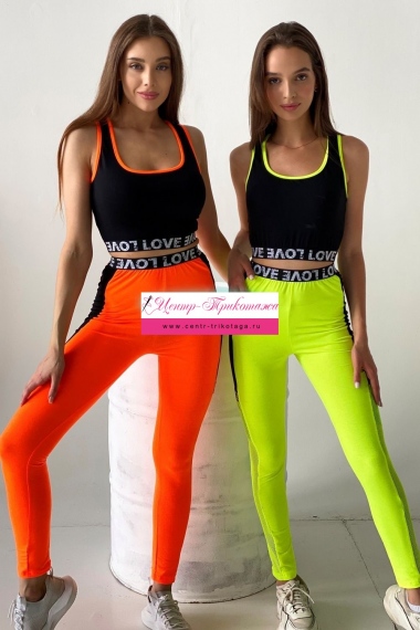 Лосины облегающие, длинные, сверху на декоративной резинке. Вдоль боковых швов расположен лампас из отделочного полотна и сетки. В средней части лампаса обработан карман.
